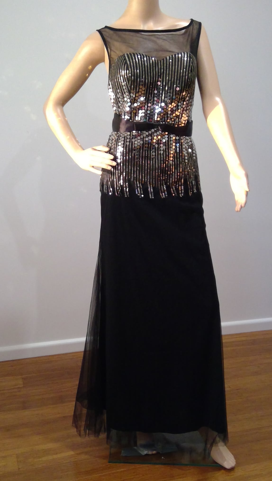 Boatline neck net to bustline silver sequin down bodice to hip dainty black satin belt ,several layers of georgette for a fuller long skirt
