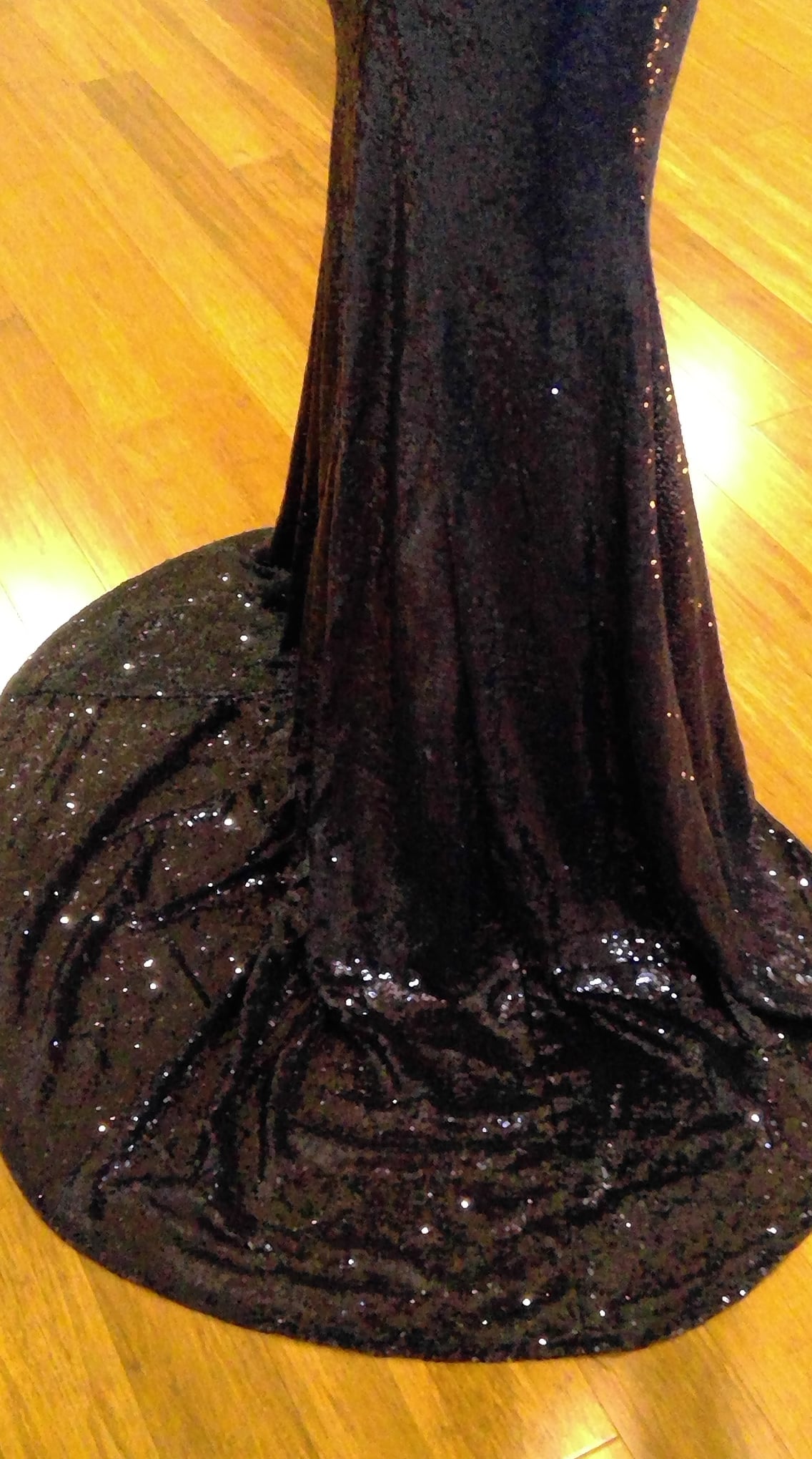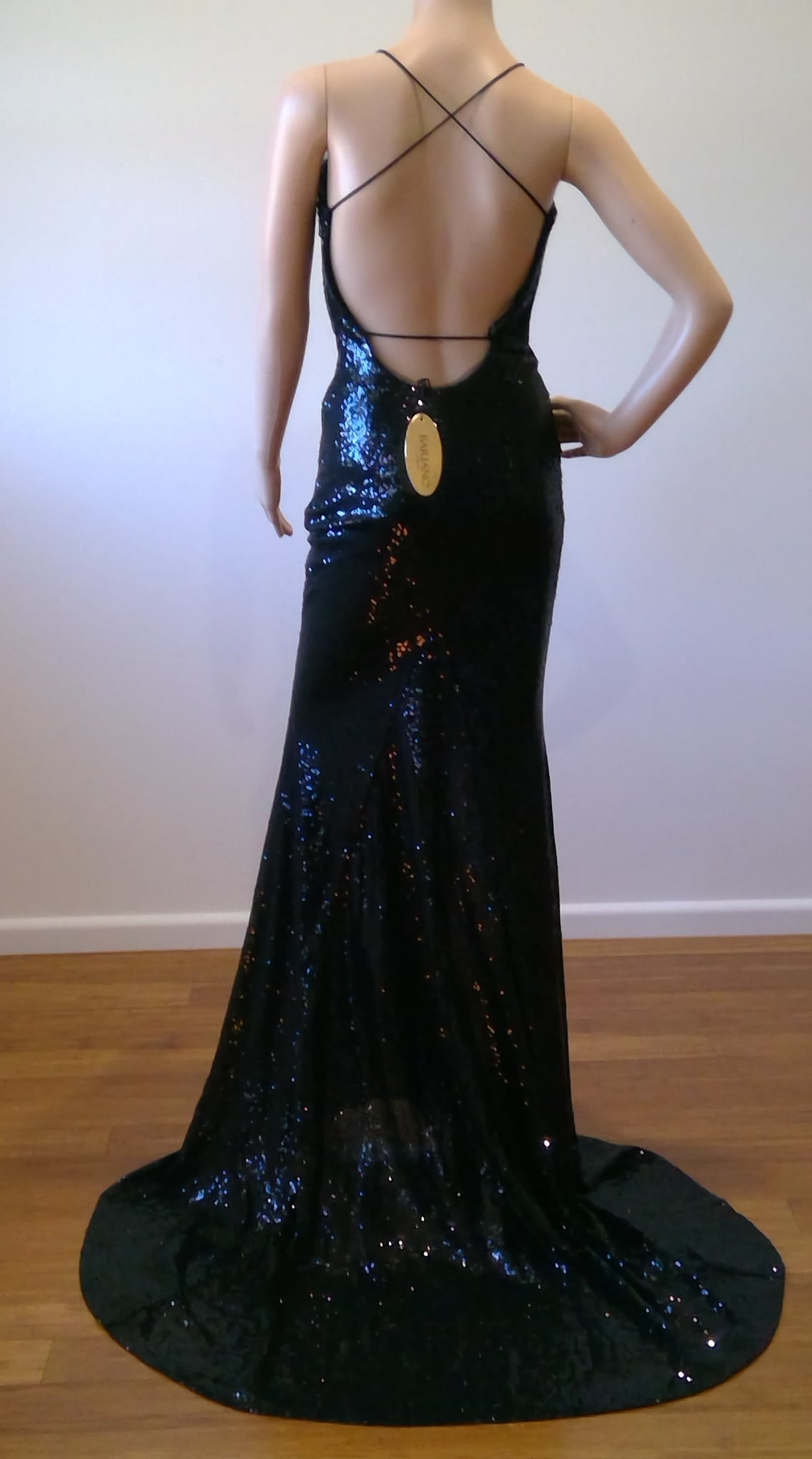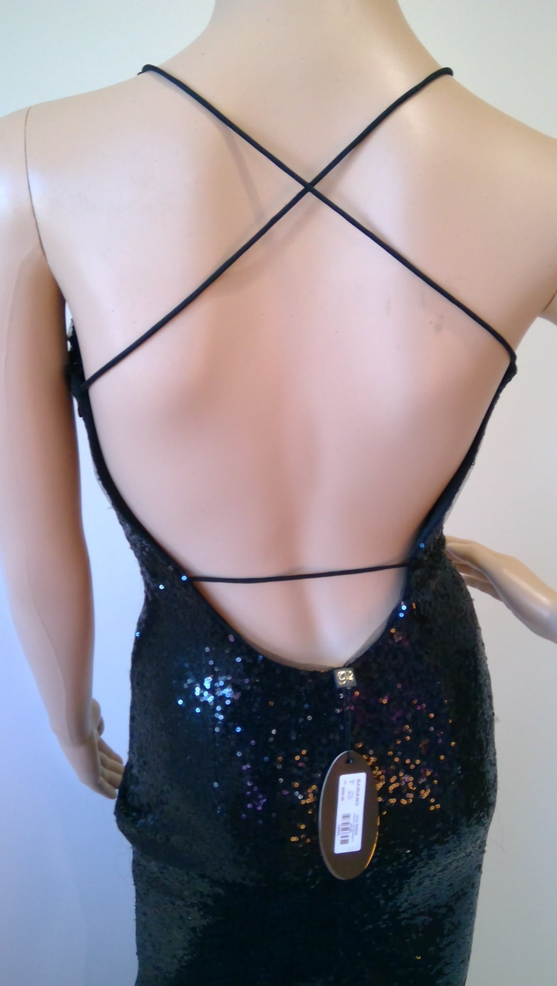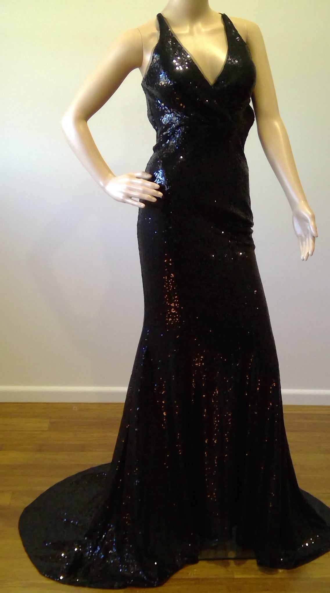 Fully sequined black dress. Halter neck, backless, with spaghetti crossover back straps. Skirt straight to knee then flared to end in chapel train