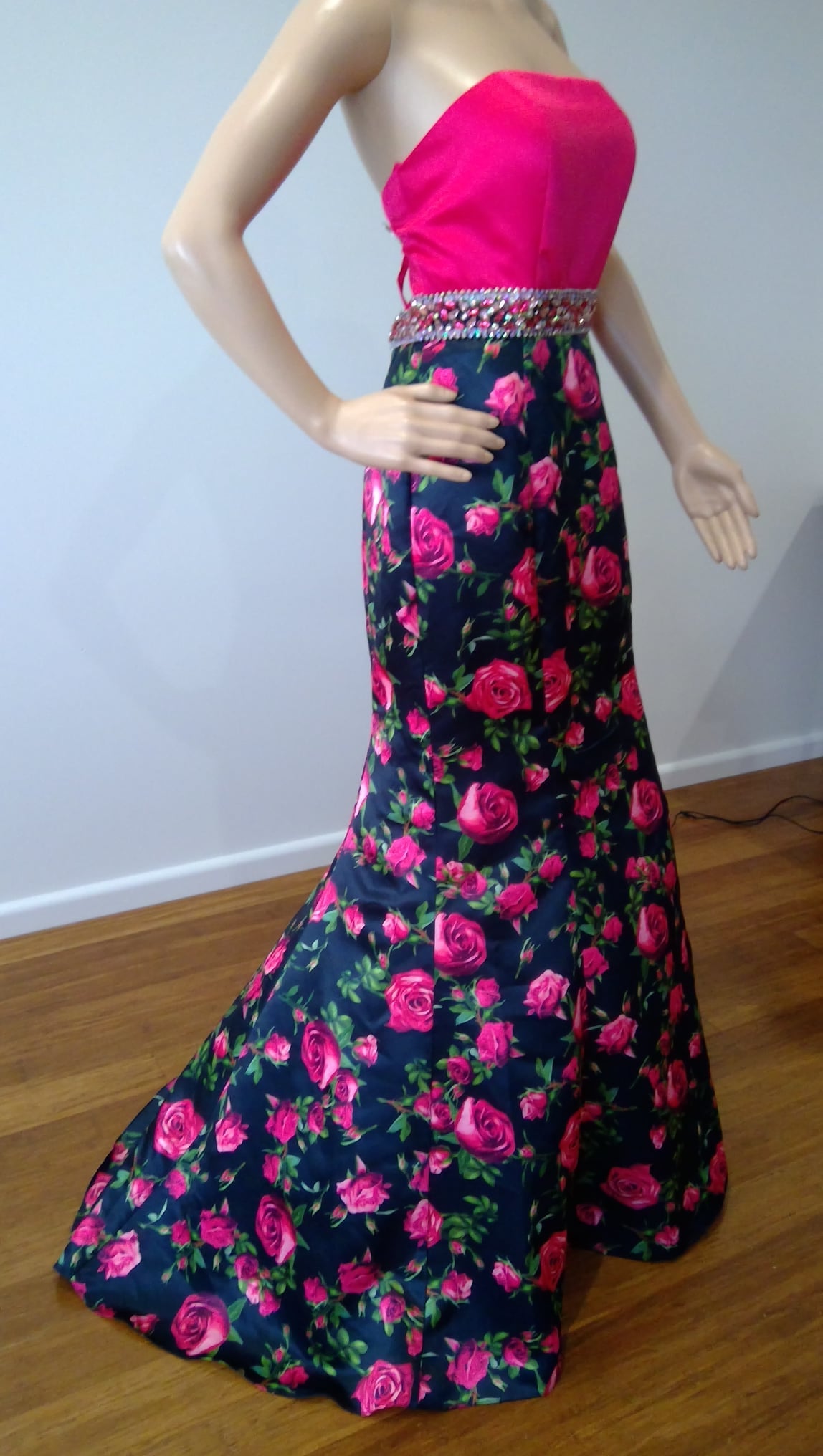 Sheath dress with hot pink bodice and floral on black background skirt. Beaded waist accent. Strapless and mermaid shape.