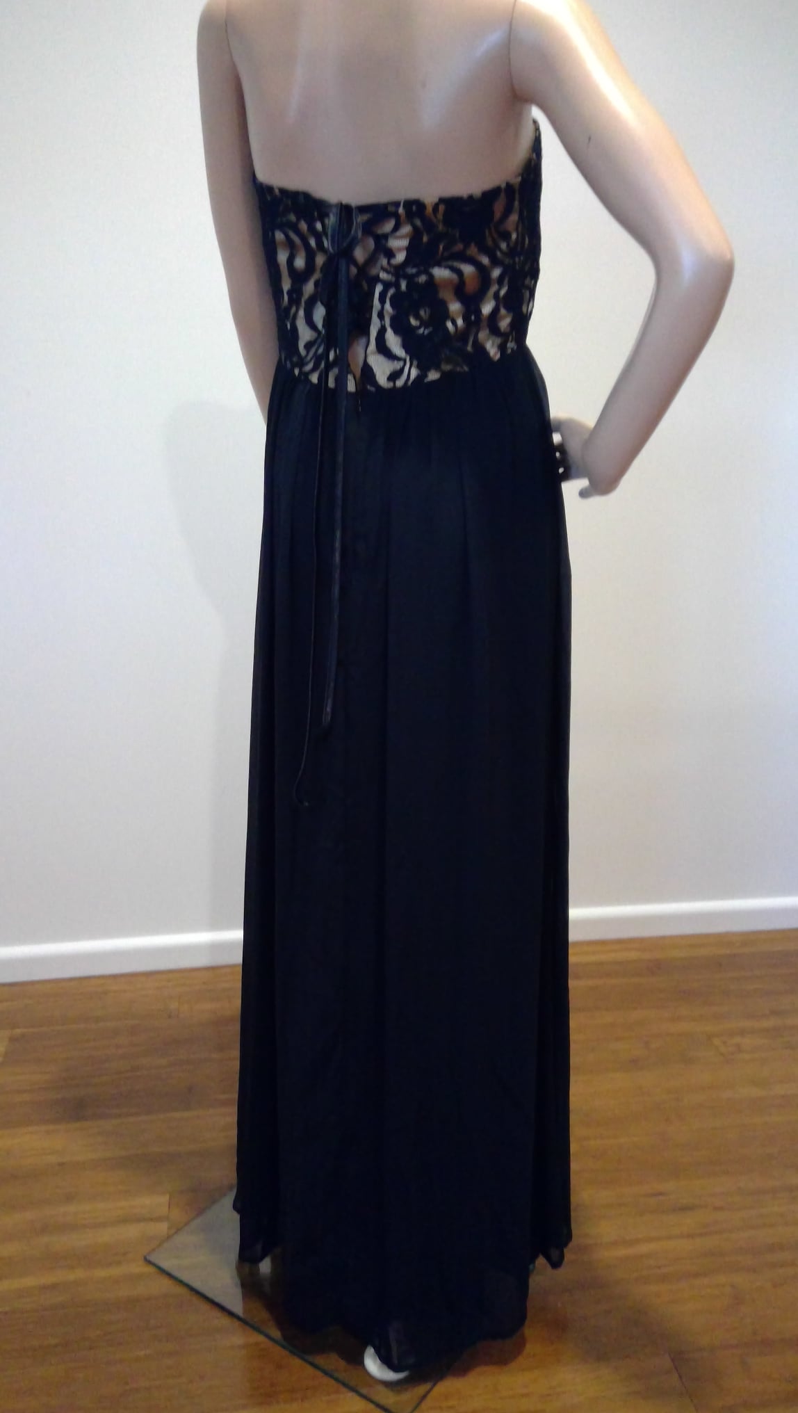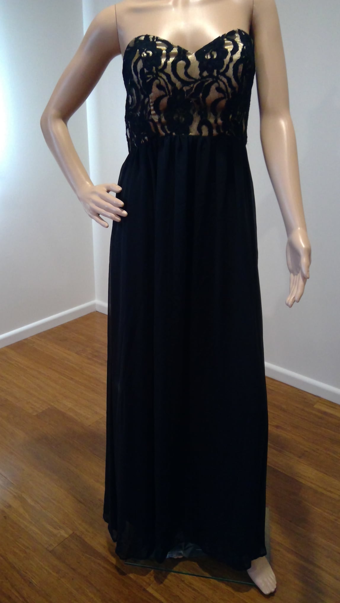 Strapless black dress sweetheart neckline, lace bodice over gold full length, full skirt