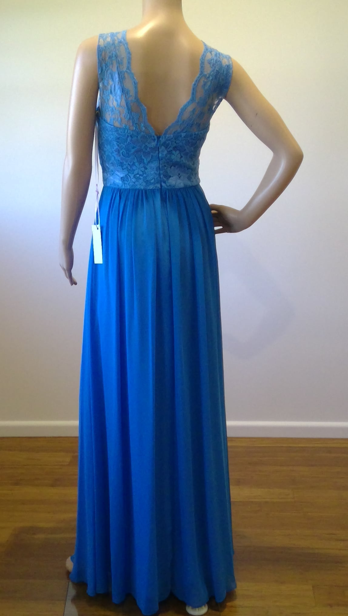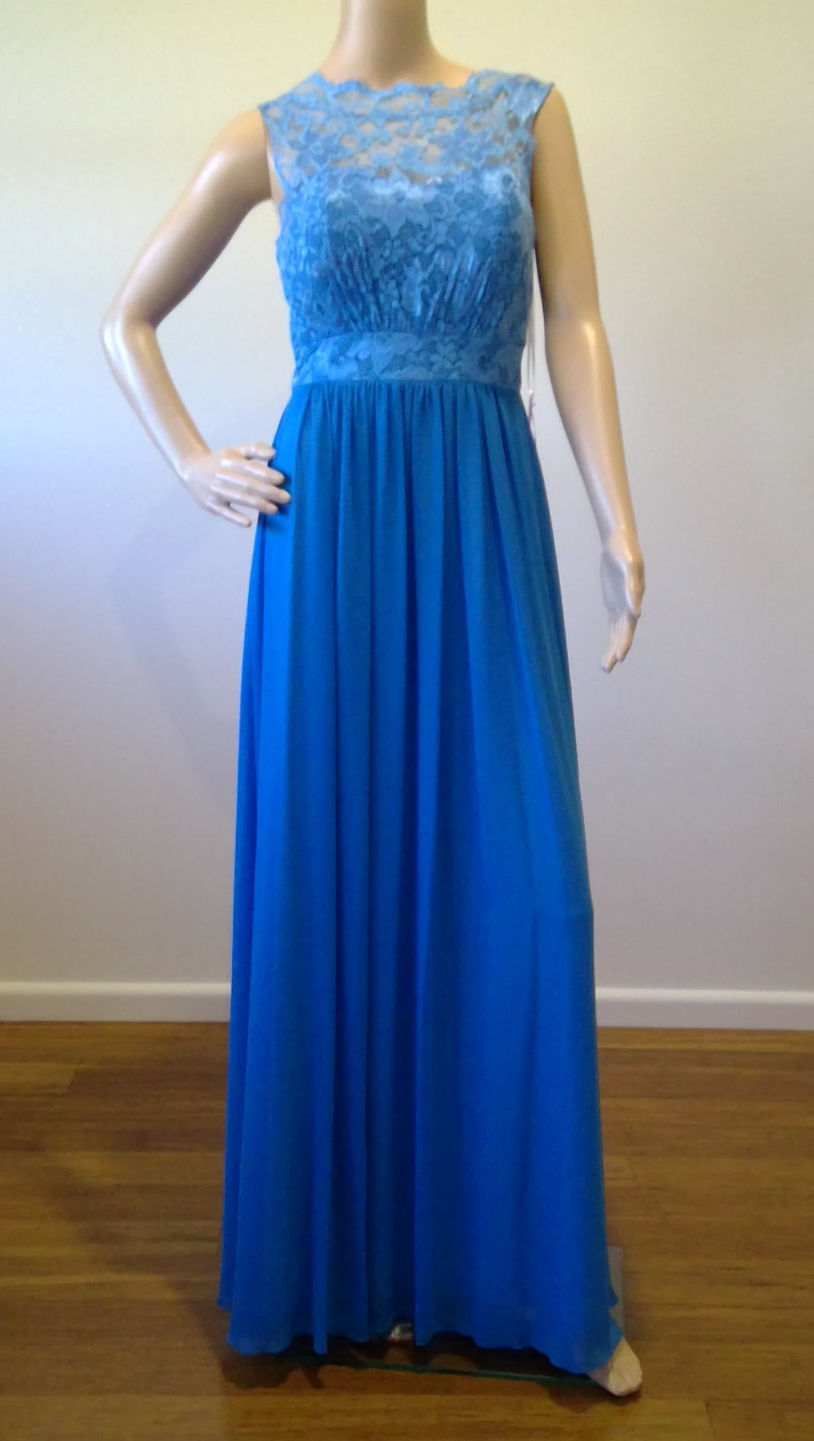 Blue Illusion neckline, lace bodice, gathered skirt, floor length.