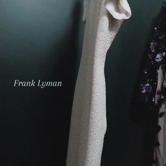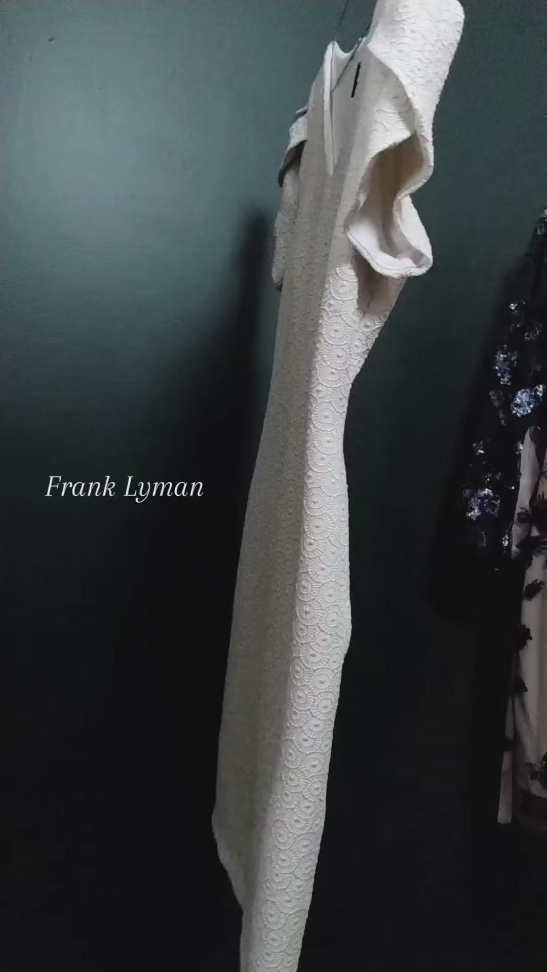 Attractive cream dream with interwoven gold giving the dress a lovely gleam. Princess line shape to knee, slit in back of skirt, short sleeve.
