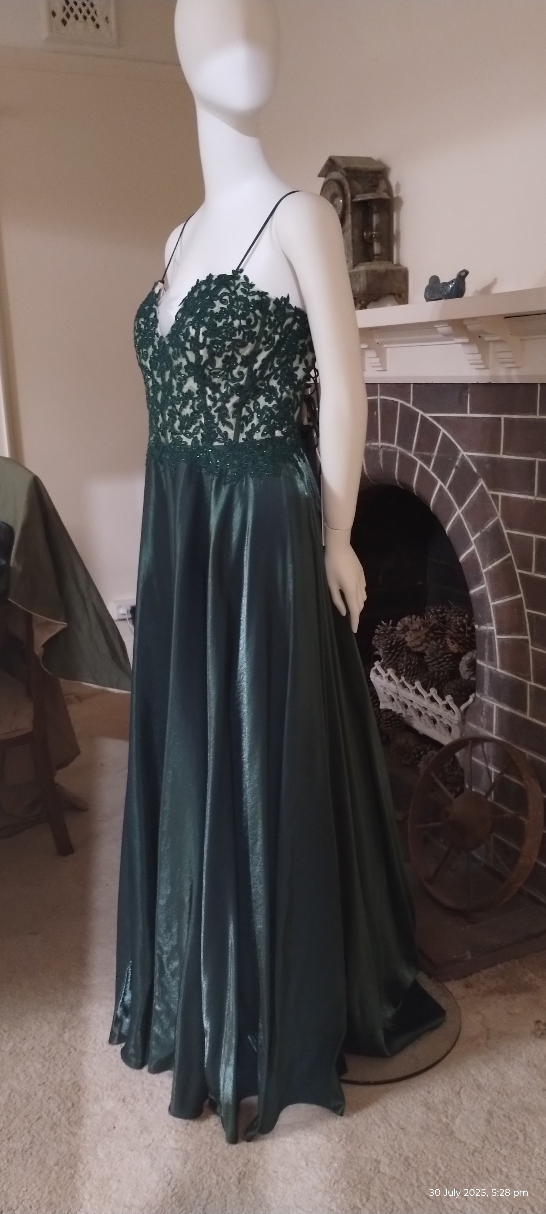 Size 16 full length green dress. Full satin skirt. Lace sweetheart bodice over pale satin. Spaghetti straps corset back.