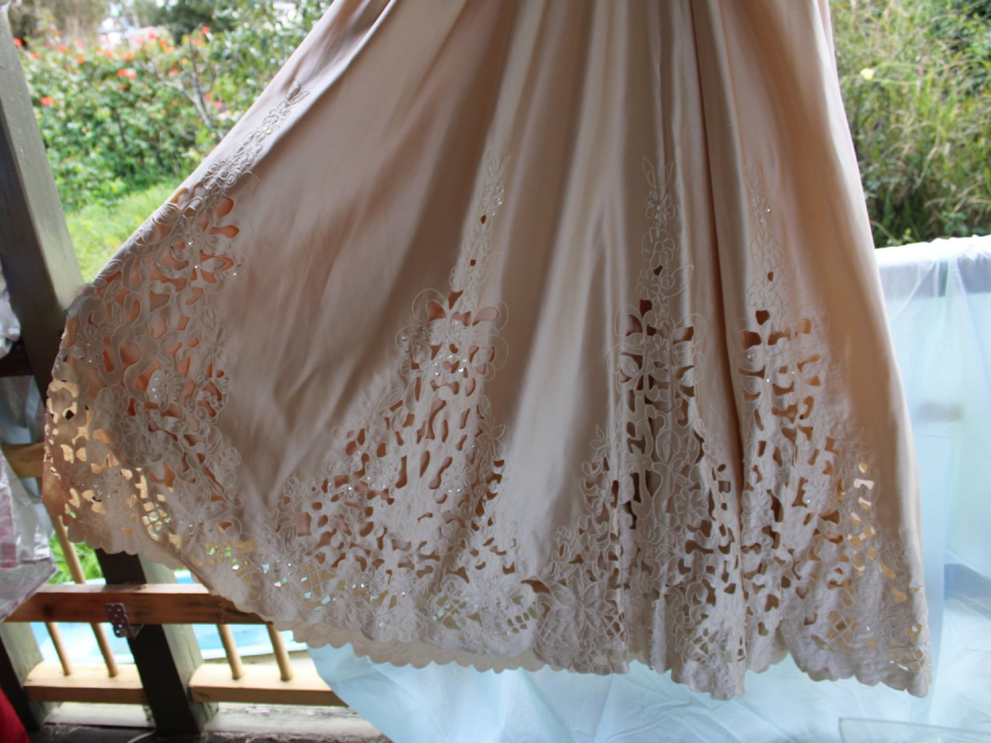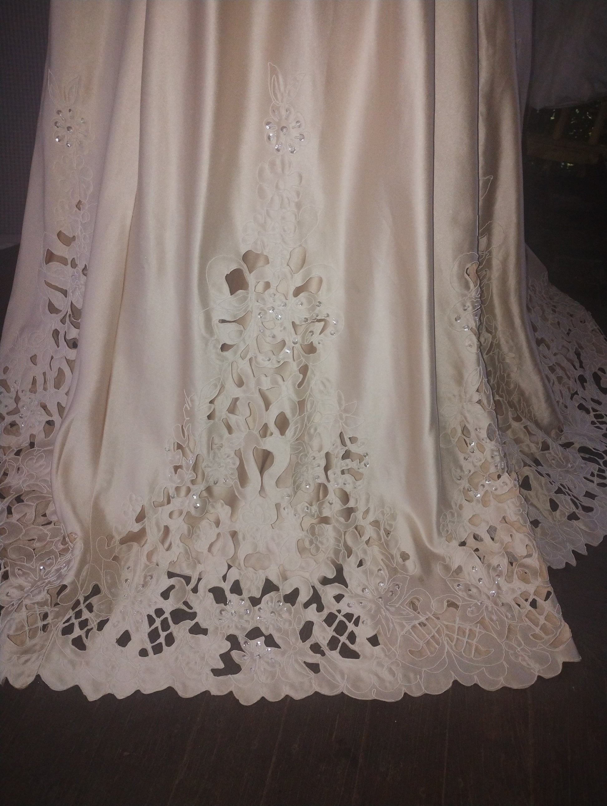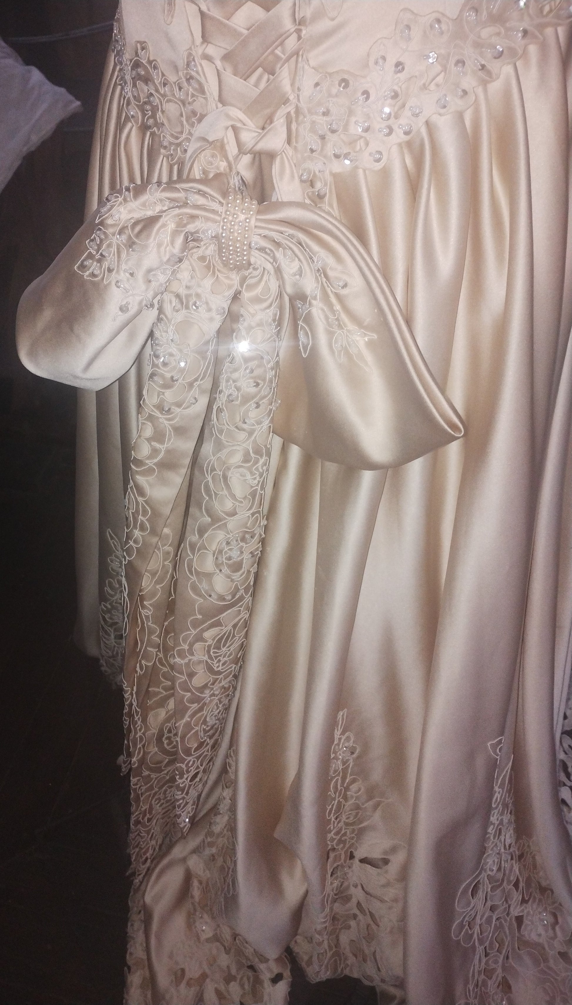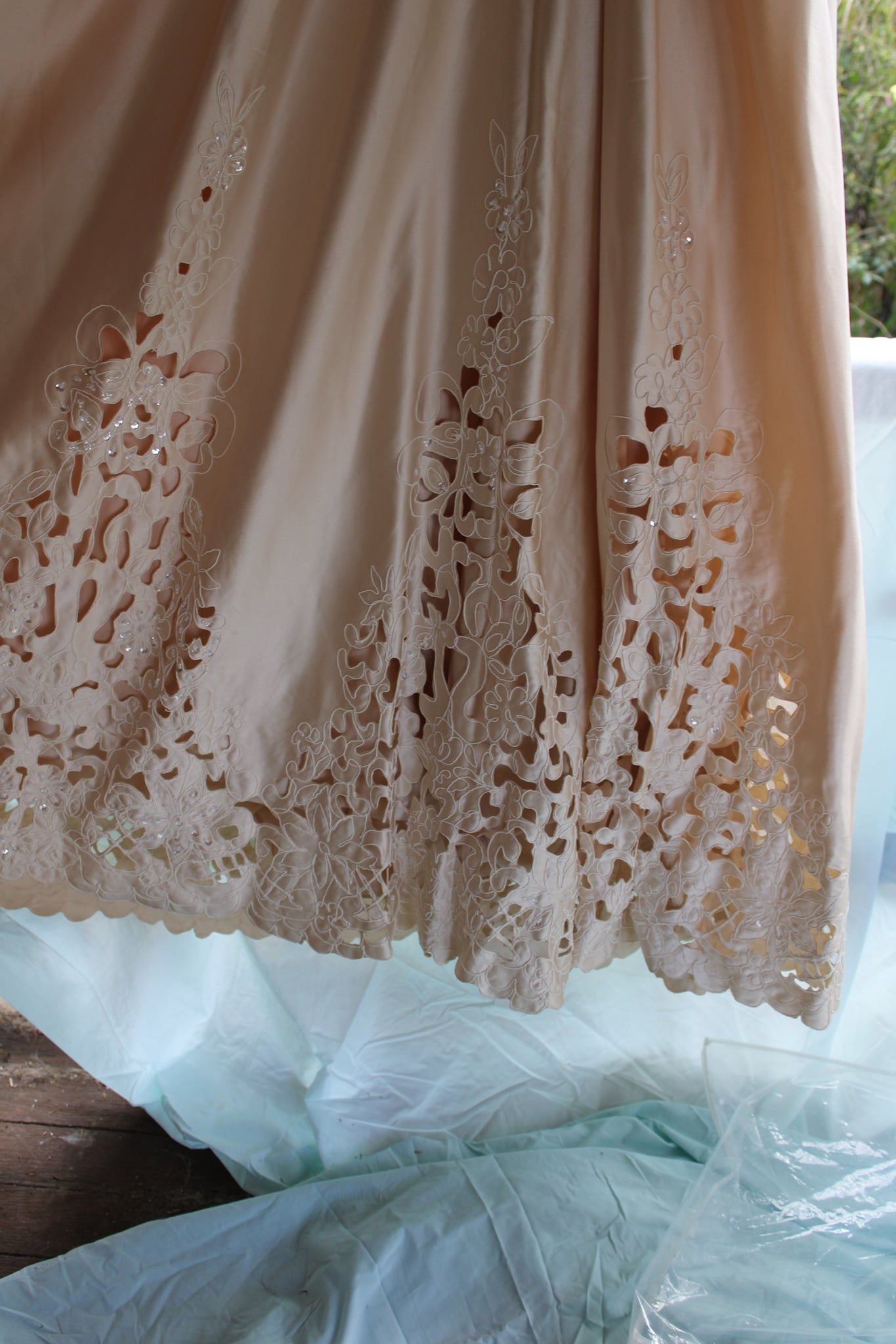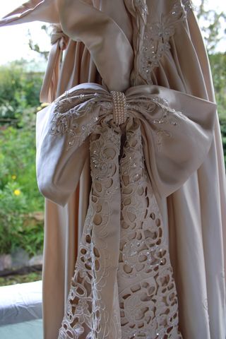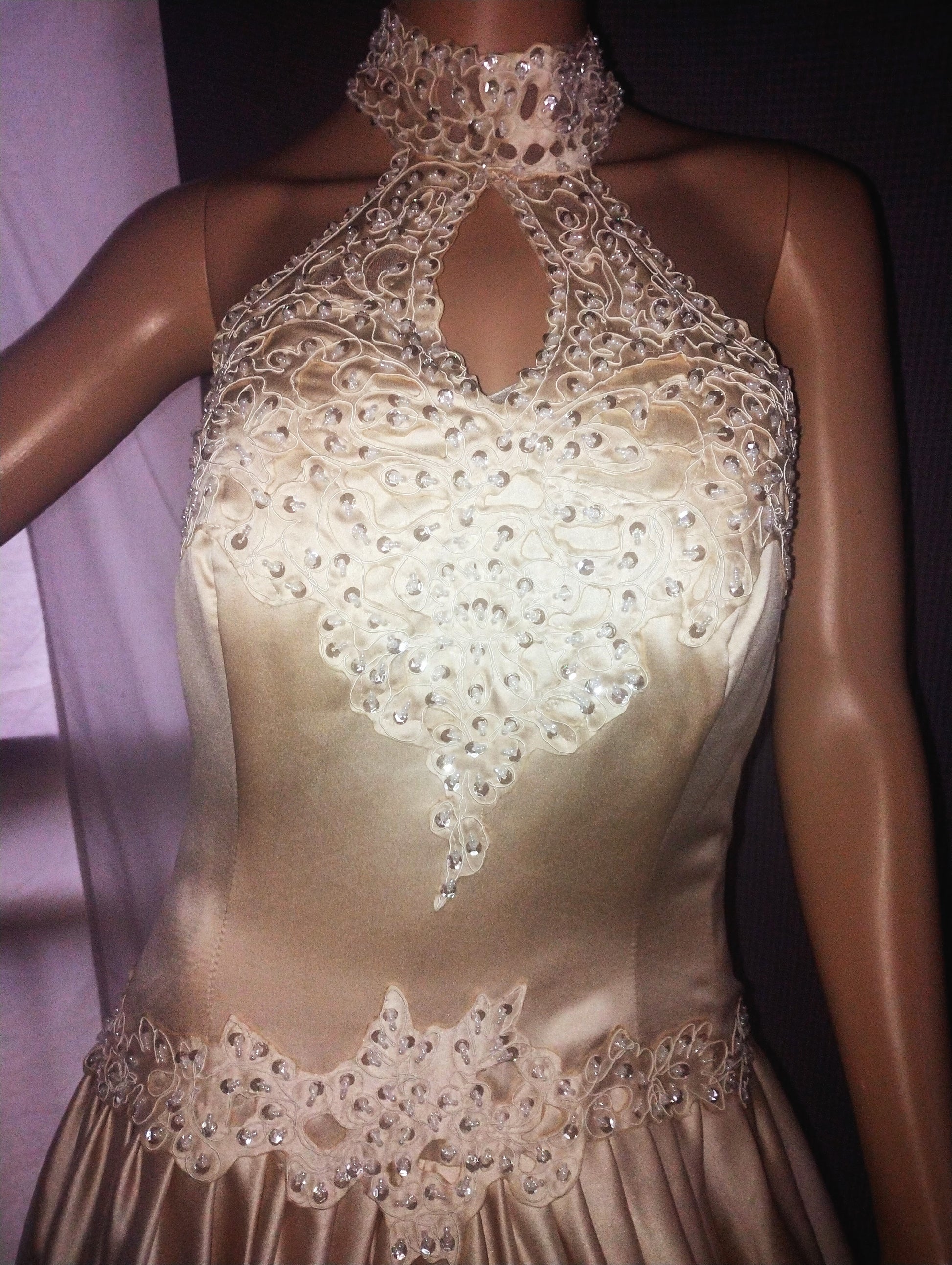 Halter neck, corset back, full skirt and bow. In gold with amazing detail of cutwork and beading.