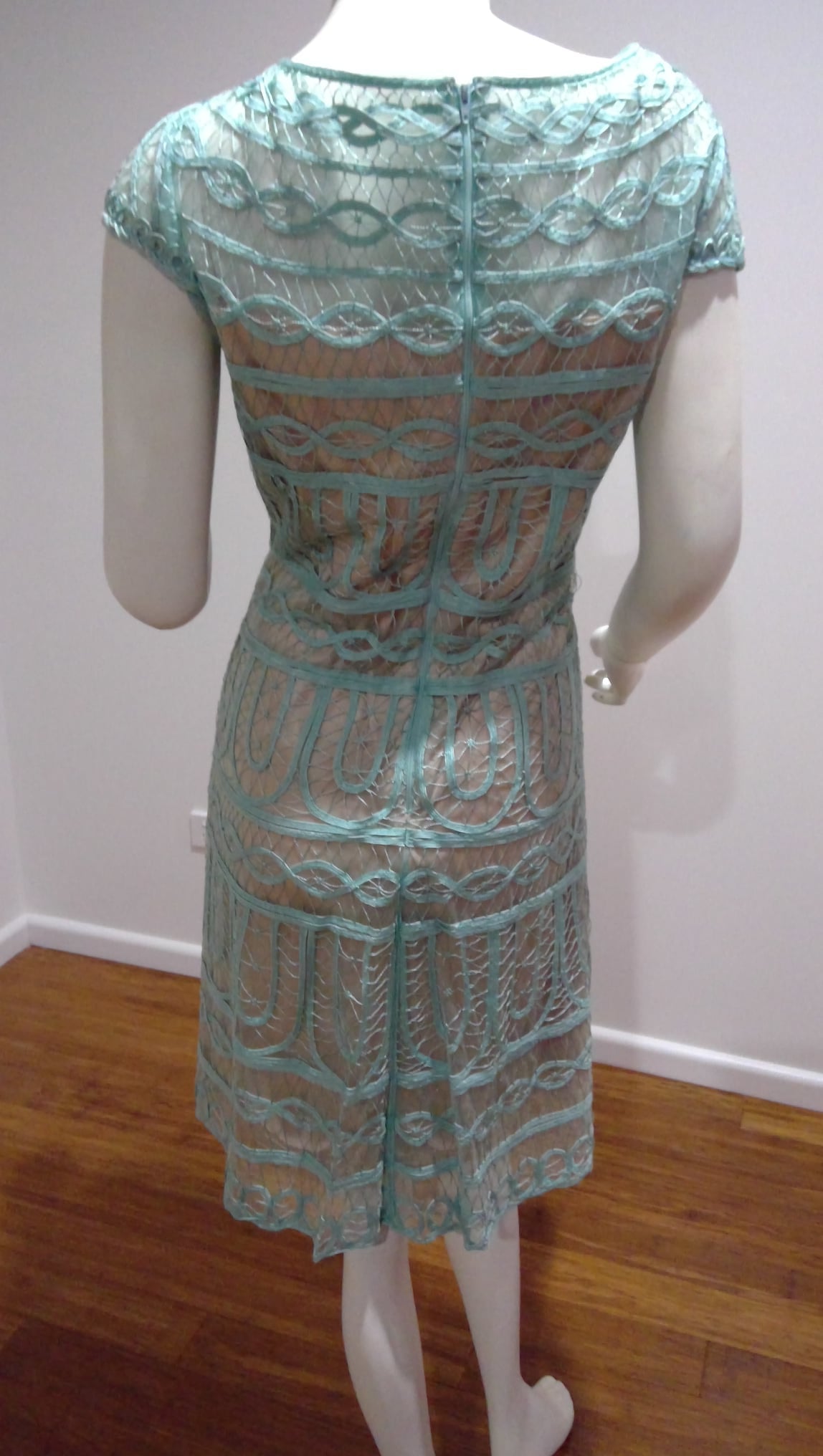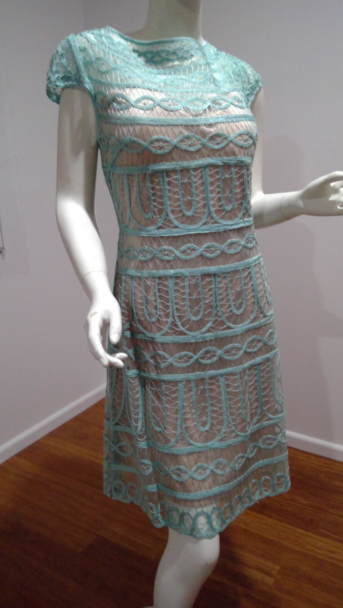 Jade green lace dress to knee. Fitted, with box pleat in skirt.