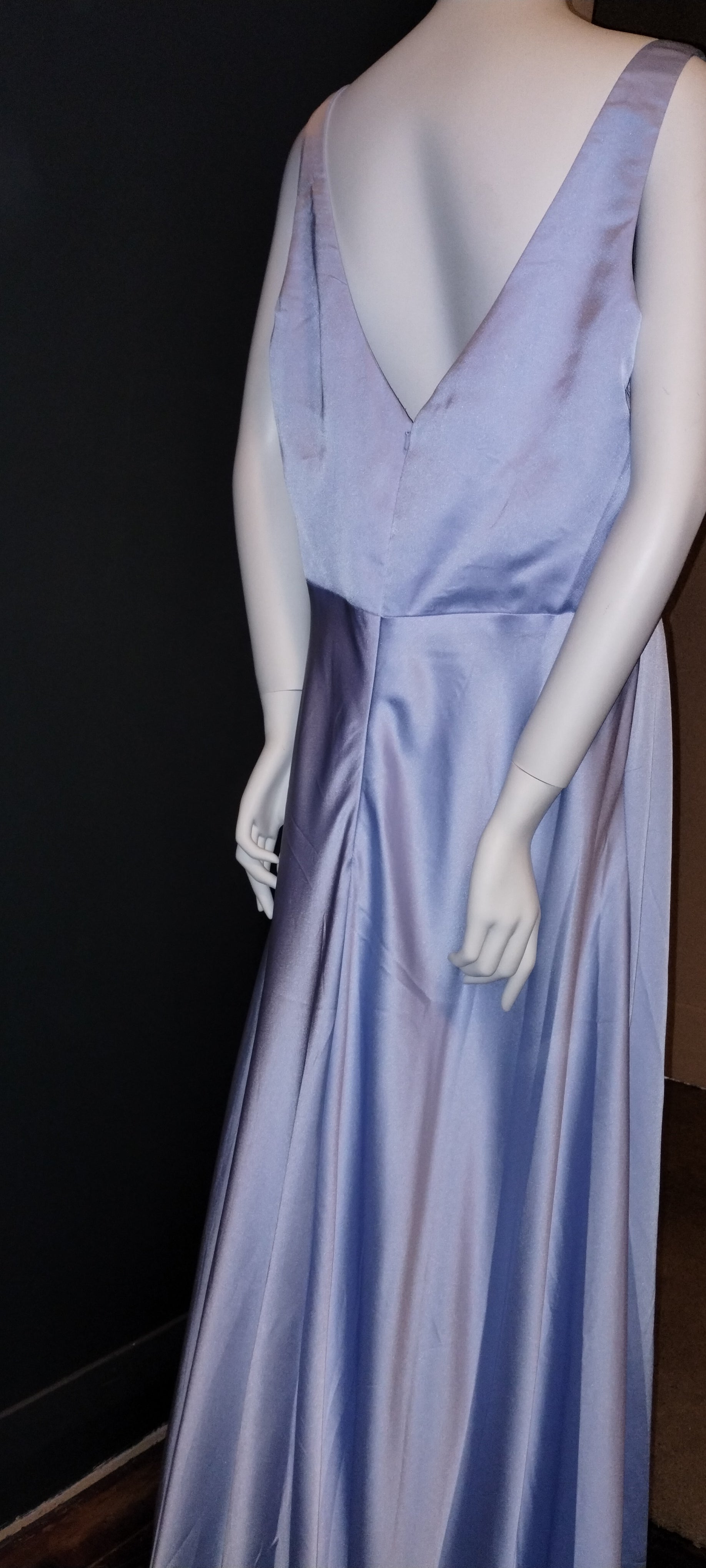 50s inspired classic gown. Pale blue satin. Deep V neck. wide shoulder straps. long A line skirt. Sleeveless.