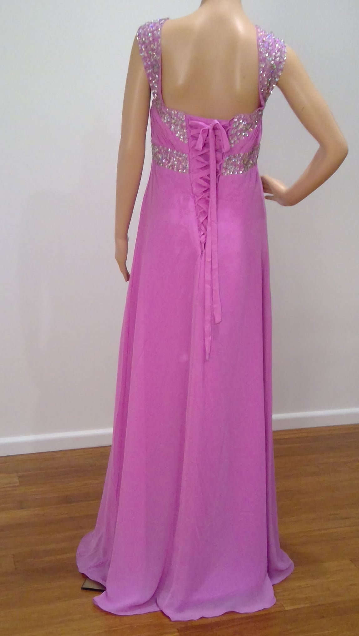 Lilac full length dress. Sweetheart bodice, draped, beaded detail on straps and waistline. corset back.