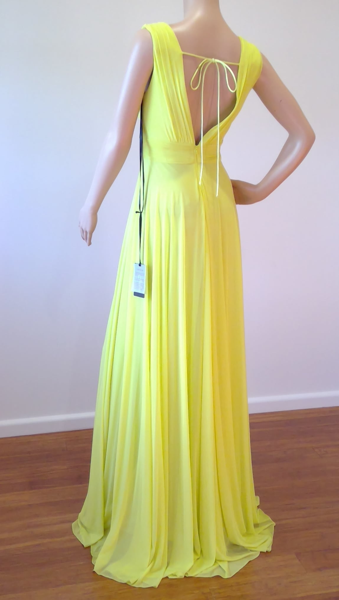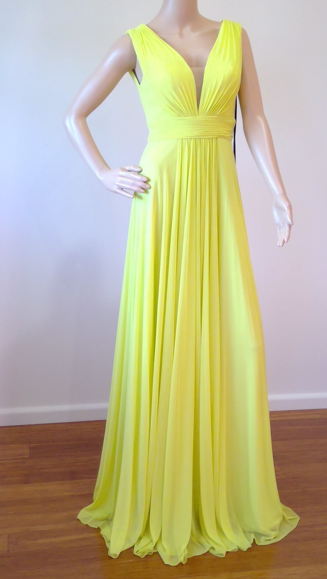 Full length lime yellow dress. Plunging neckline, discreetly kept in place with a little nude net. Deep back, with matching satin cord at shoulder blades. Gathered fabric belt waist detail Full skirt to floor.