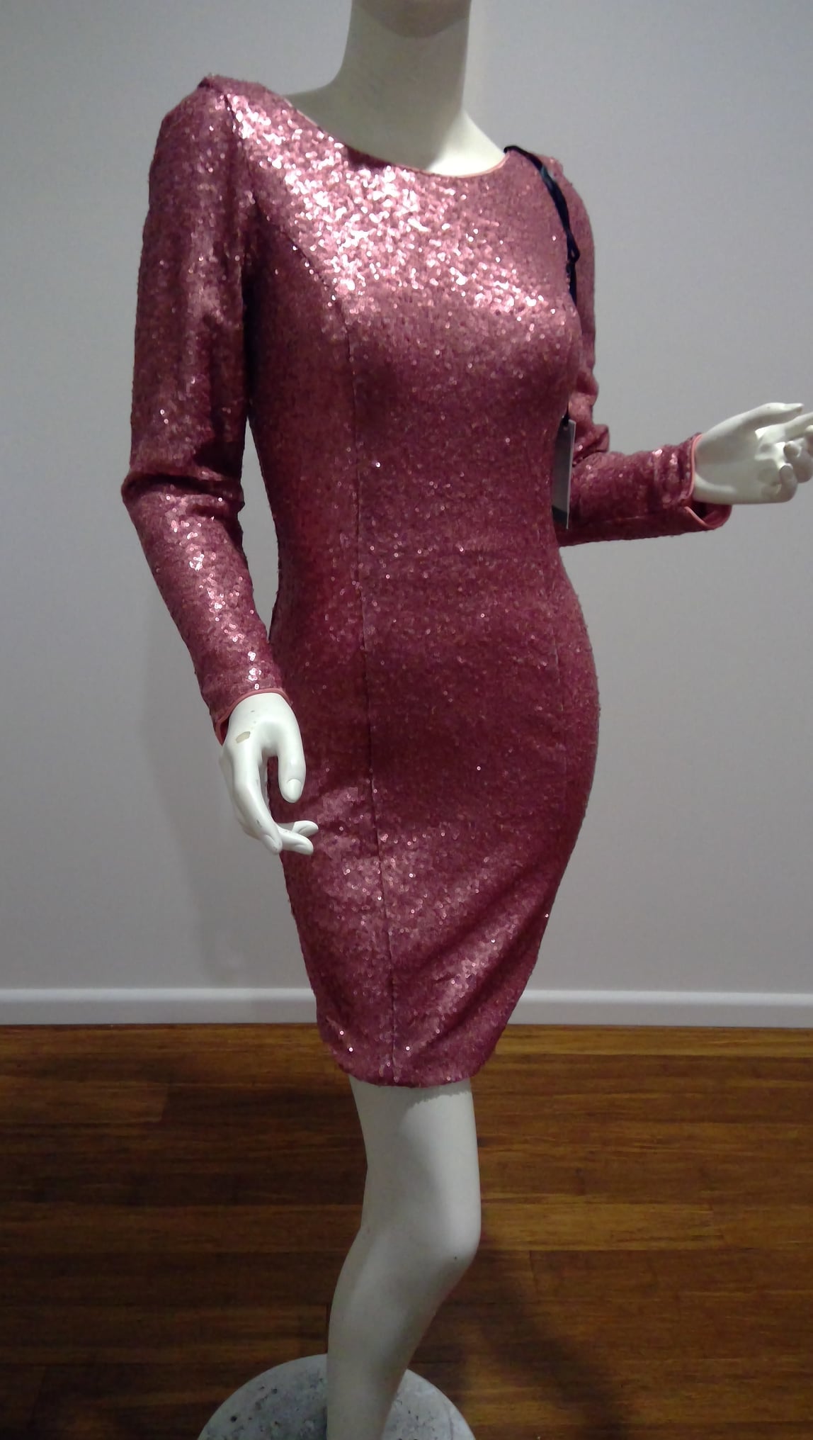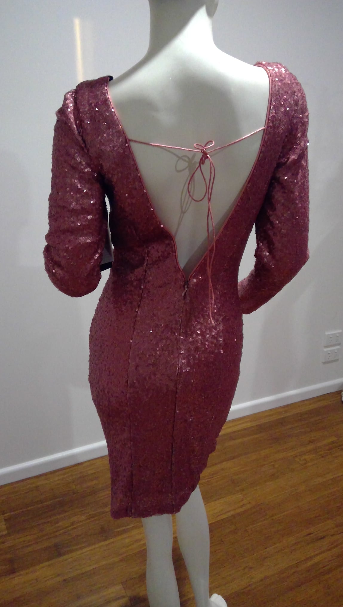 Above the knee princess line straight dress, long sleeve plunging backless. Shell pink in a fine sequined fabric