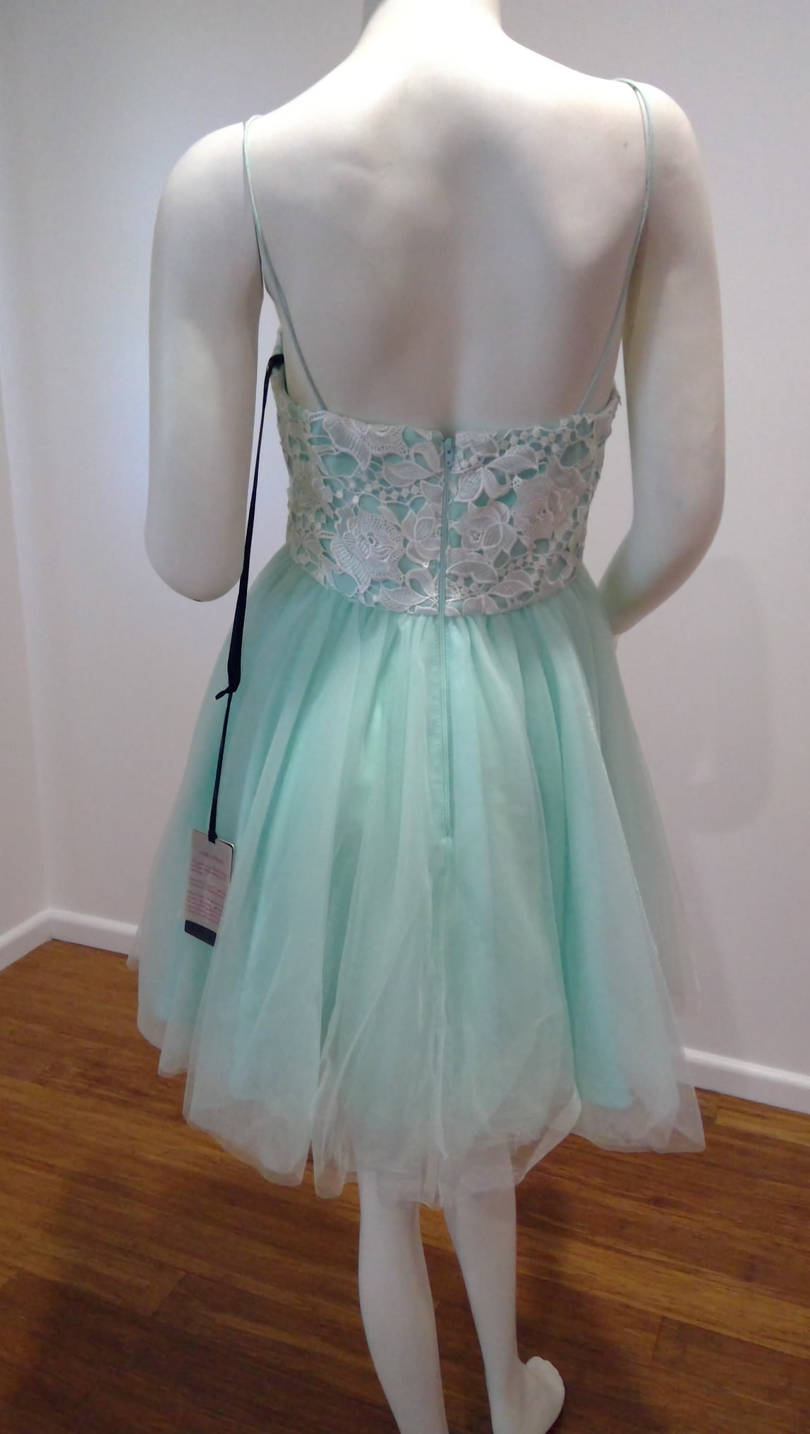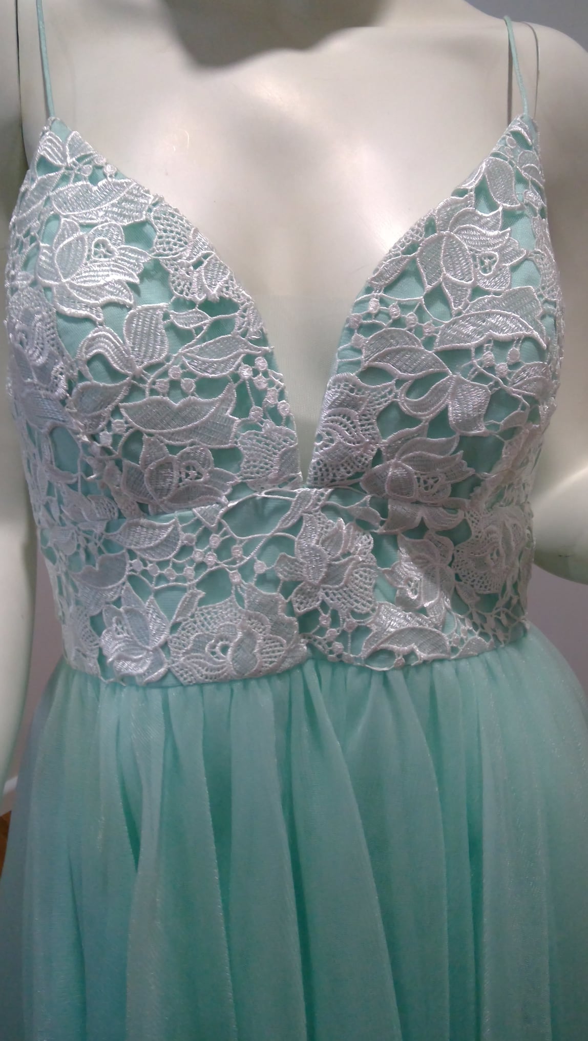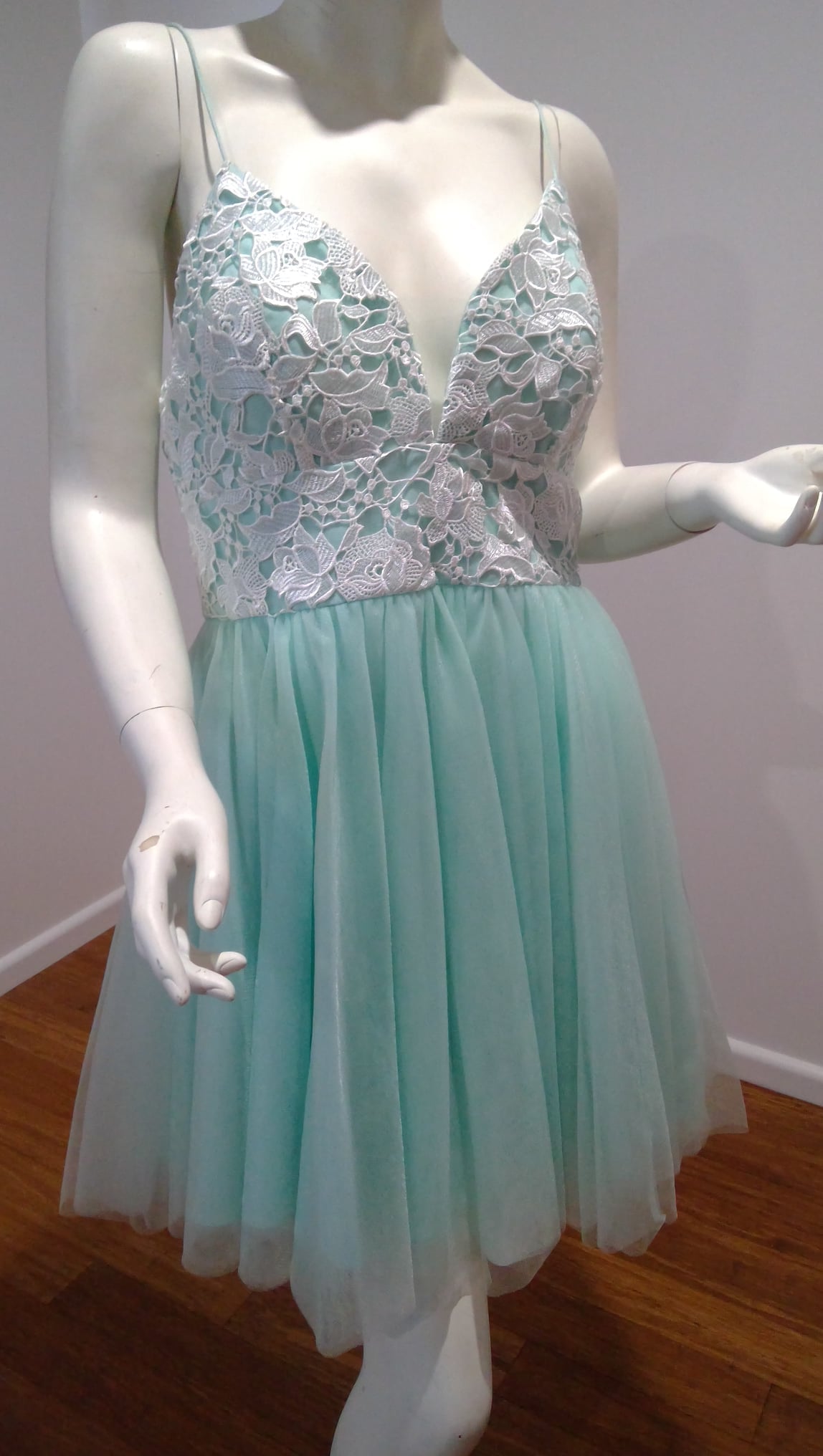 plunging neckline, white lace bodice ,spaghetti straps, above the knee full georgette skirt.