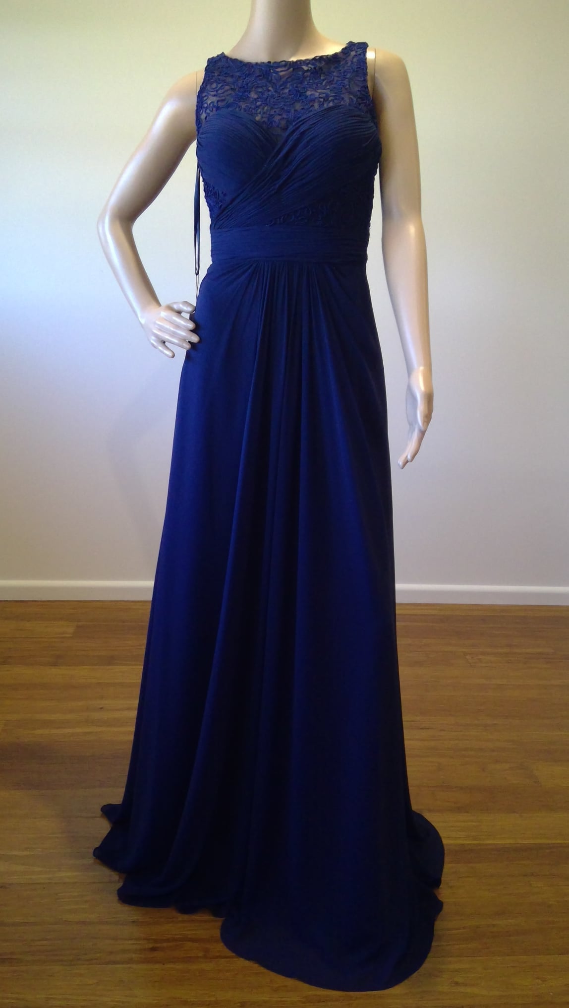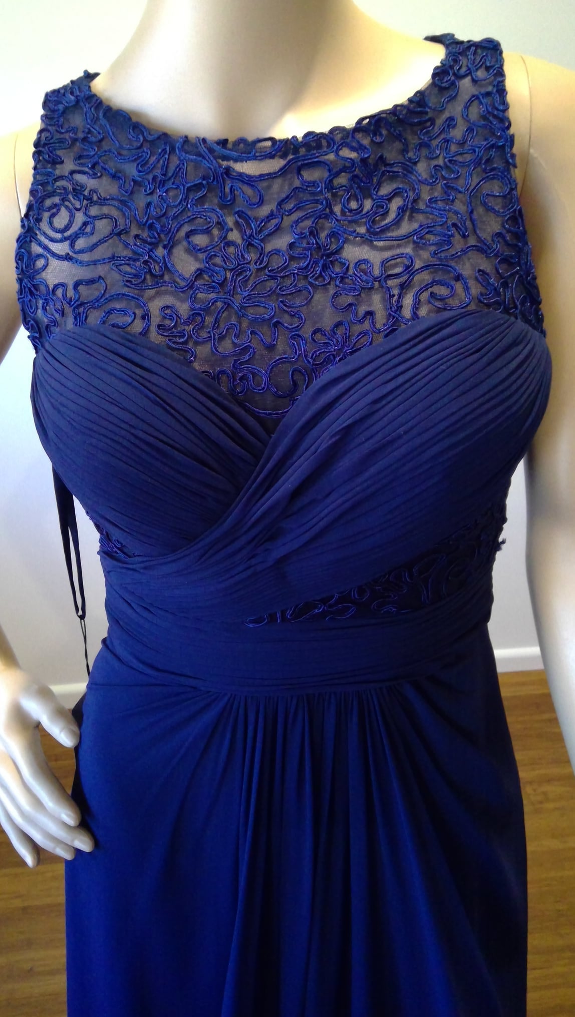 Full length sleeveless gown, Illusion neckline. Sweetheart draped bodice. Draped skirt with sweep