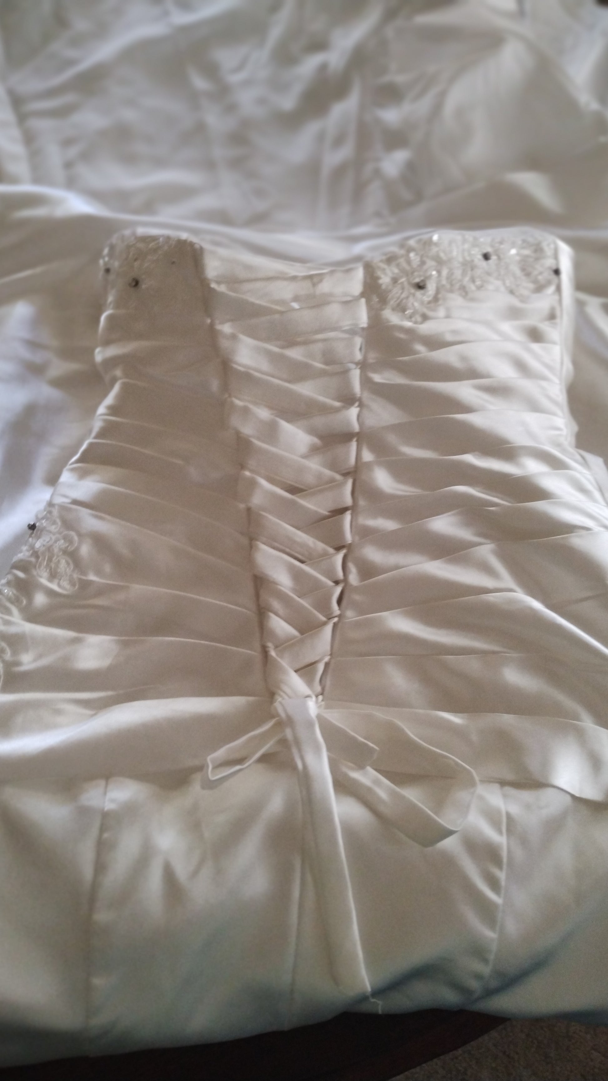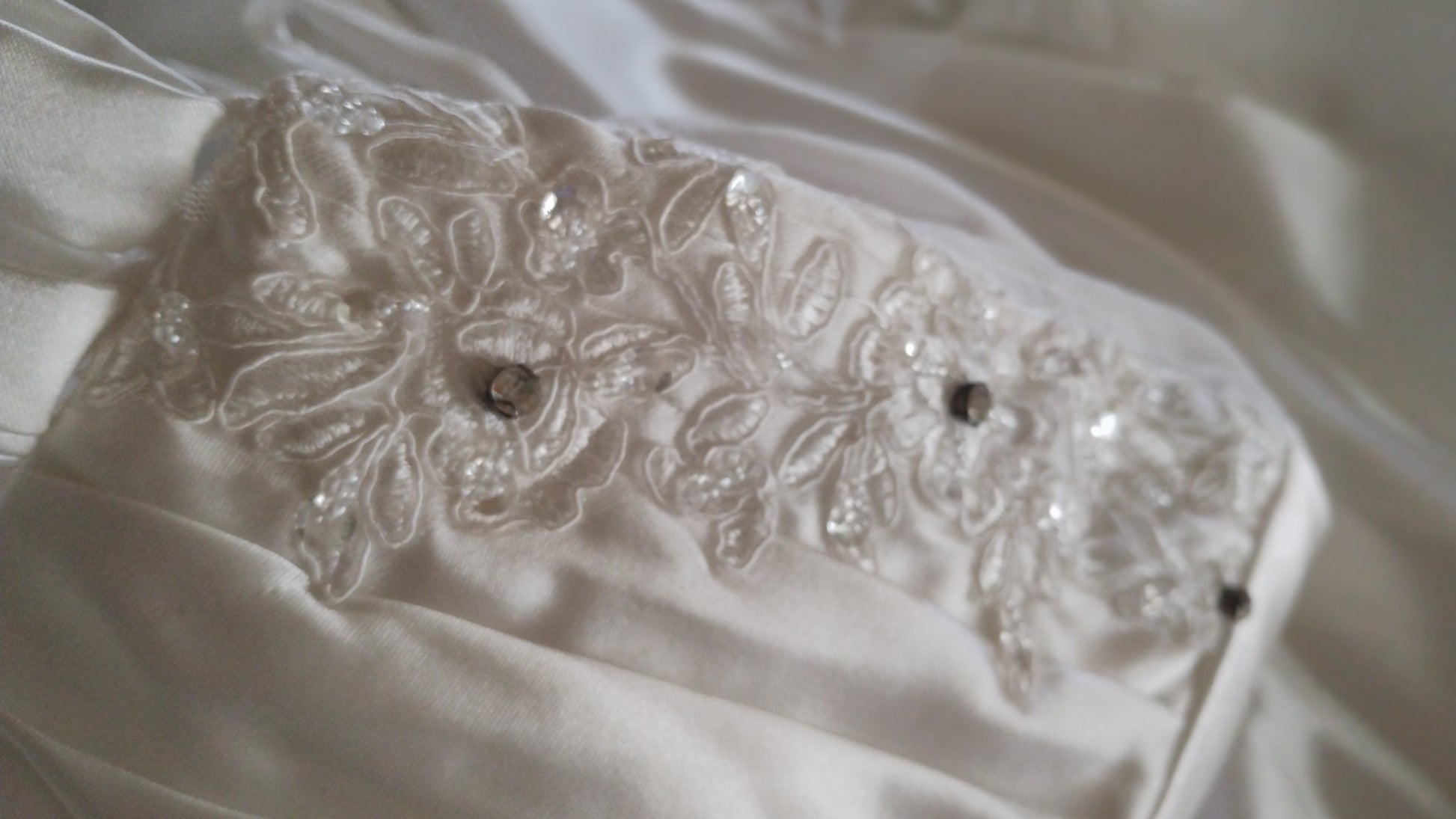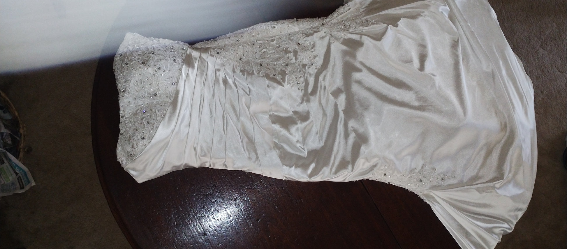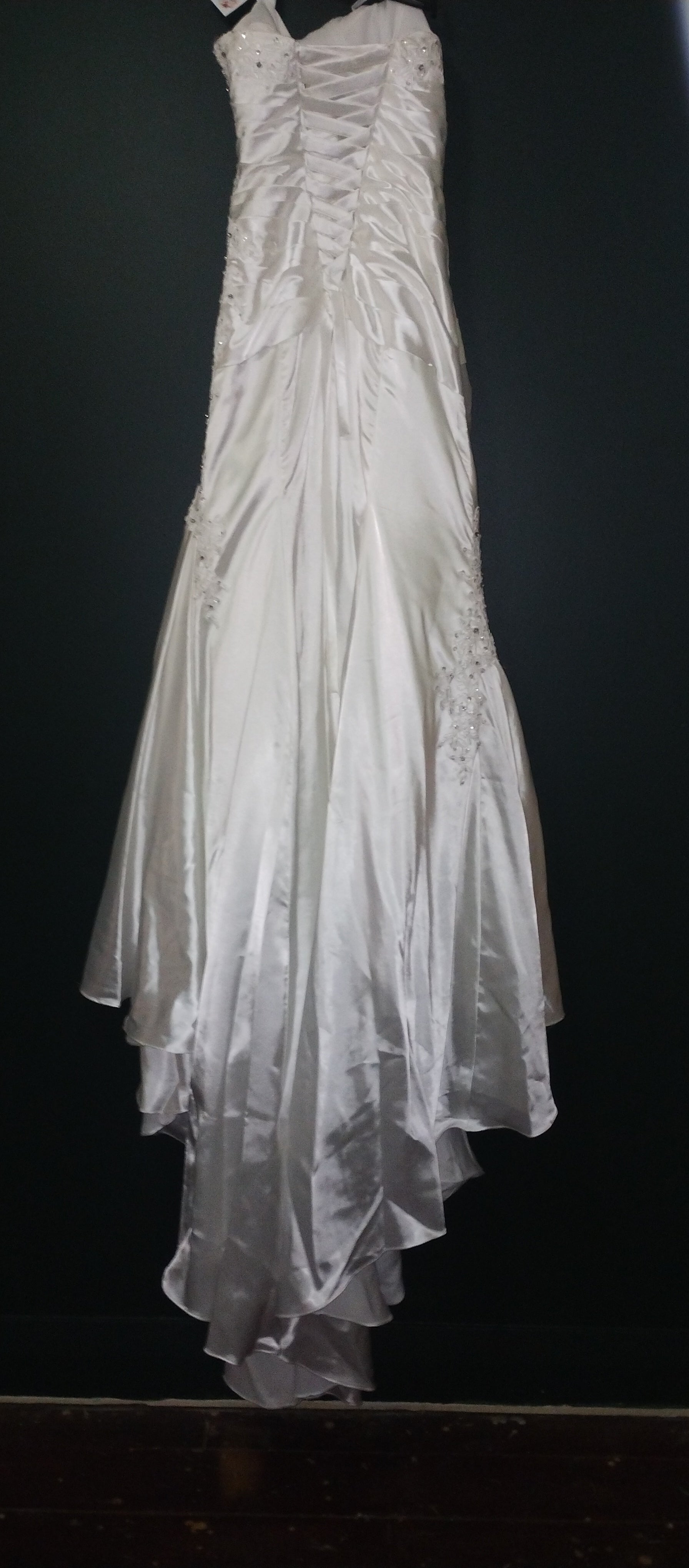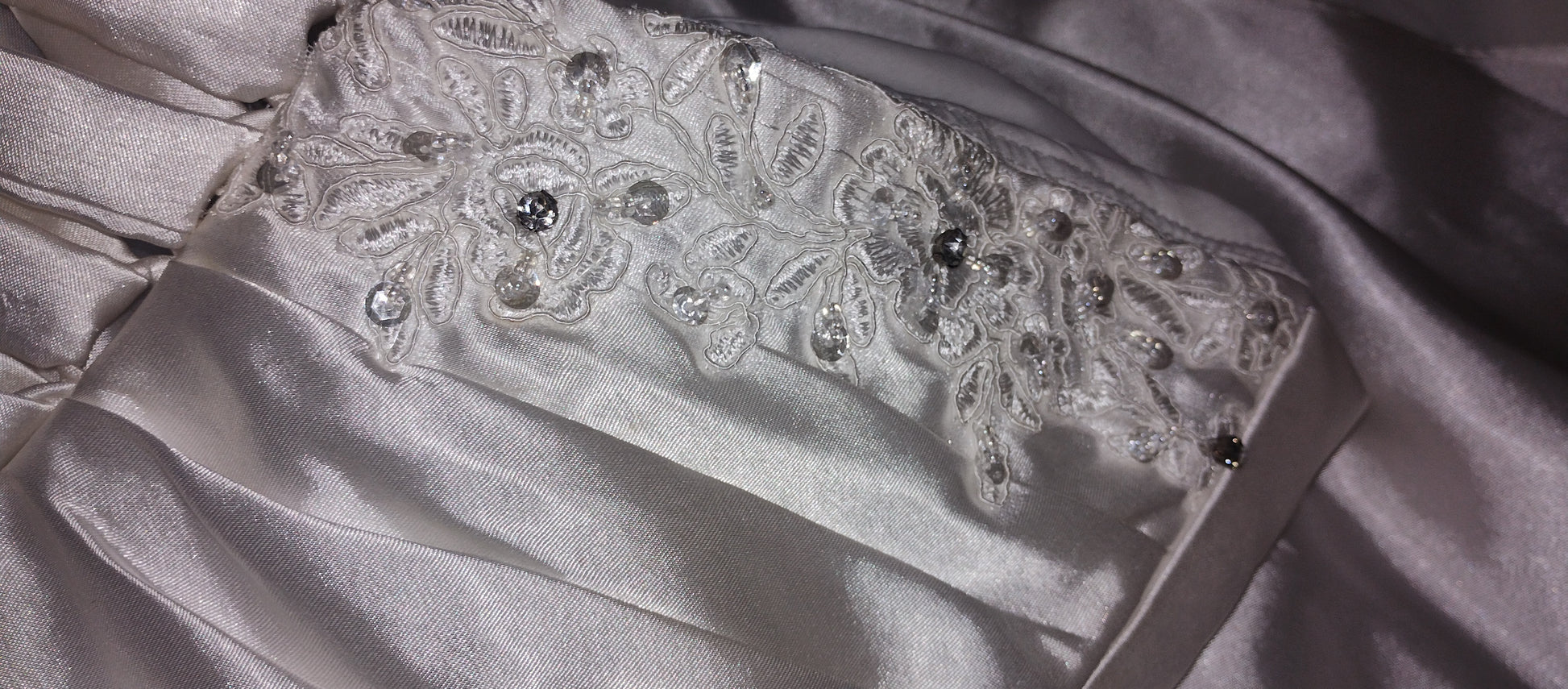 Diamante and sequined encrusted lace bodice. Dramatic darting of satin under bust to hip. Mermaid skirt ending in chapel train. Corset back. lace accents hip to knee.