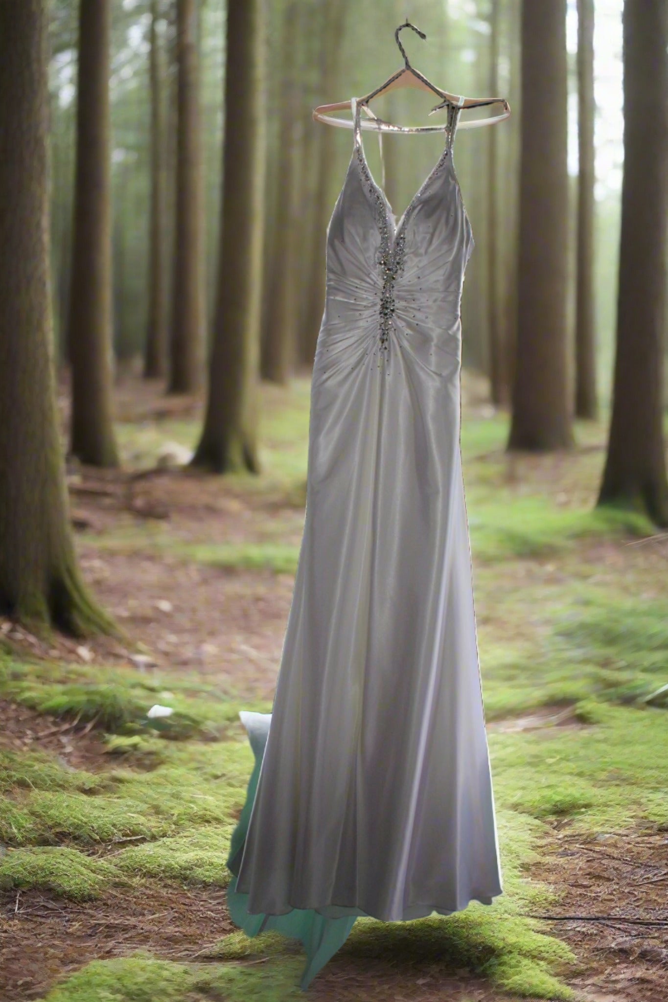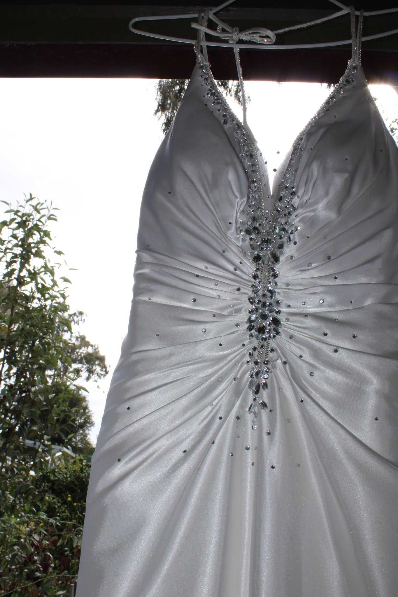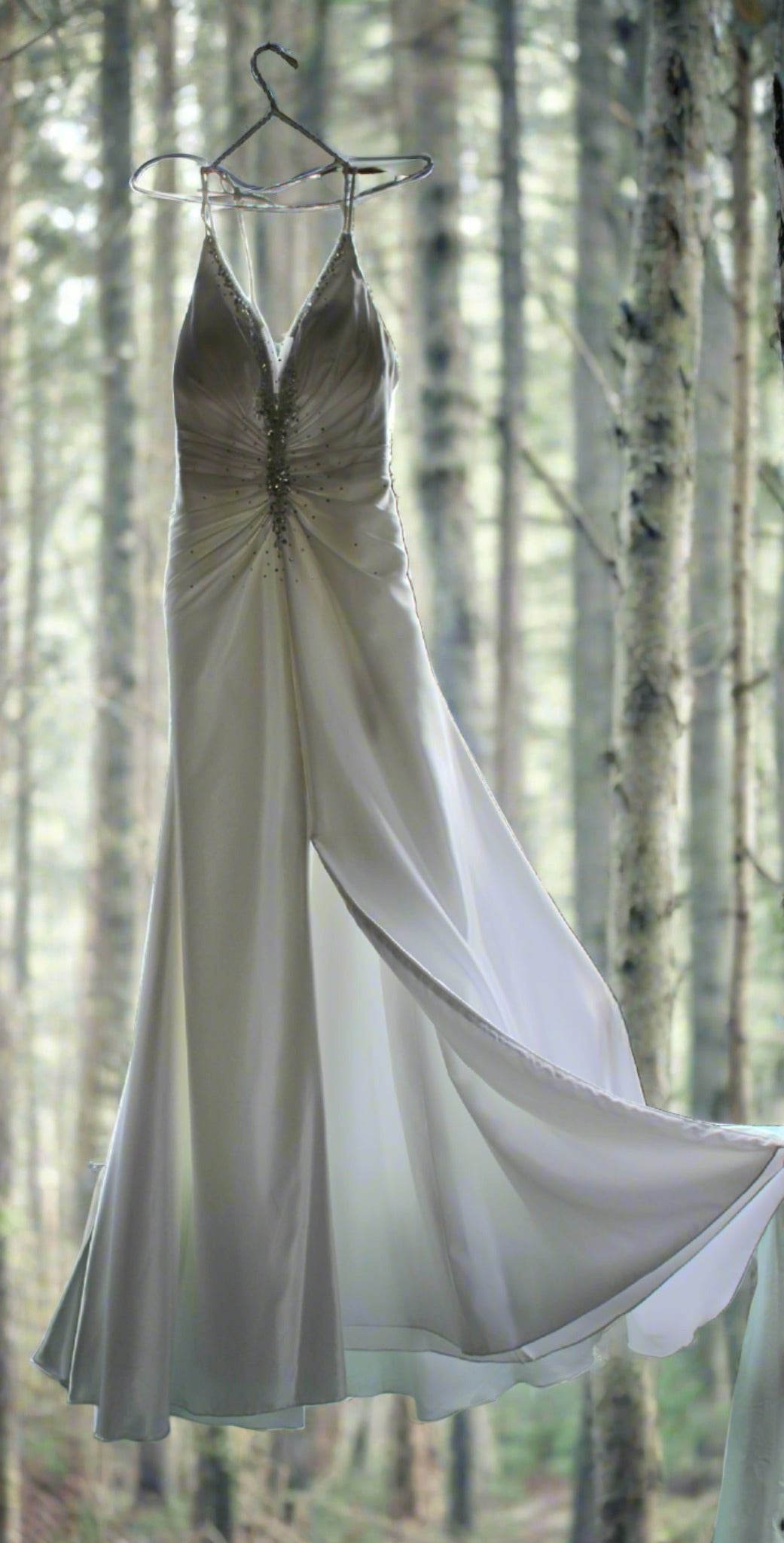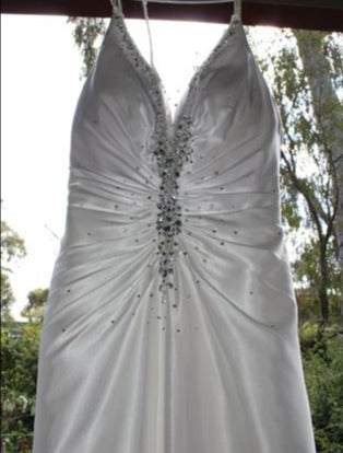 e Size 12 Offwhite dramatic plunging neckline beaded satin dres