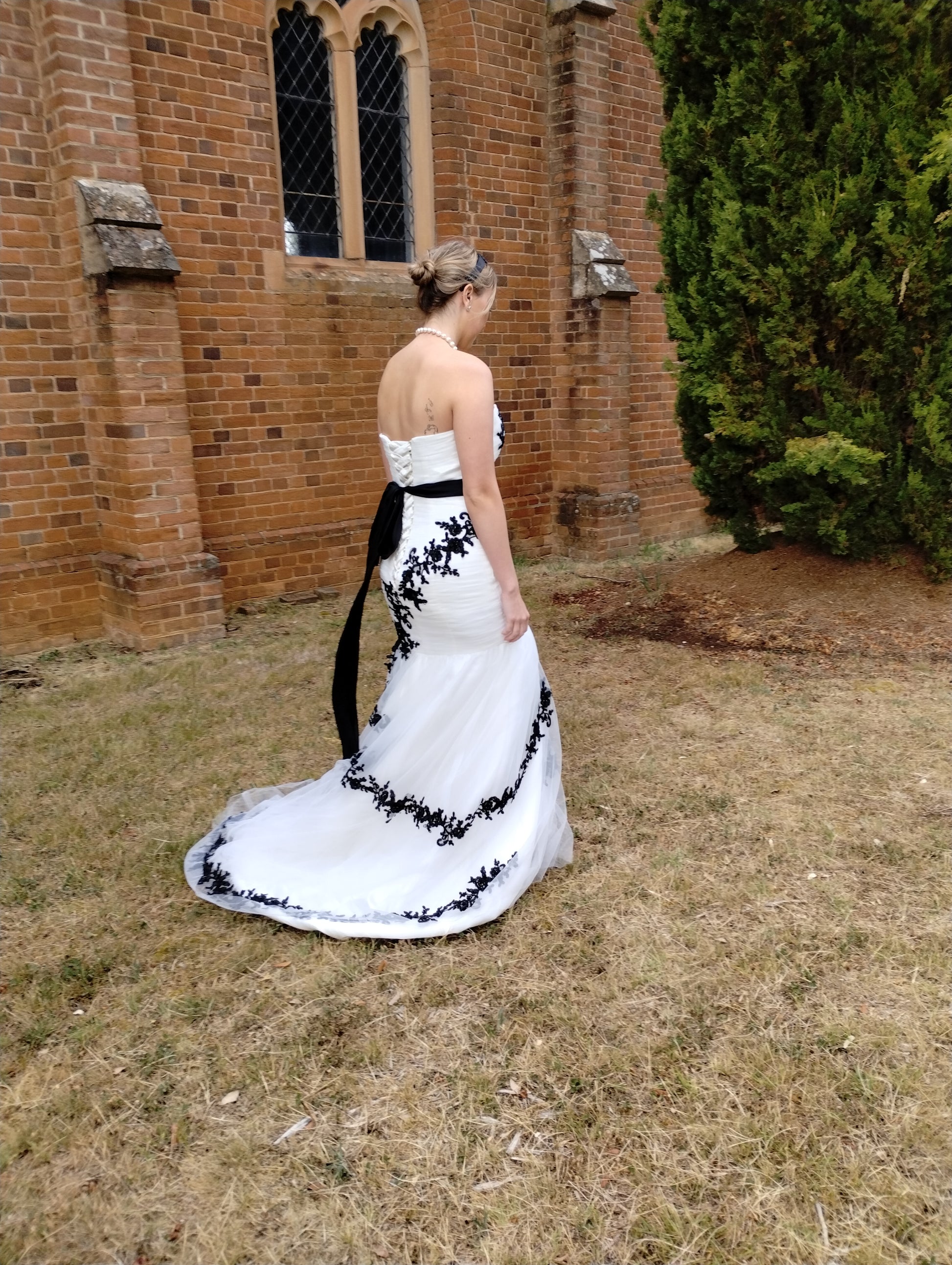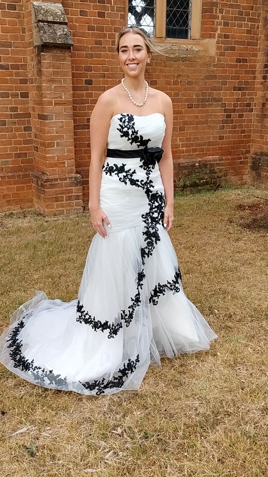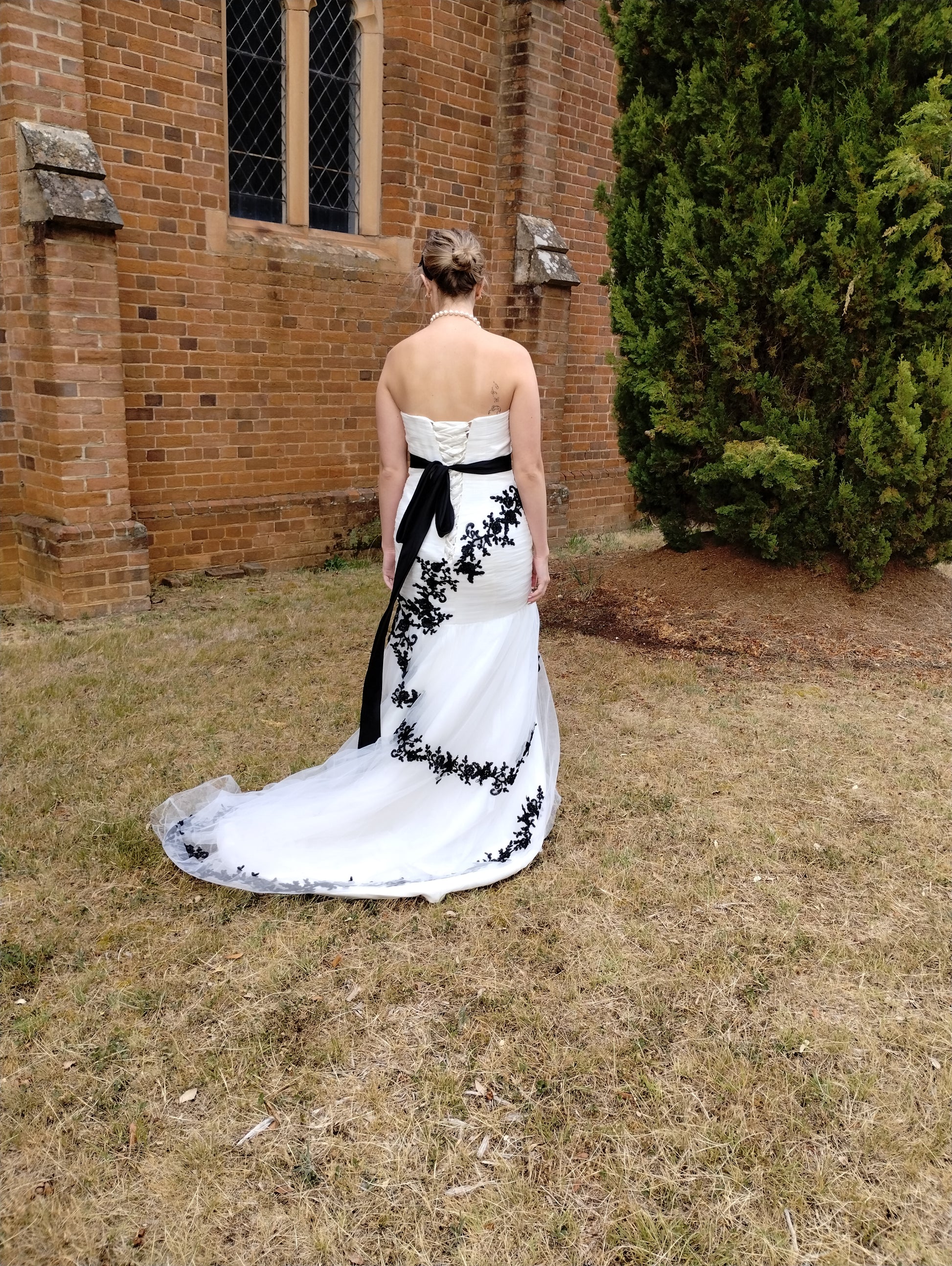 Size 8 white strapless sheath, mermaid skirt with train. Black detail lace across bodice, skirt and hem. Black satin waist bow. Corset bodice.