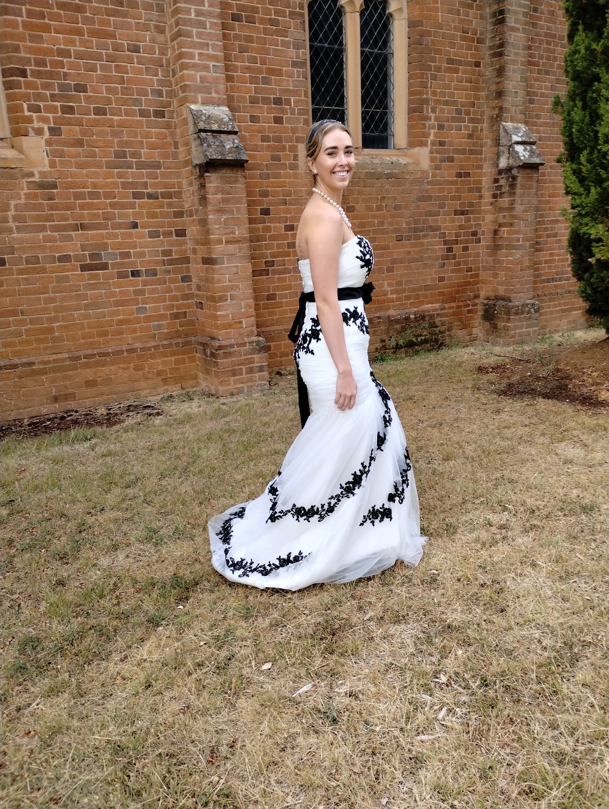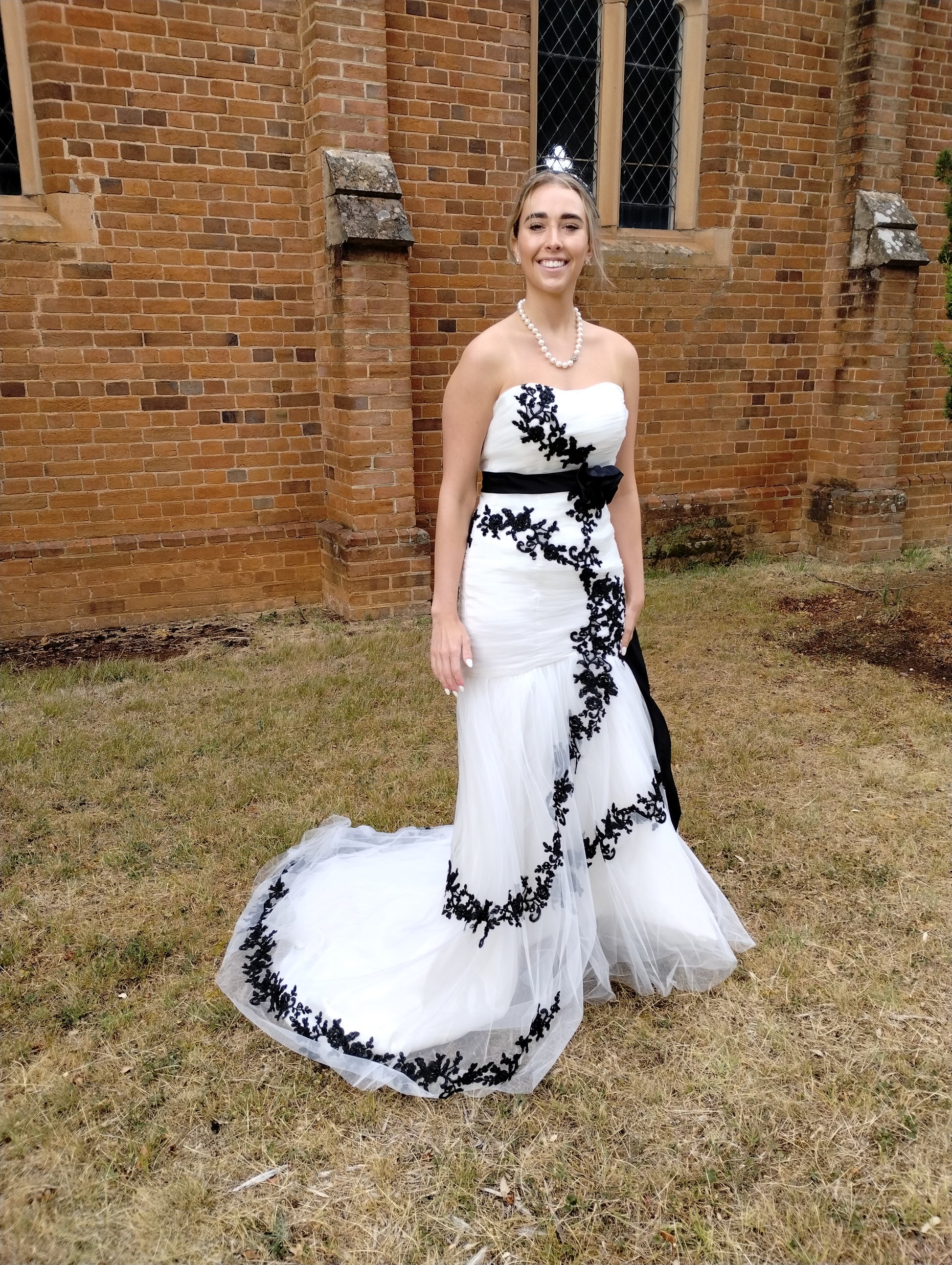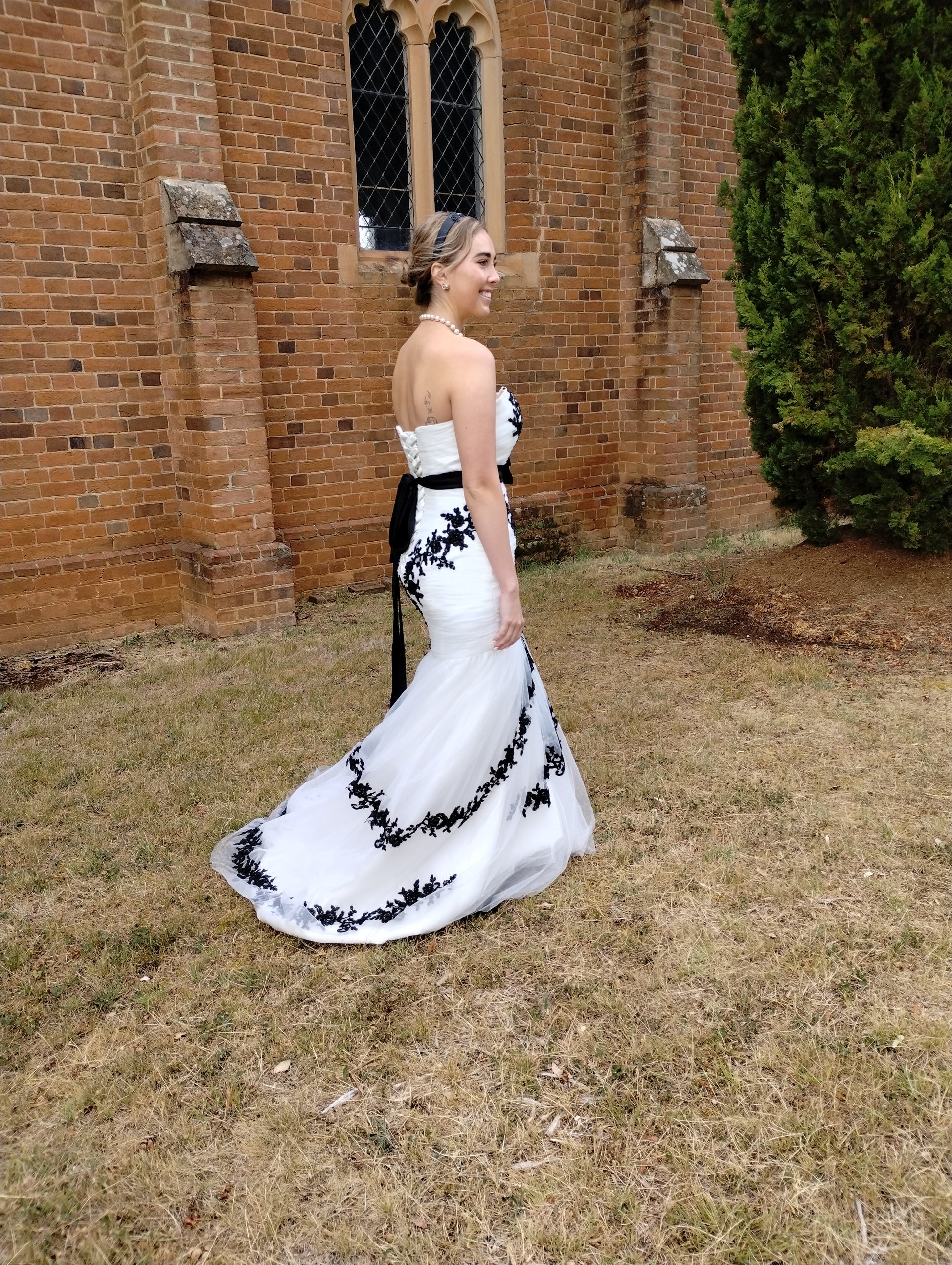 Size 8 white strapless sheath, mermaid skirt with train. Black detail lace across bodice, skirt and hem. Black satin waist bow. Corset bodice.
