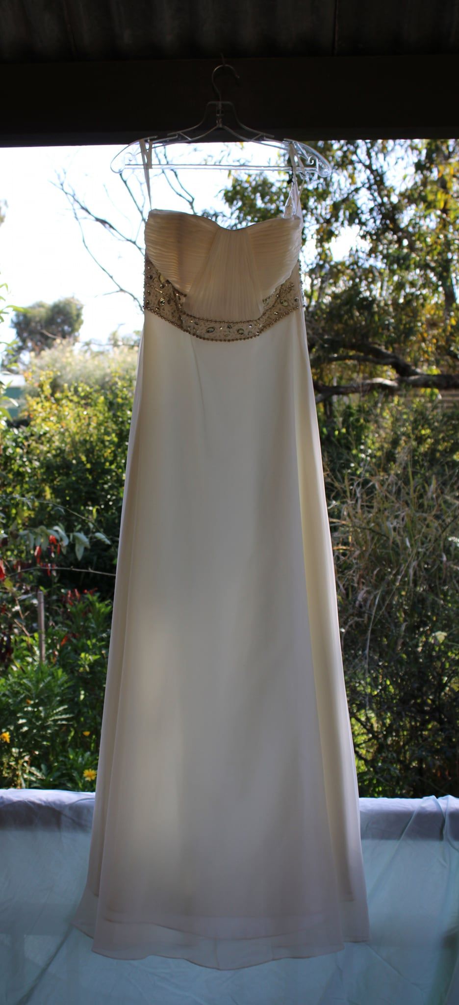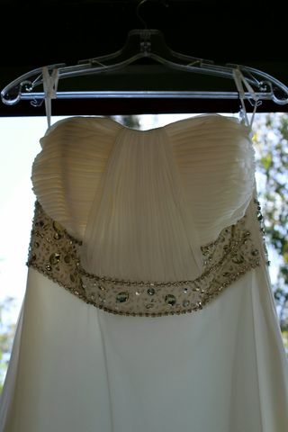 Sheath dress with unusual gathered and draped bodice. Slightly flared skirt.