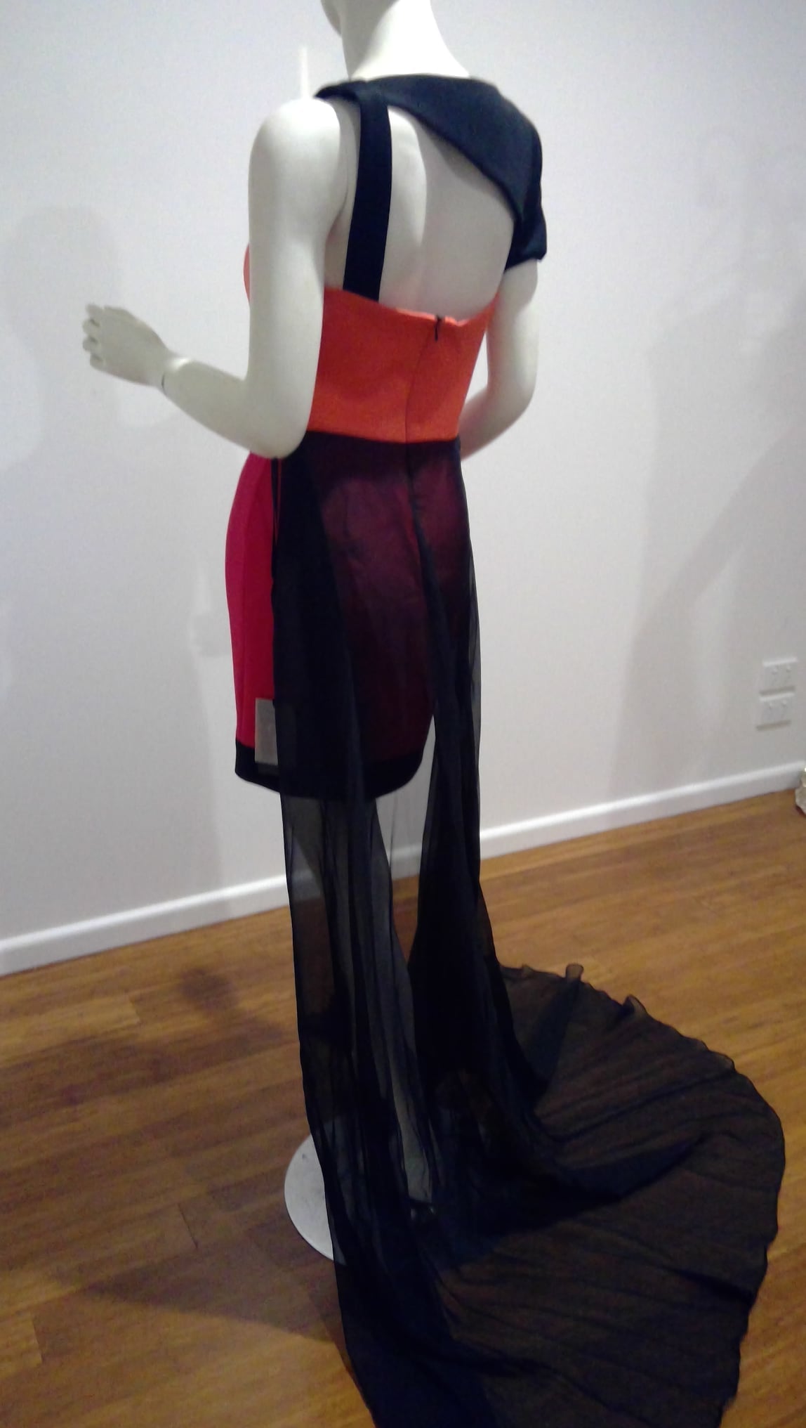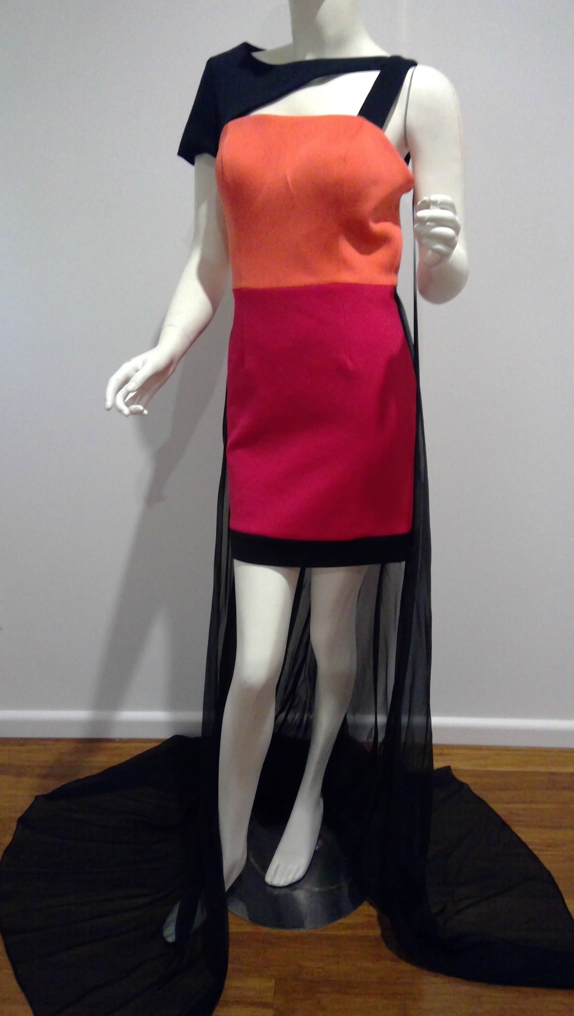 c Size 8 Straight, above the knee length princess line, asymmetric strap and sleeve, terracotta, berry, black with train