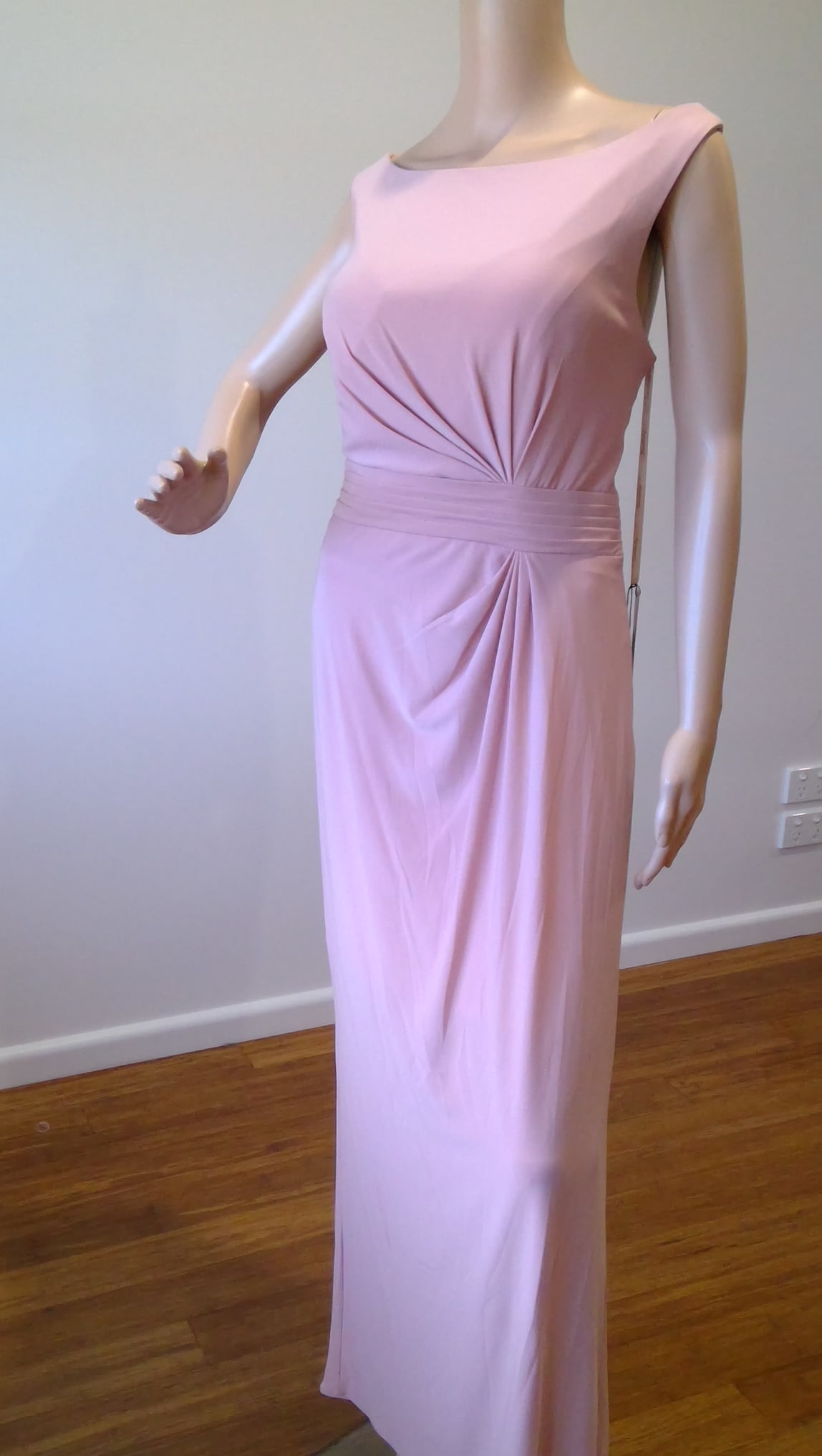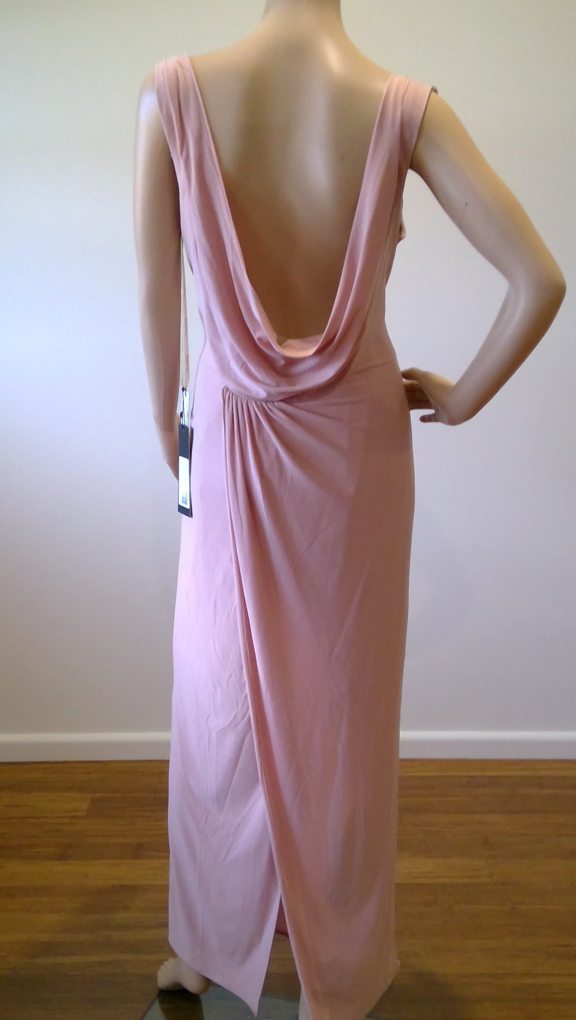 full length length. Interesting gather at waist and bodice and again at back hip. cowl neck deep back. Scoop neckline
