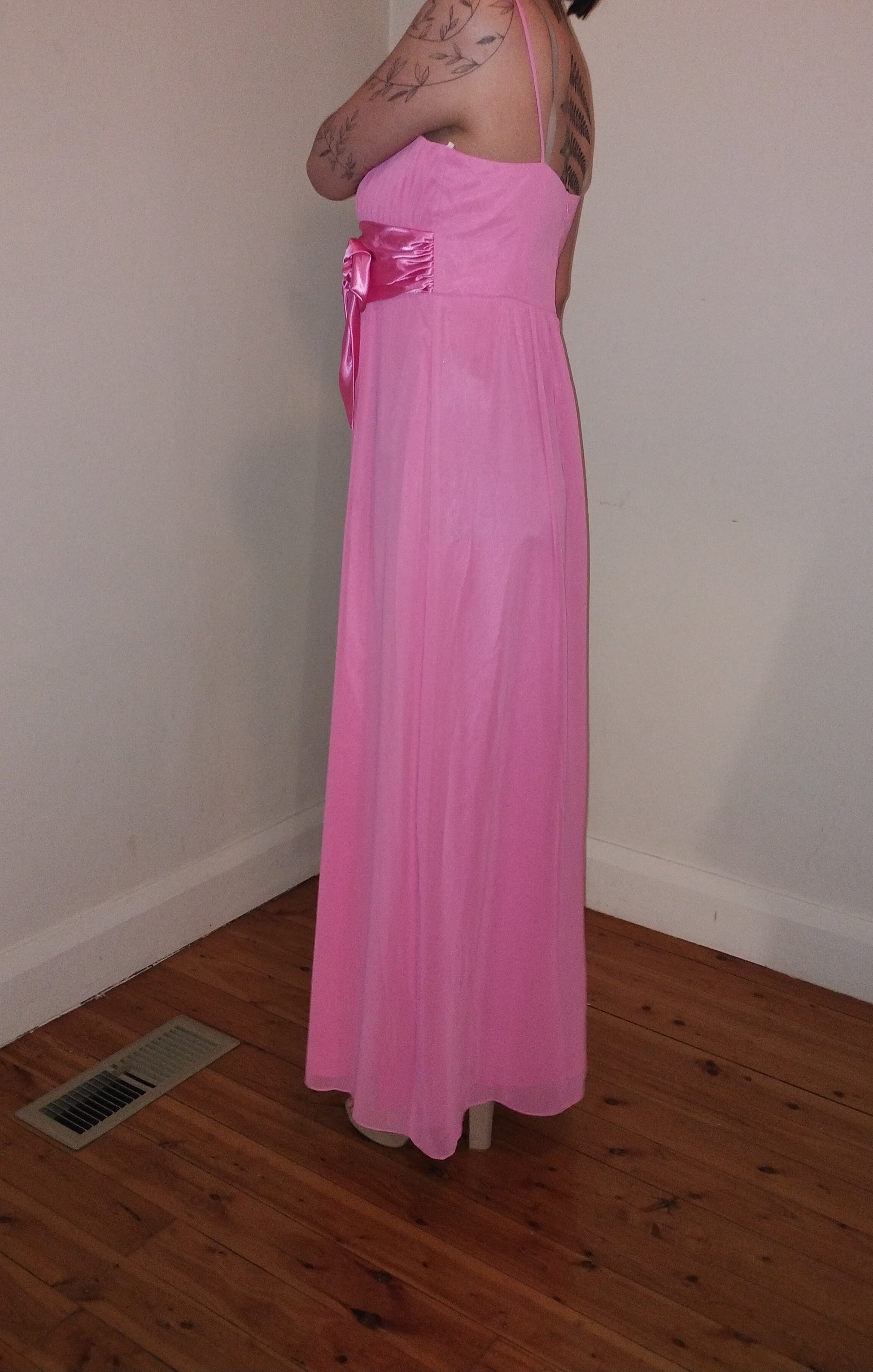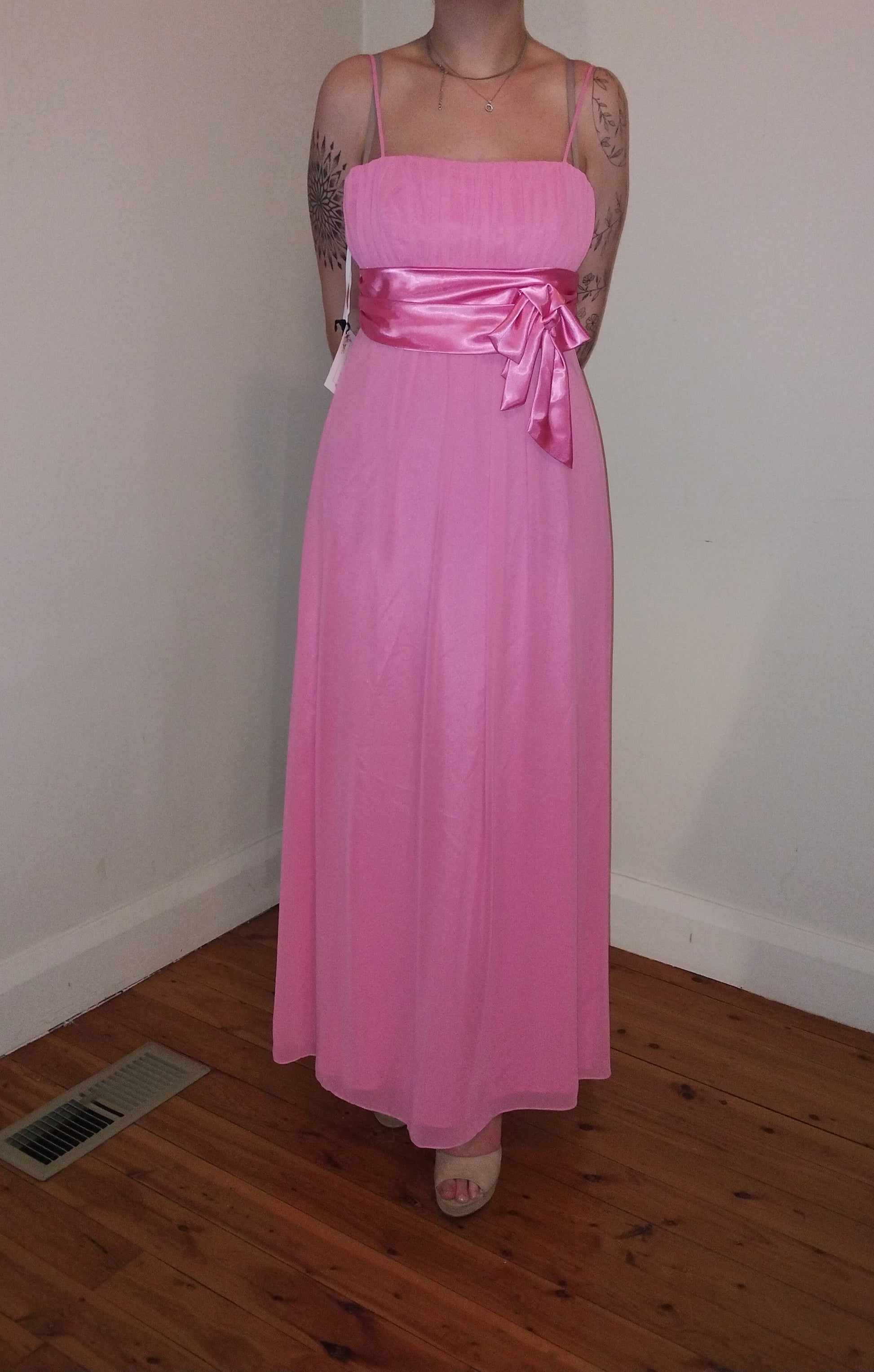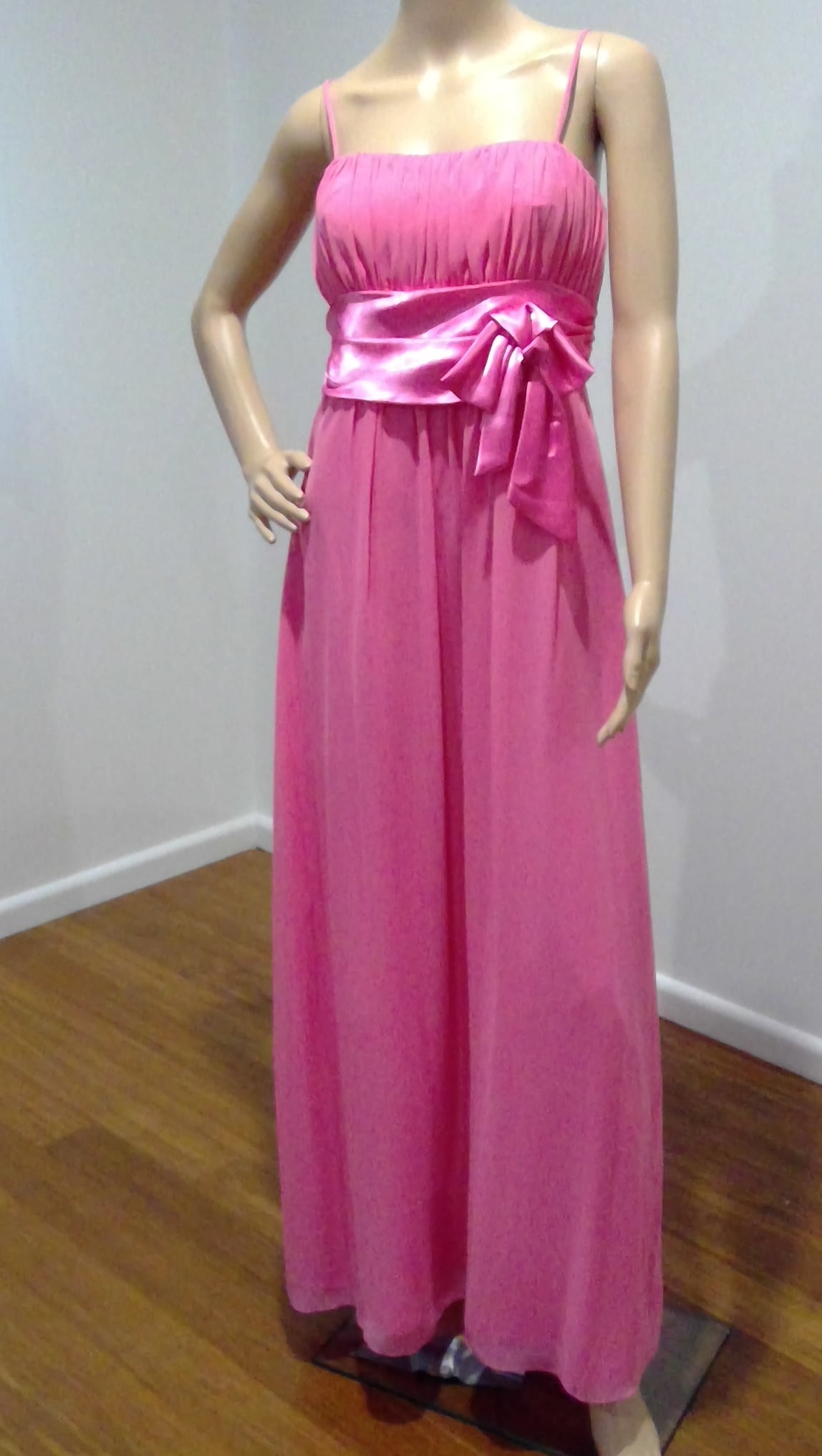 Sweet mid pink full length dress. Spaghetti straps, gathered bodice, wide satin bow at waist, soft skirt of georgette. Designer Wendy Ann.