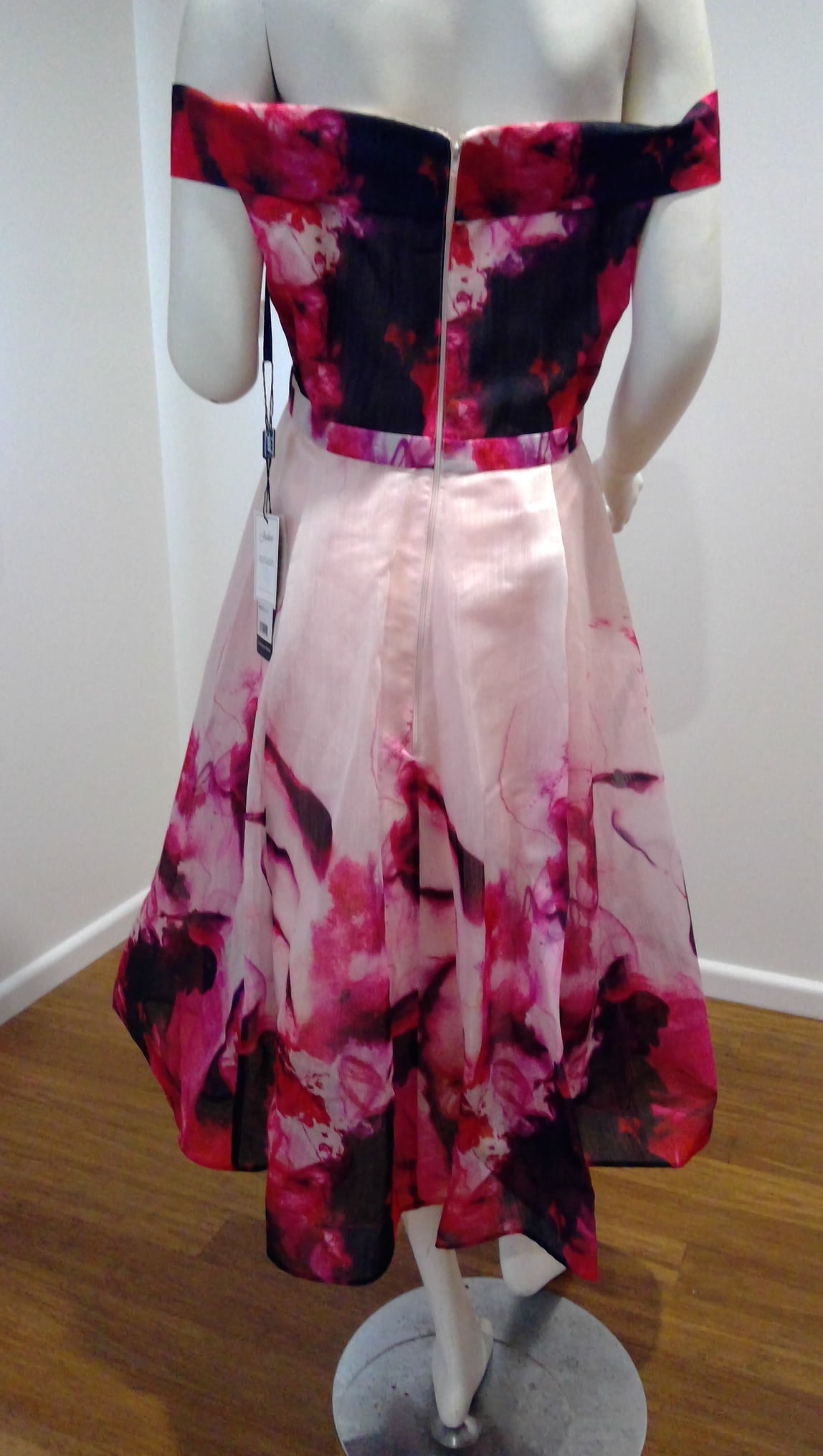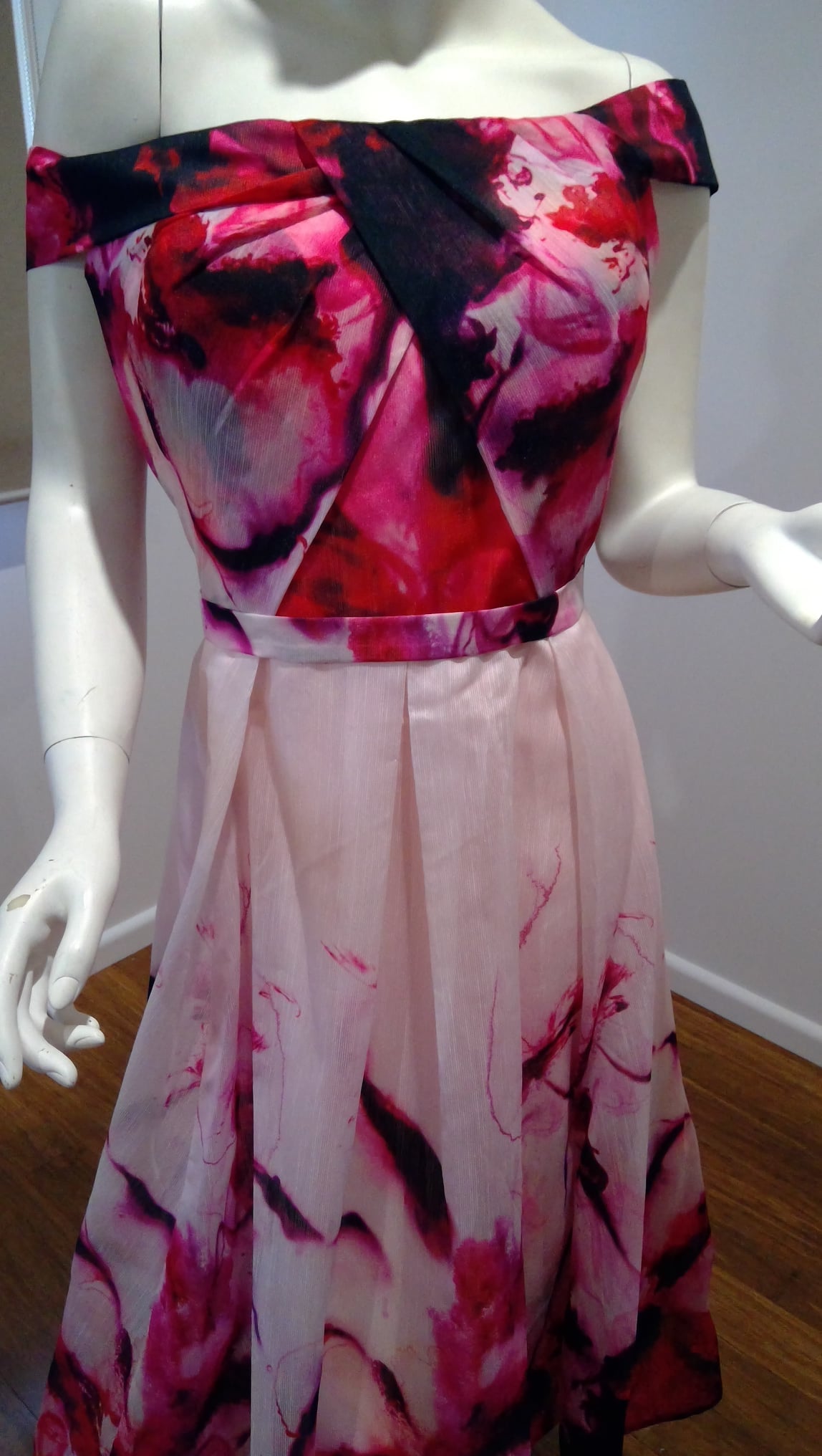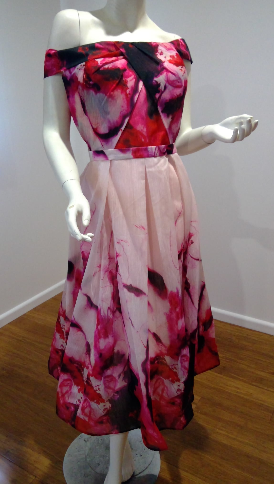 Size 16 Patterned pink off the shoulder dress, fabric belt, full skirt box pleated to below knee