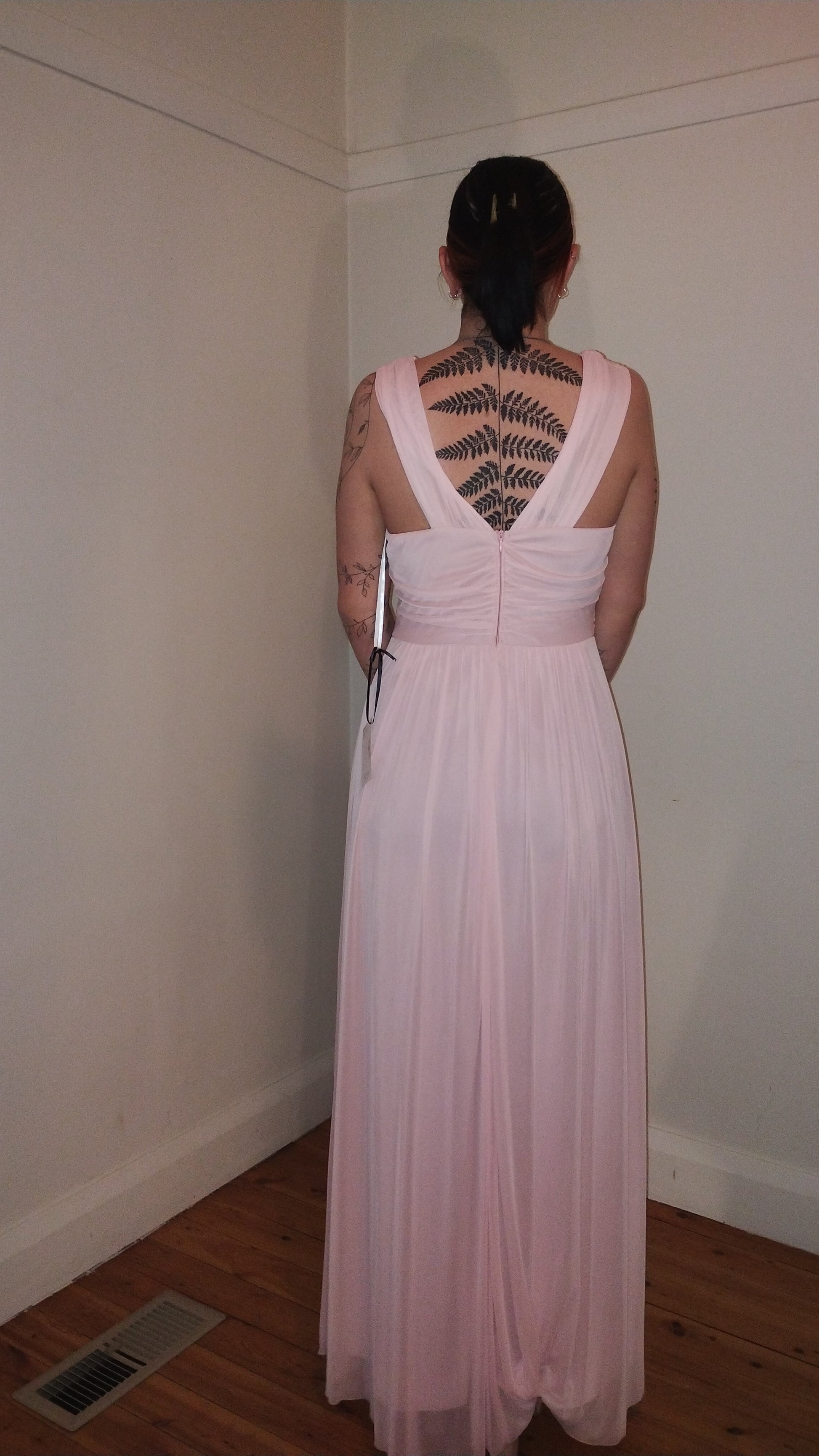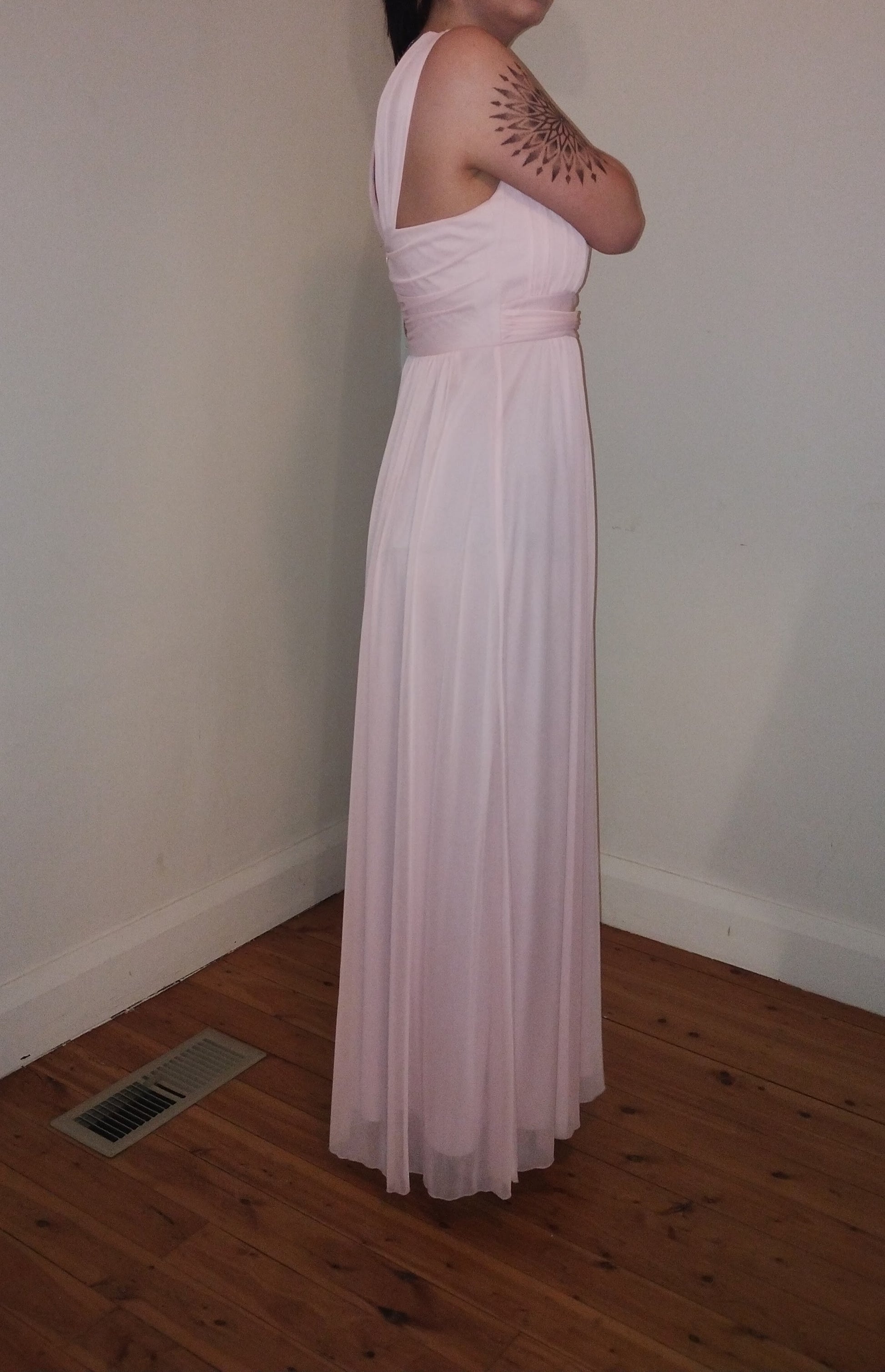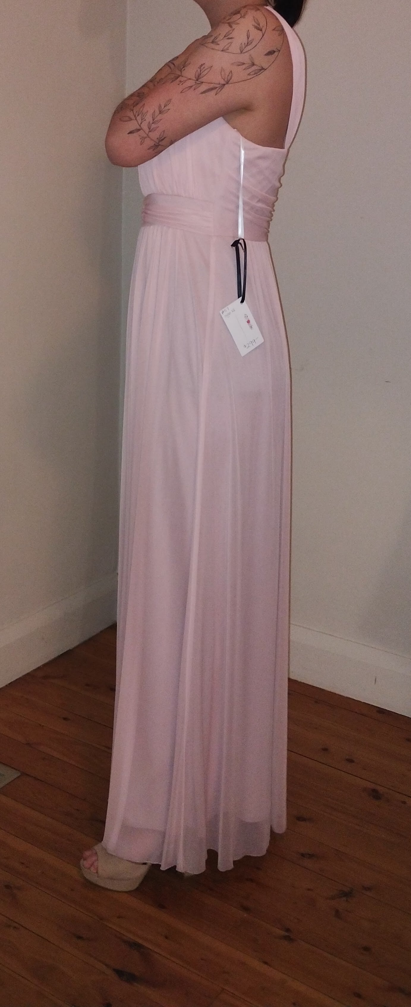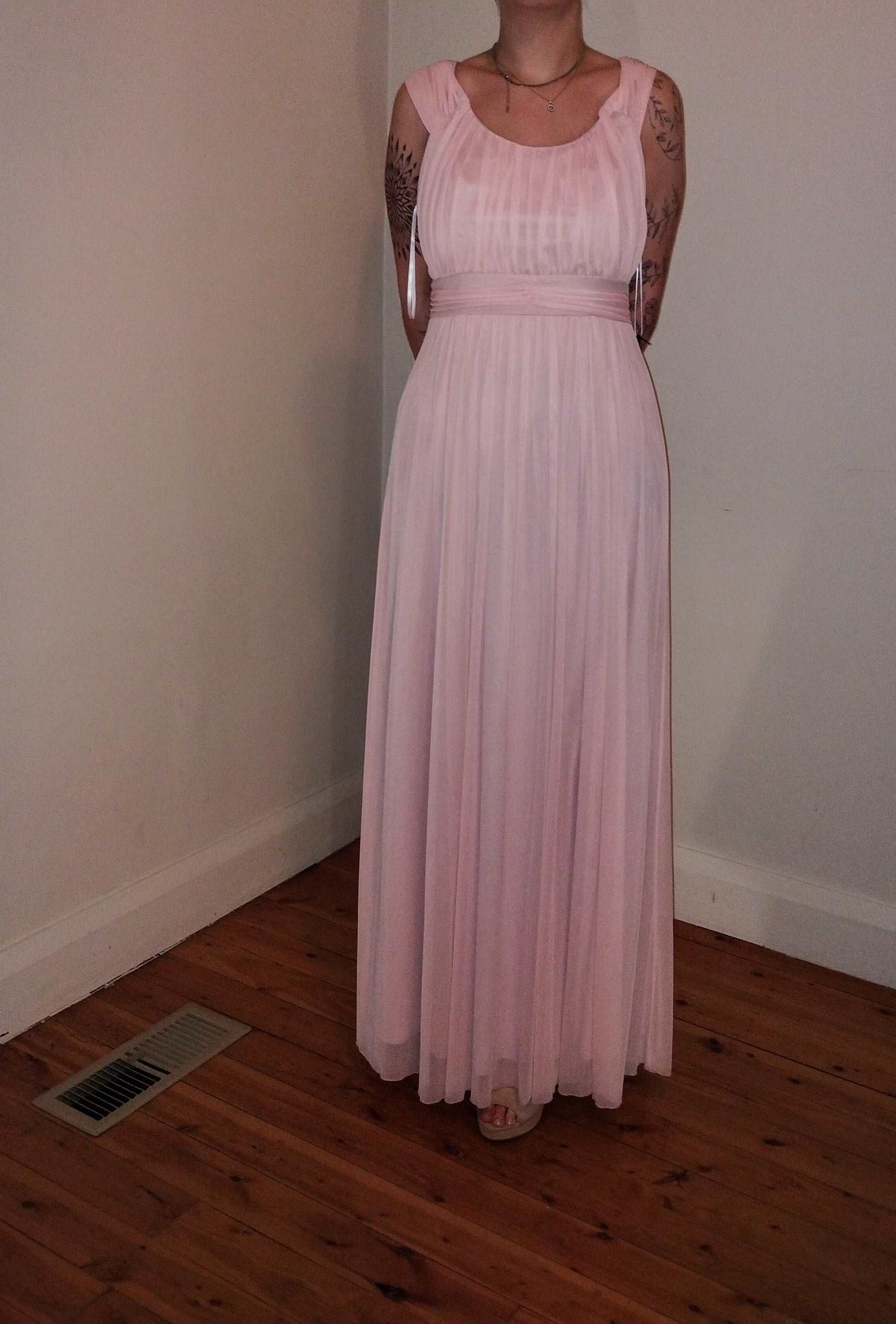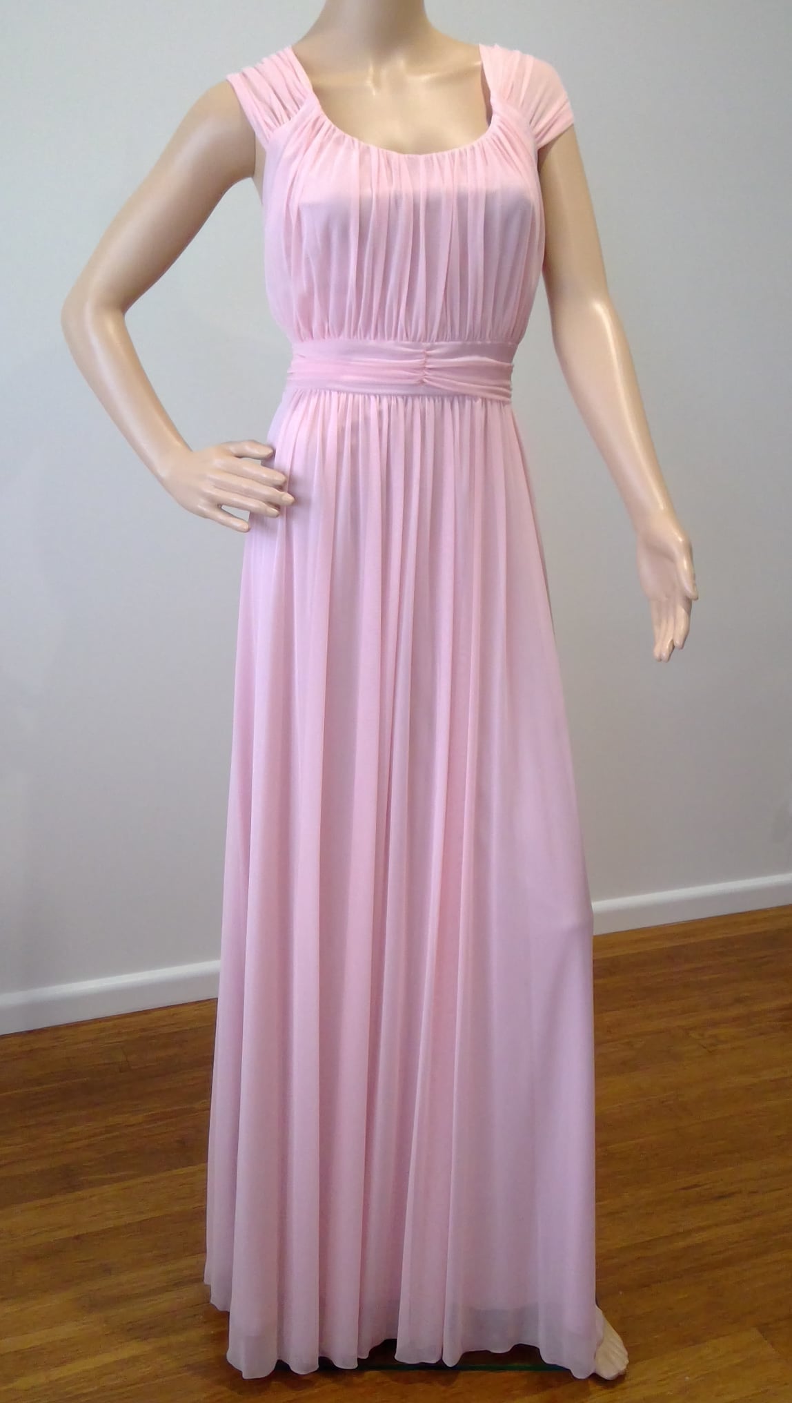 Pale pink long flowy dress. Gathered bodice fabric belt.