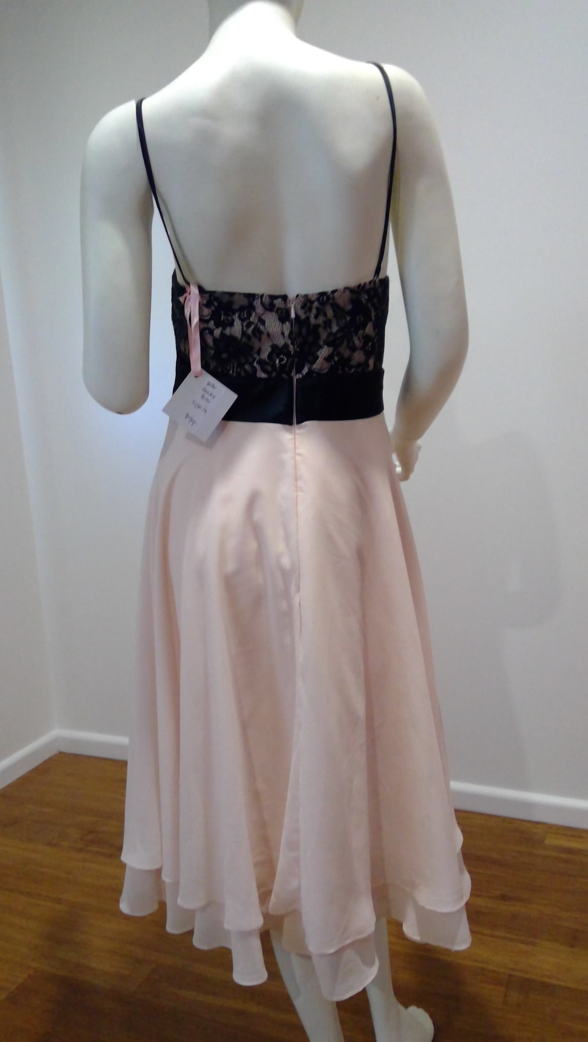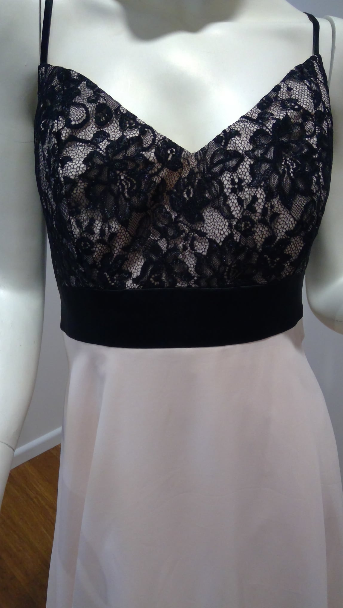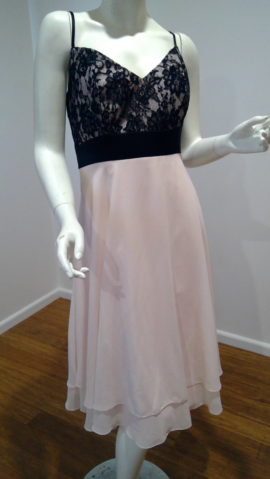 sweetheart neckline, black lace bodice, wide satin waistline detail, below the knee flared skirt with tier