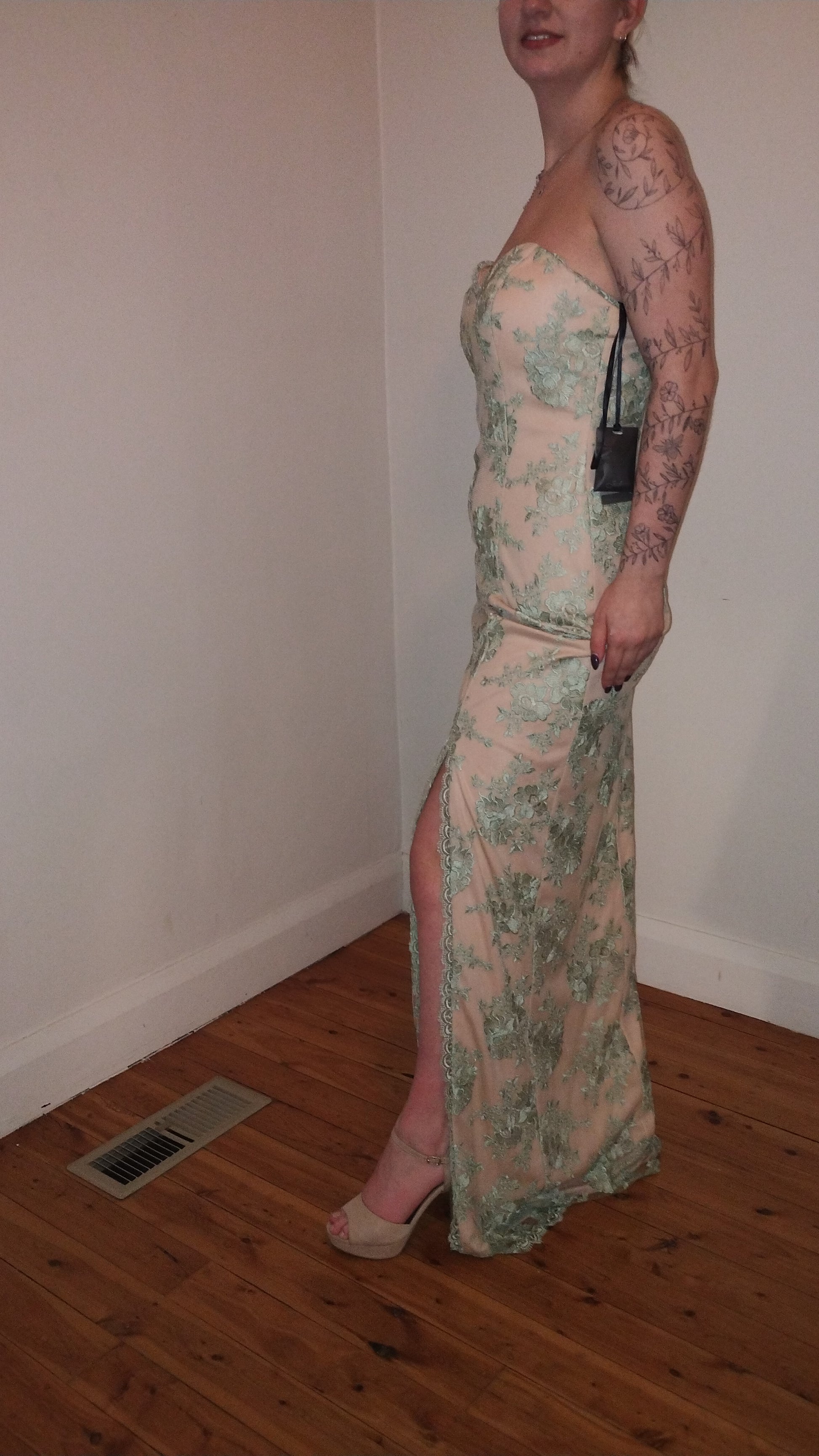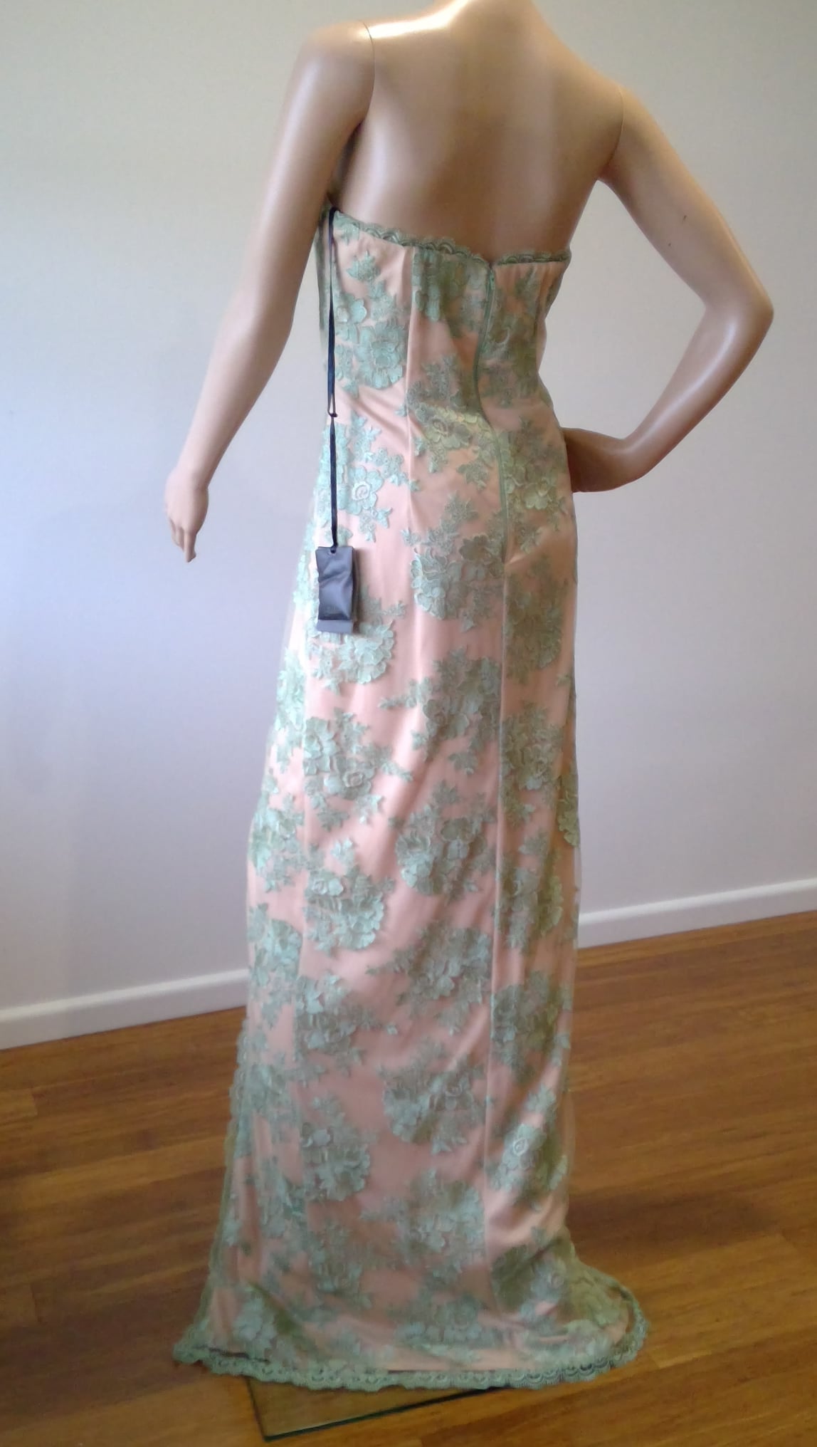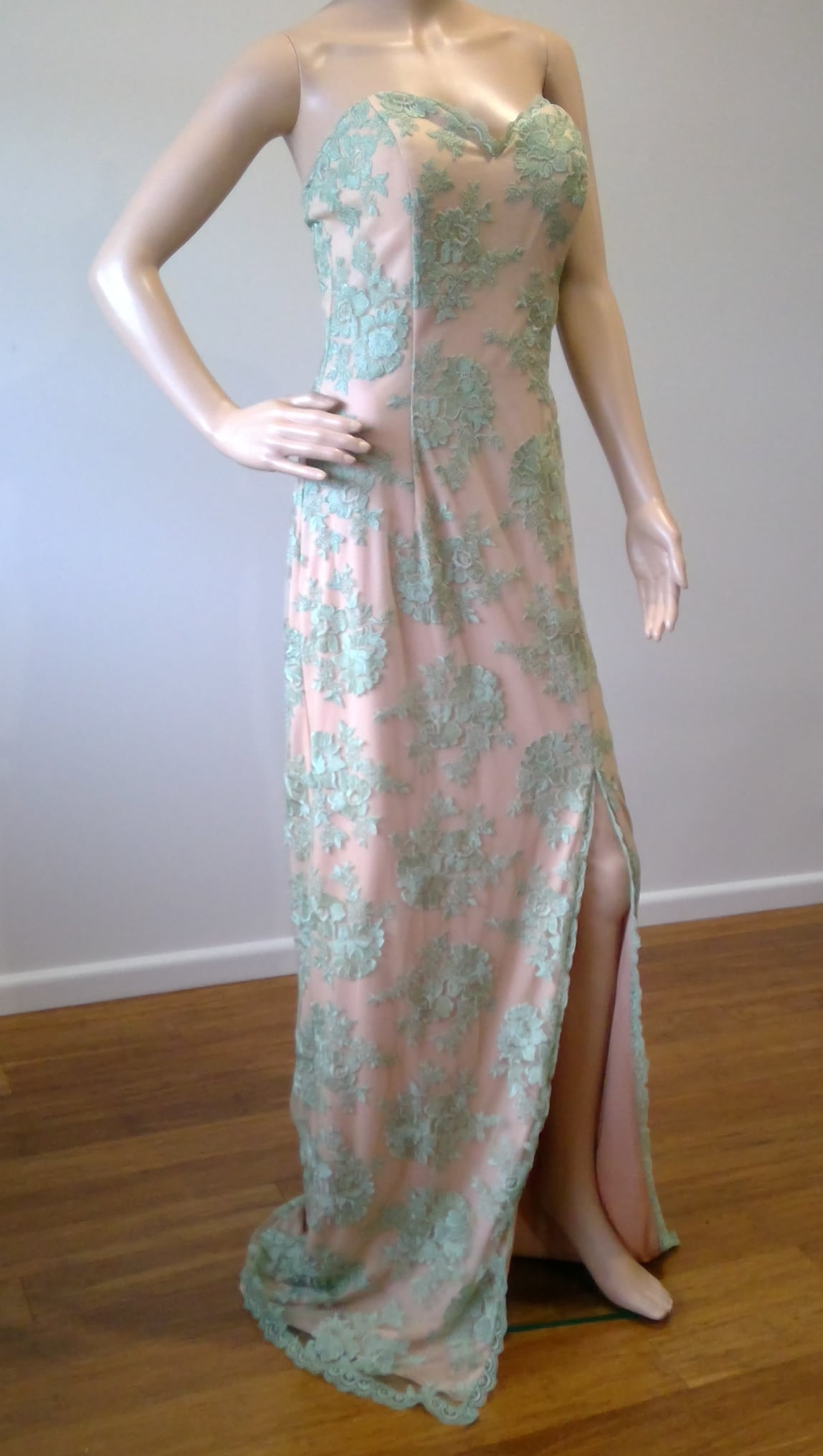 Sheath dress. Sweetheart neckline. Princess line .shell pink with apple green lace overlay. Straight with slit to knee.