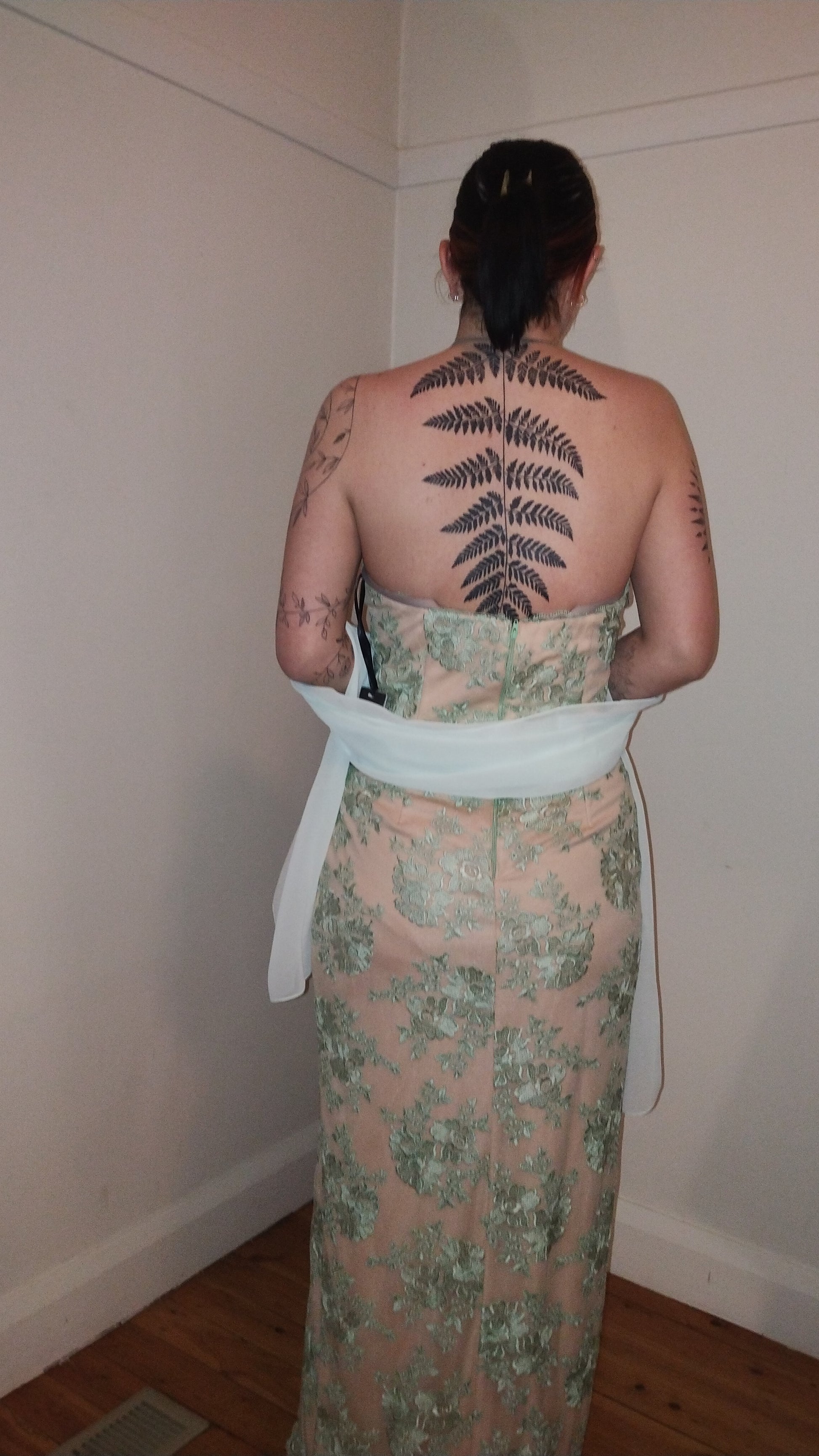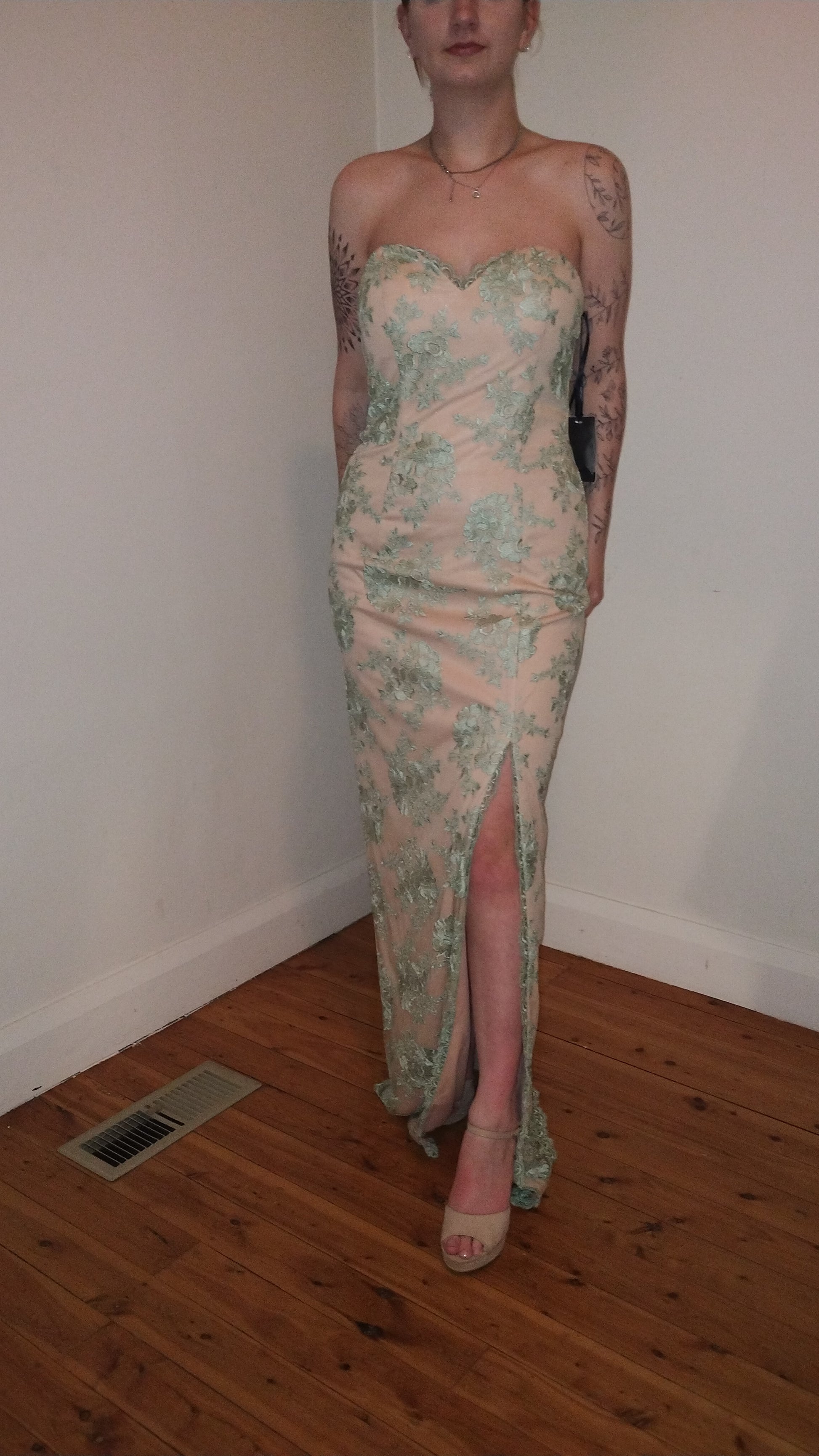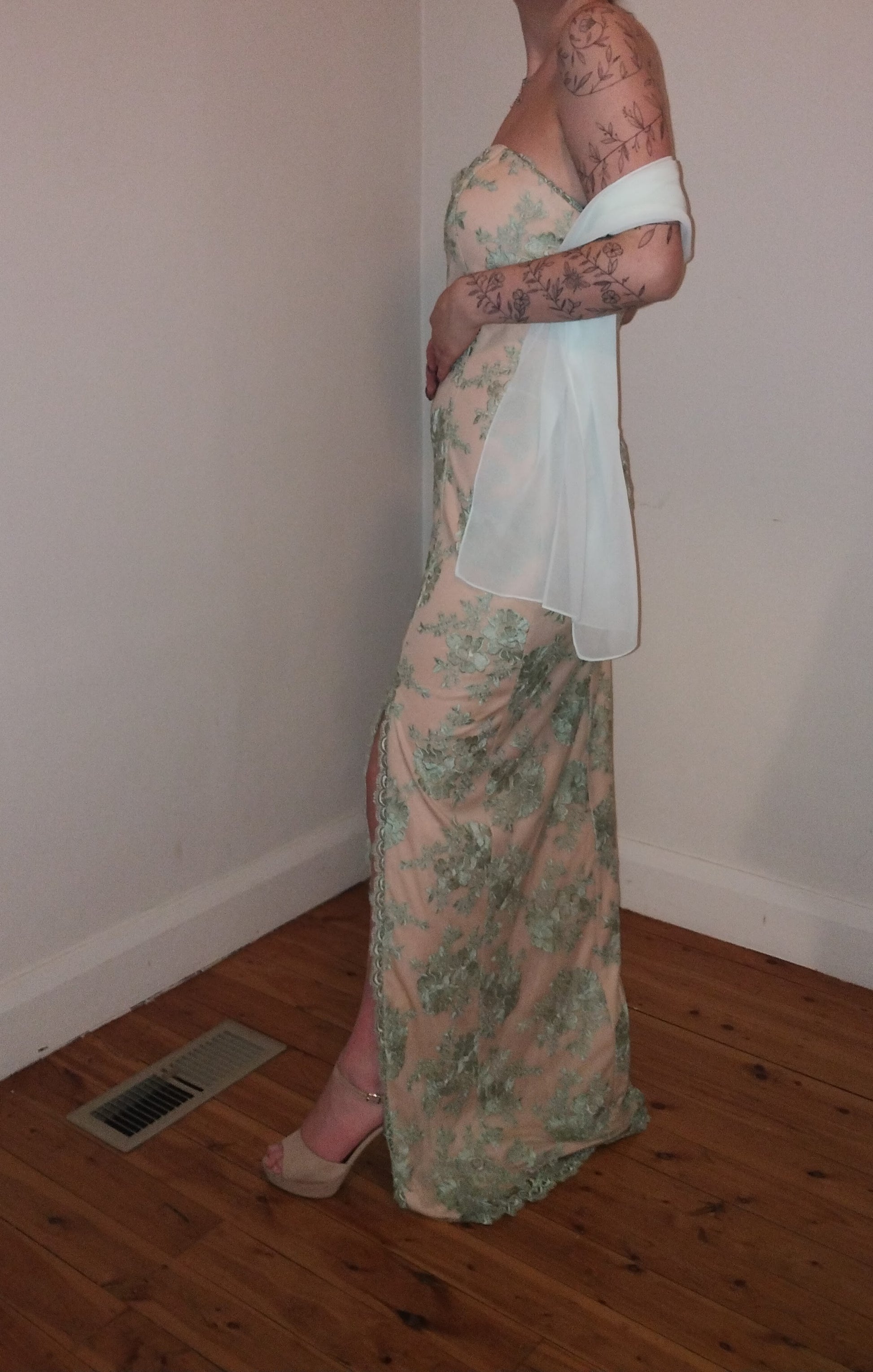 Sheath dress. Sweetheart neckline. Princess line .shell pink with apple green lace overlay. Straight with slit to knee.