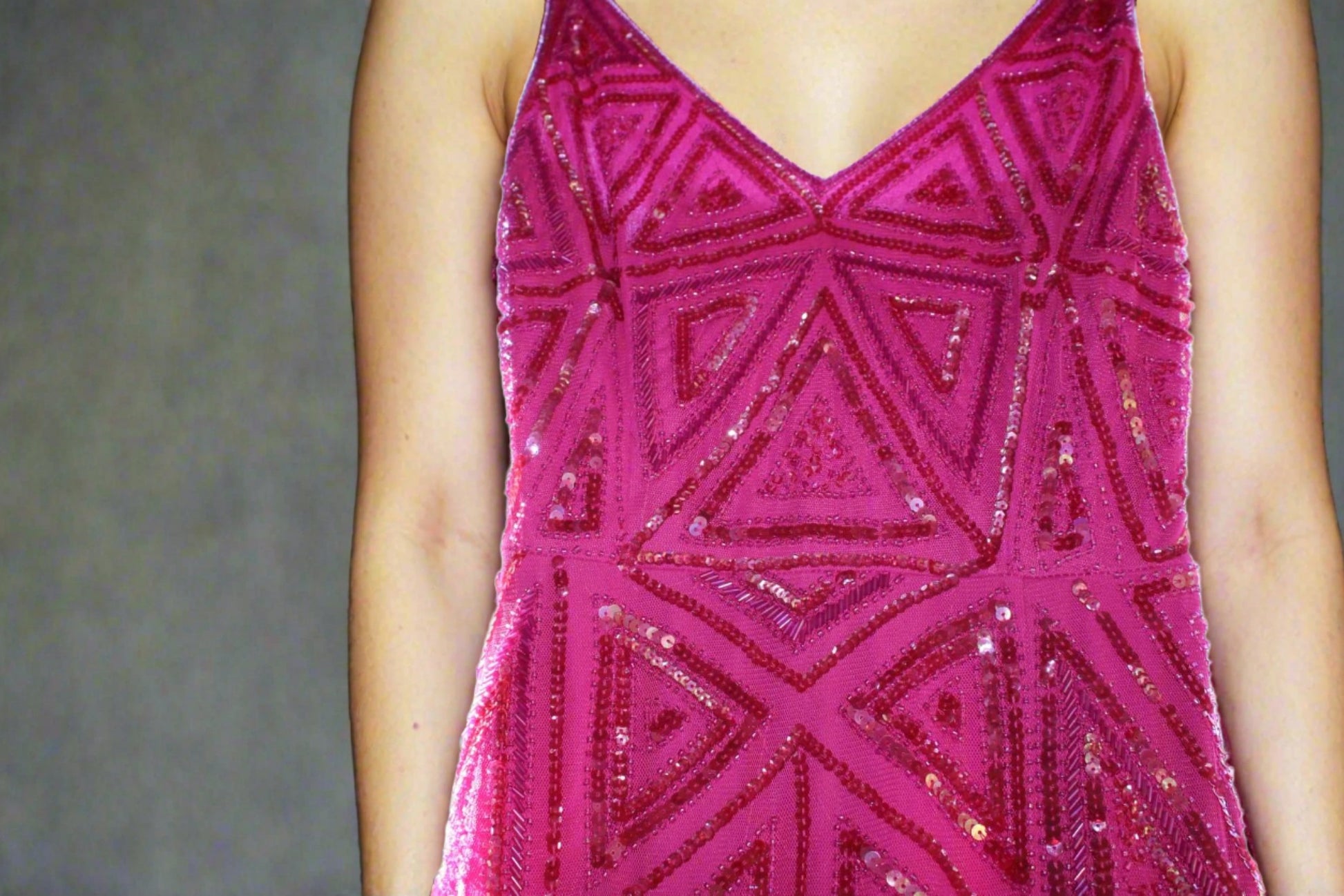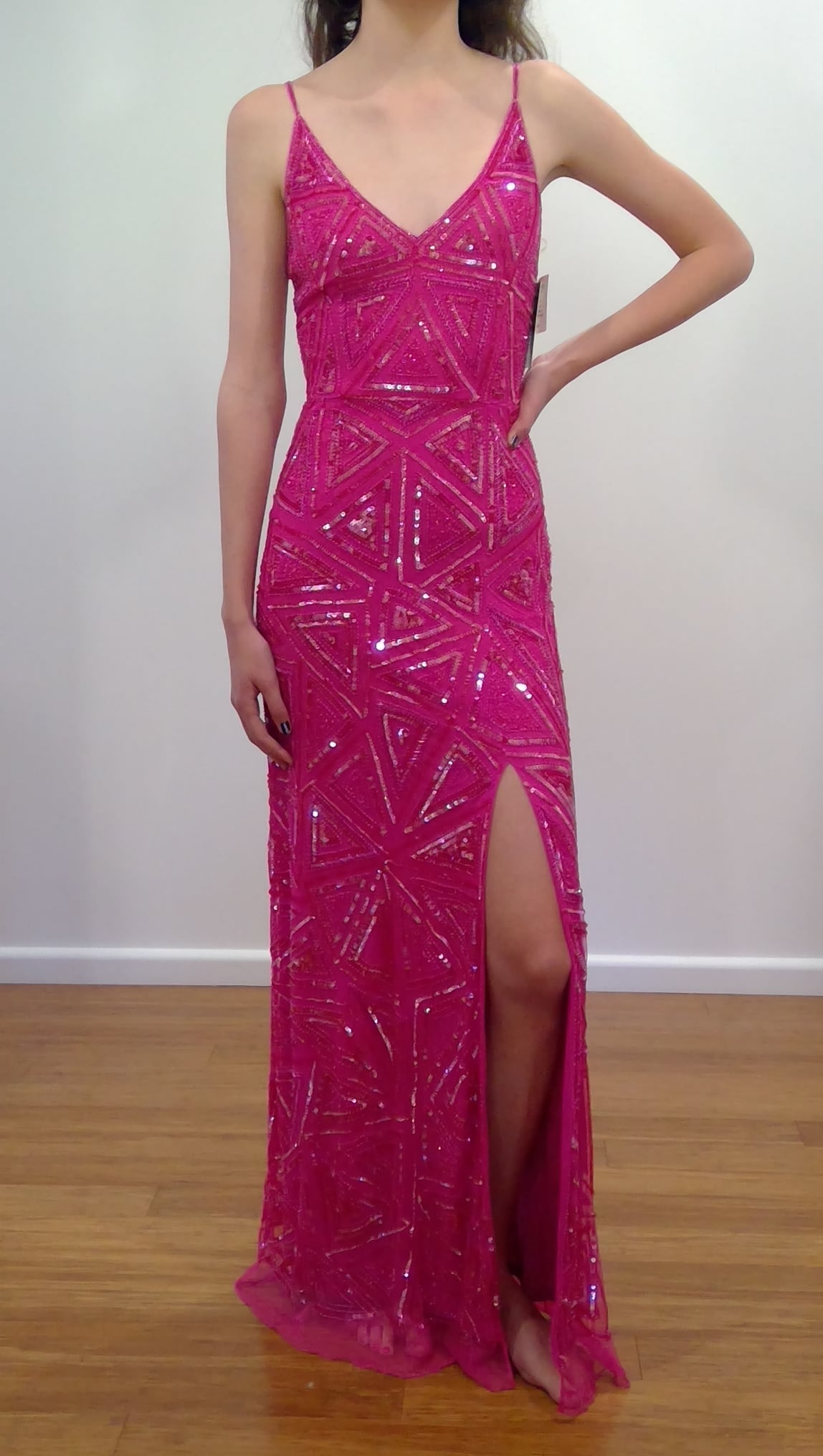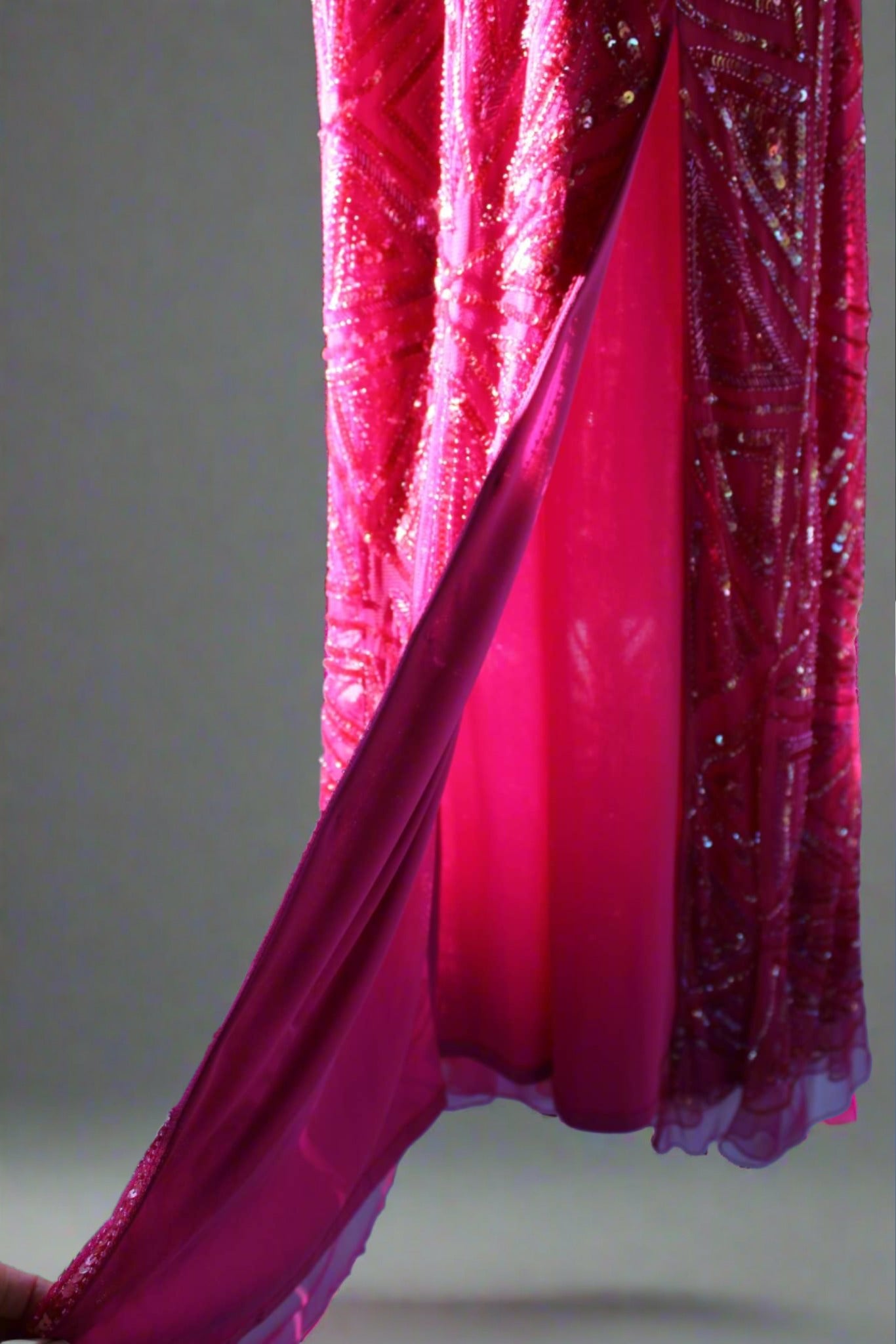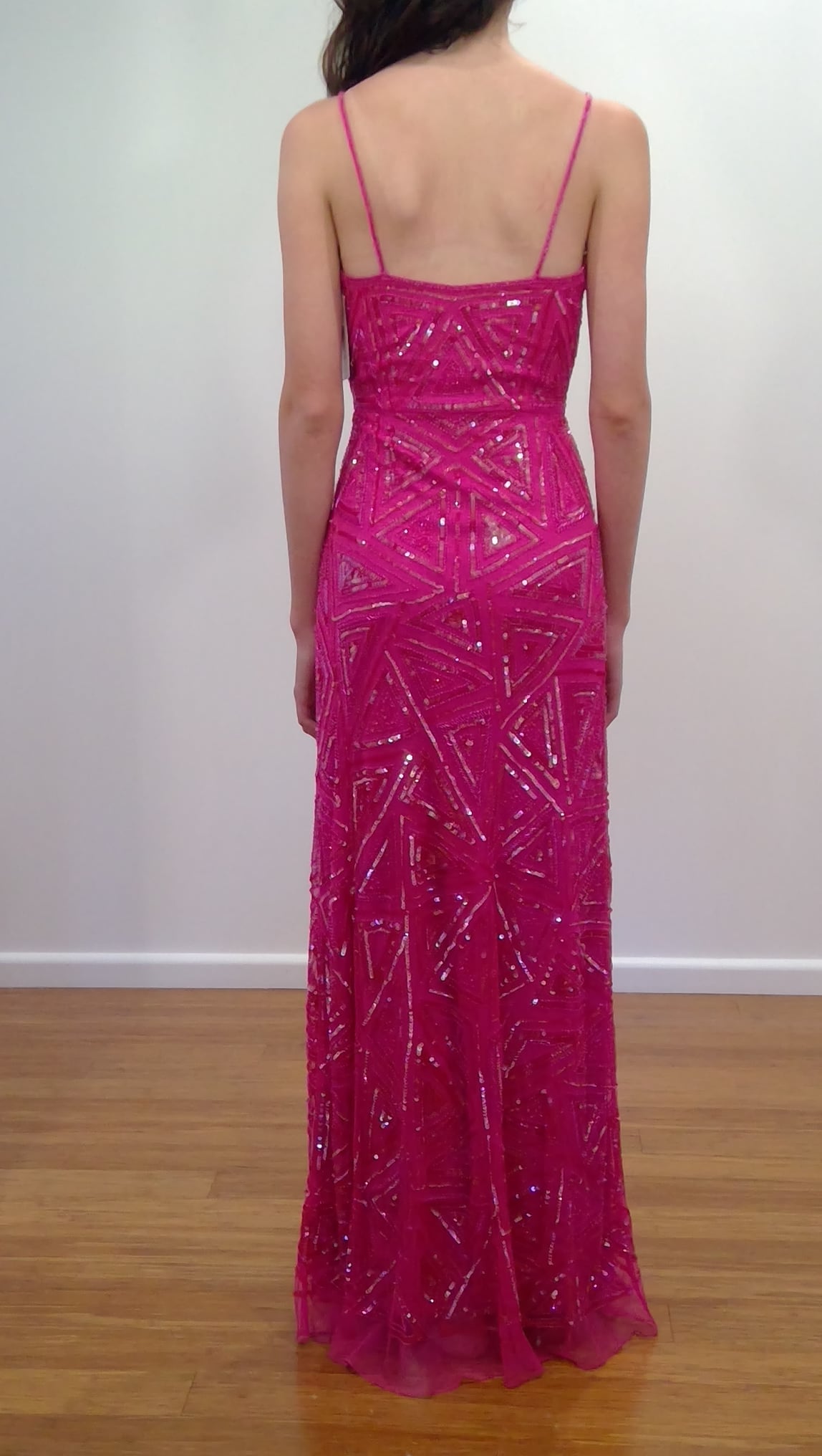 V neckline, spaghetti straps, geometric sequinned pattern, hot pink, soft a line, floor length, slit to above knee.