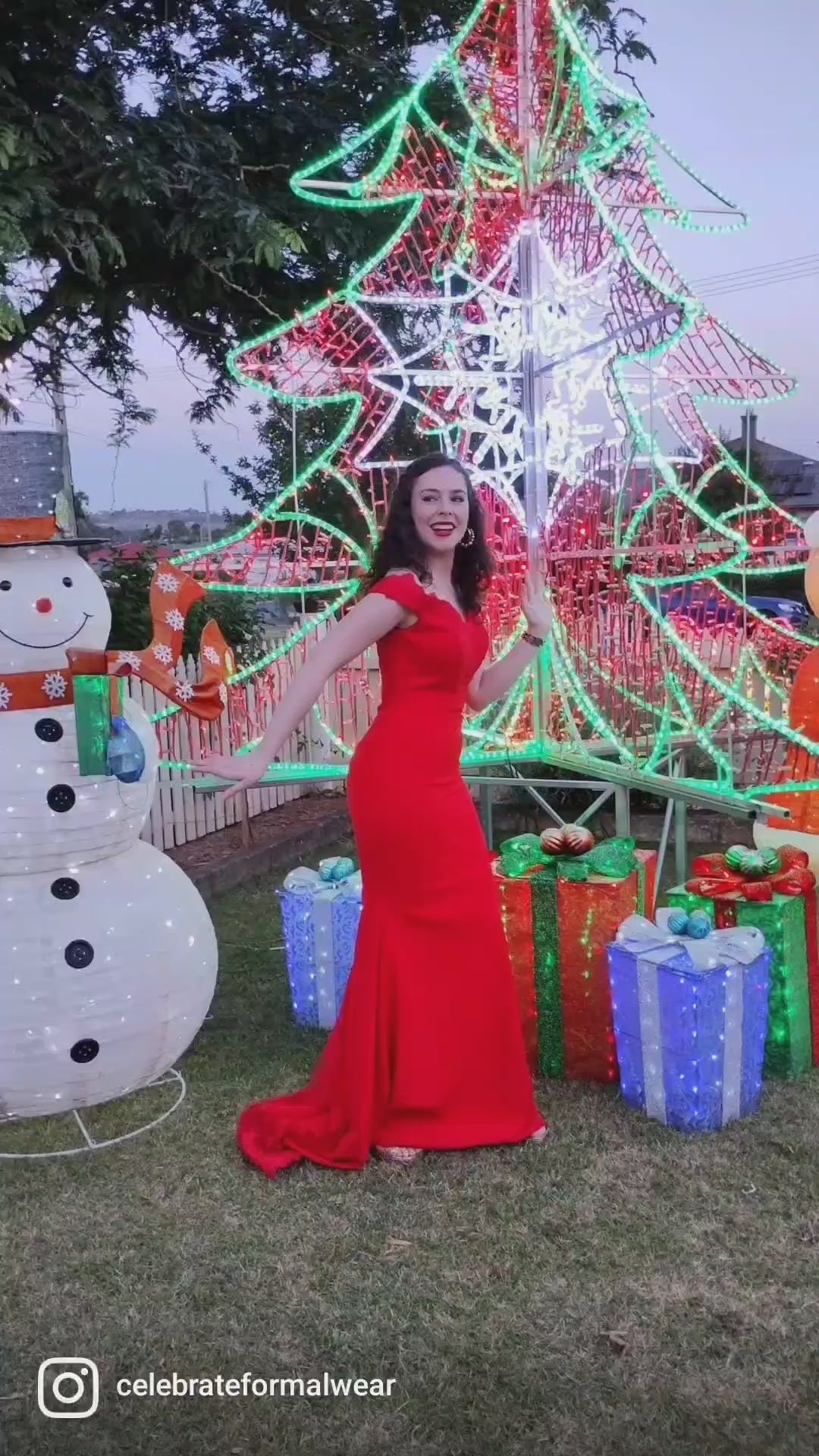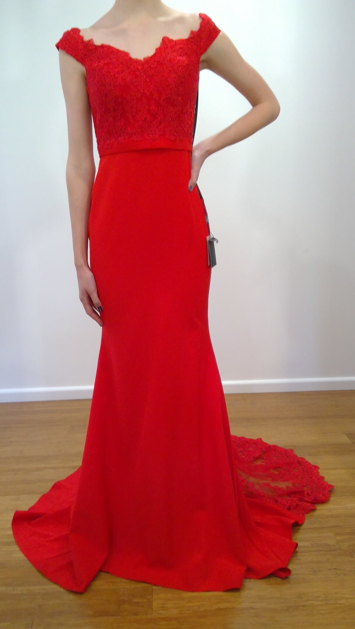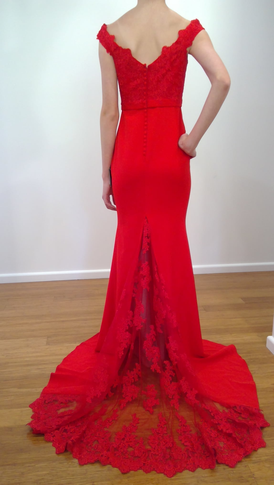 Red lace bodice, off the the shoulder, scalloped edge neckline. straight skirt flares after knee, insert lace in chapel train.