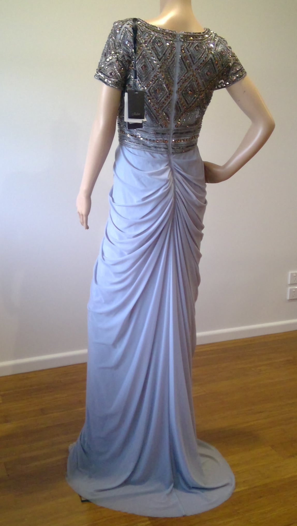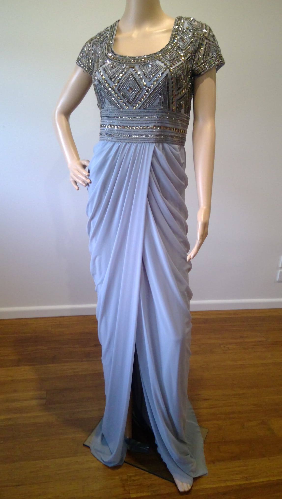 short sleeved ,rounded square neckline. geometric silver beaded bodice and sleeves. Grecian drape skirt with front split, ruched skirt back.