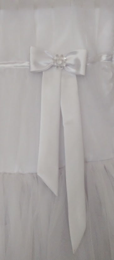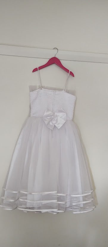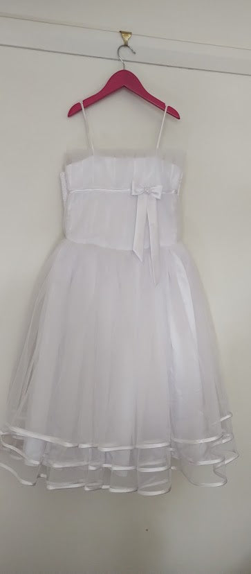 Sweet white size 8 child's dress. spaghetti straps. tulle bodice with satin bow detail. triple layer tulle skirt edged in satin ribbon.