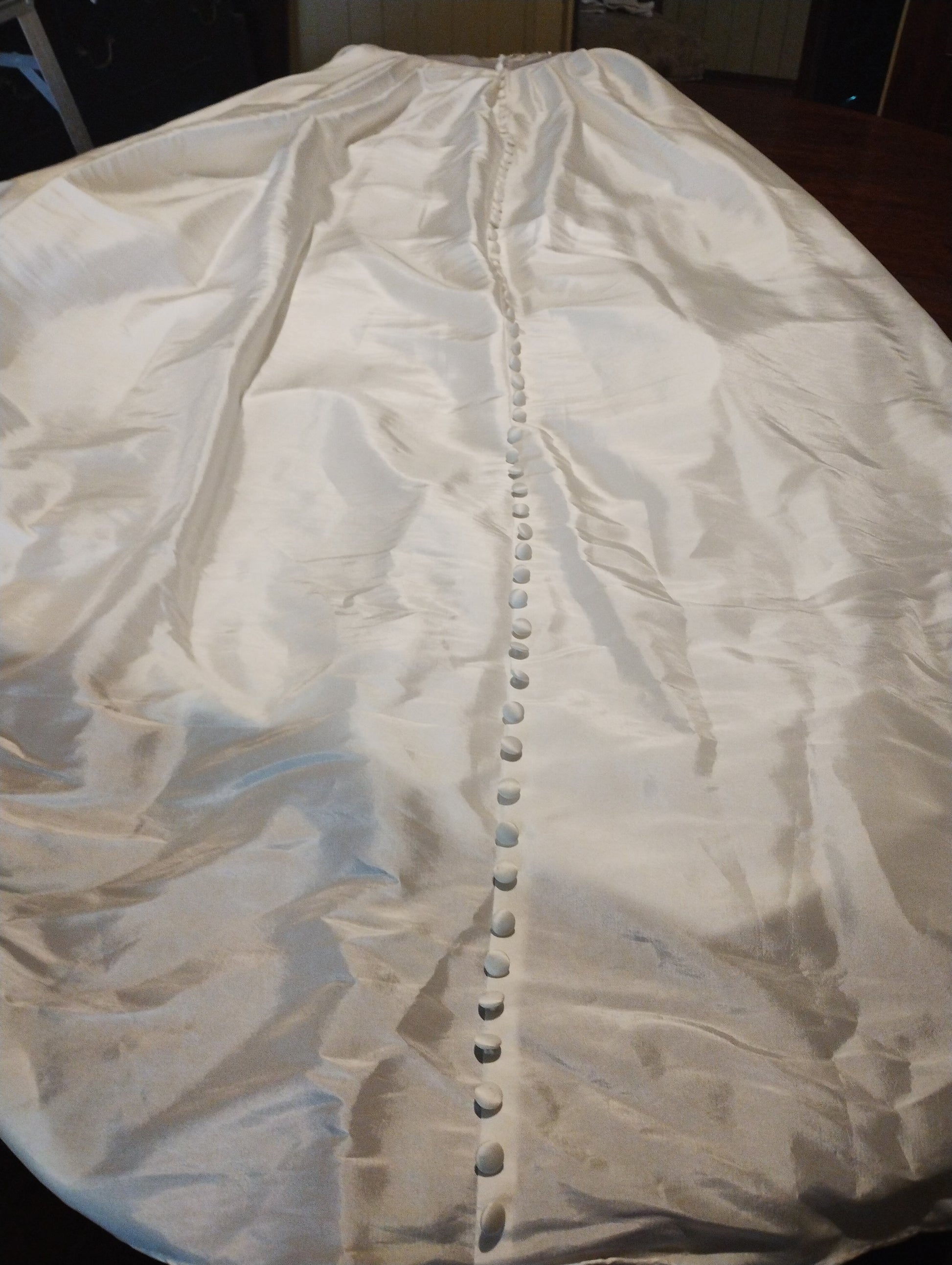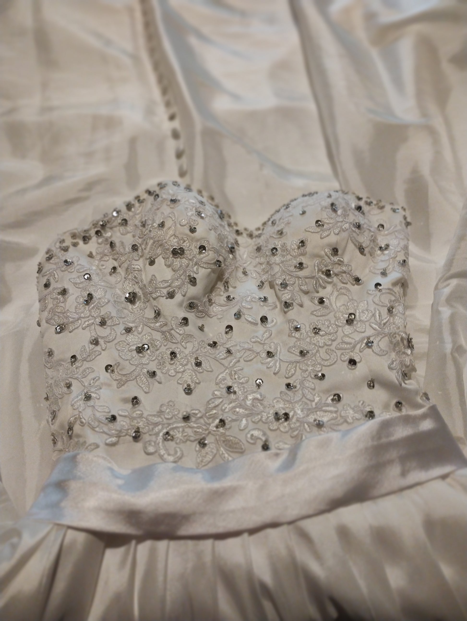 Sheath dress sequinned bodice. Satin covered buttons down entire back length of dress. Petticoats to maintain full skirt. Discreet elastic strap across back.