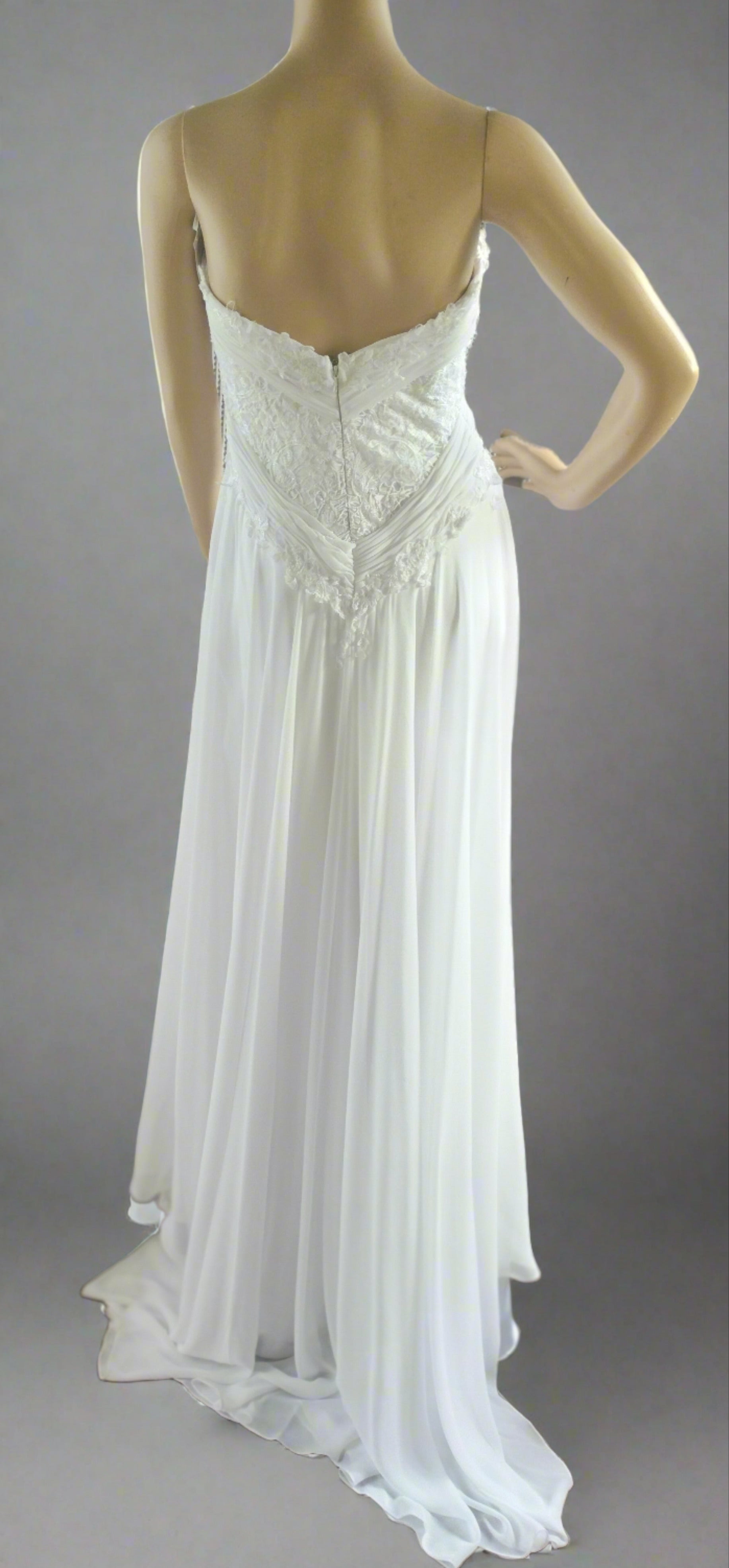 Sheath dress. Sweetheart lace bodice. Accented with georgette, twisted at décolletage then taken round bodice at neckline and waist. soft flowy overskirt, parted at centre waist to reveal satin underskirt.