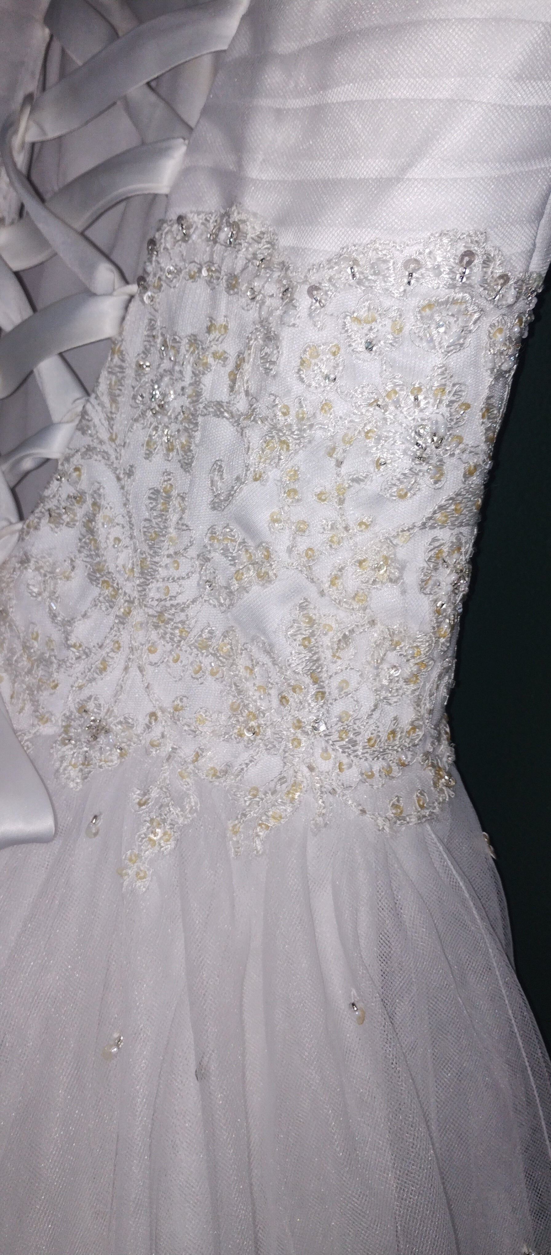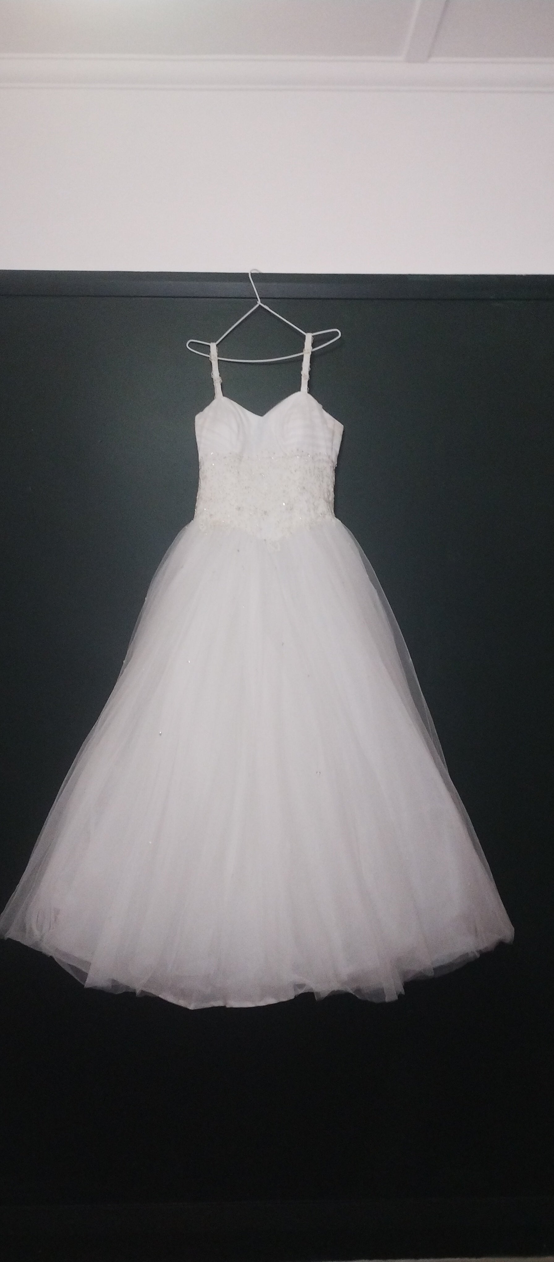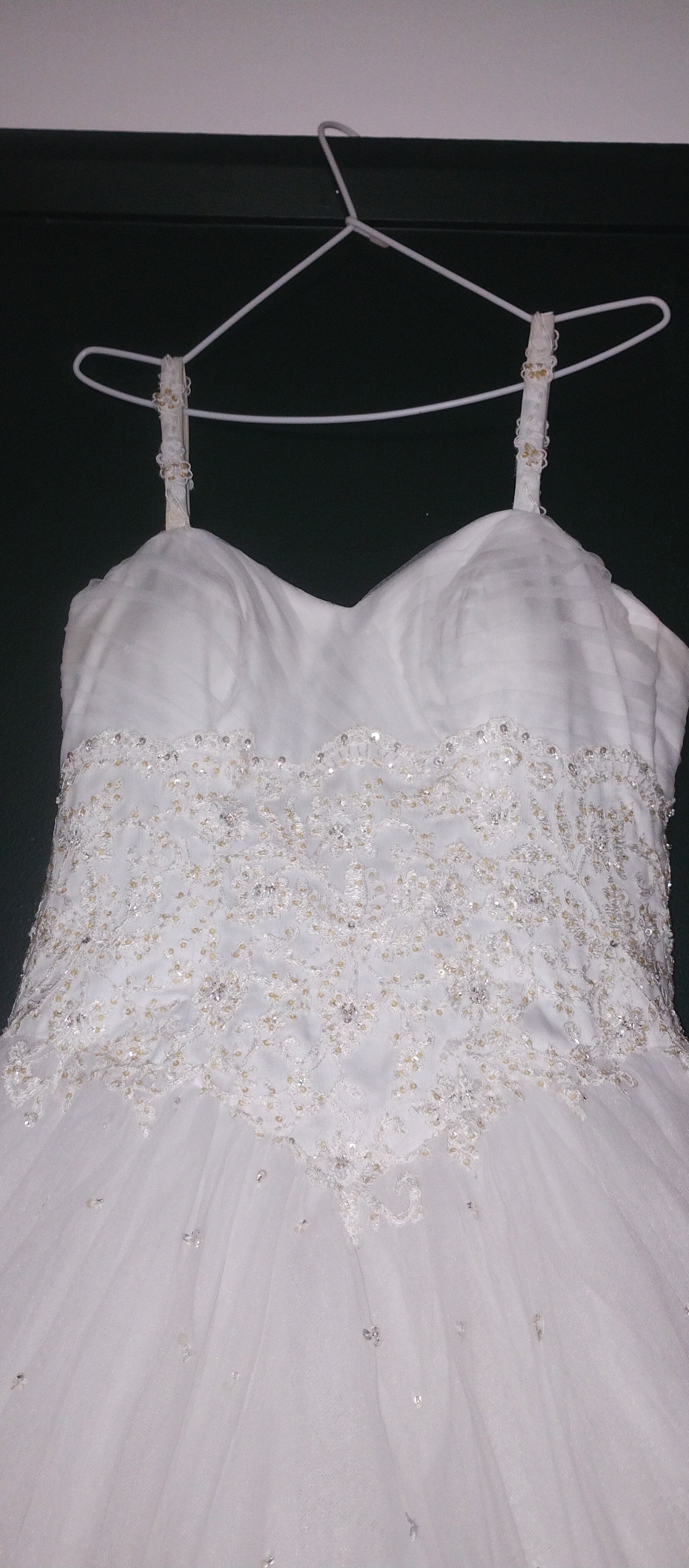 Breathtaking white classic princess dress. Narrow straps, with beaded detail. sweetheart neckline. Soft pleated tulle across bust, around whole bodice. Corset back. Delicate bead under bust and over the rest of bodice, spilling over the waistline onto the full tulle skirt. The skirt is very full and multilayered. Little clusters of sequins scattered over the skirt catch the light.