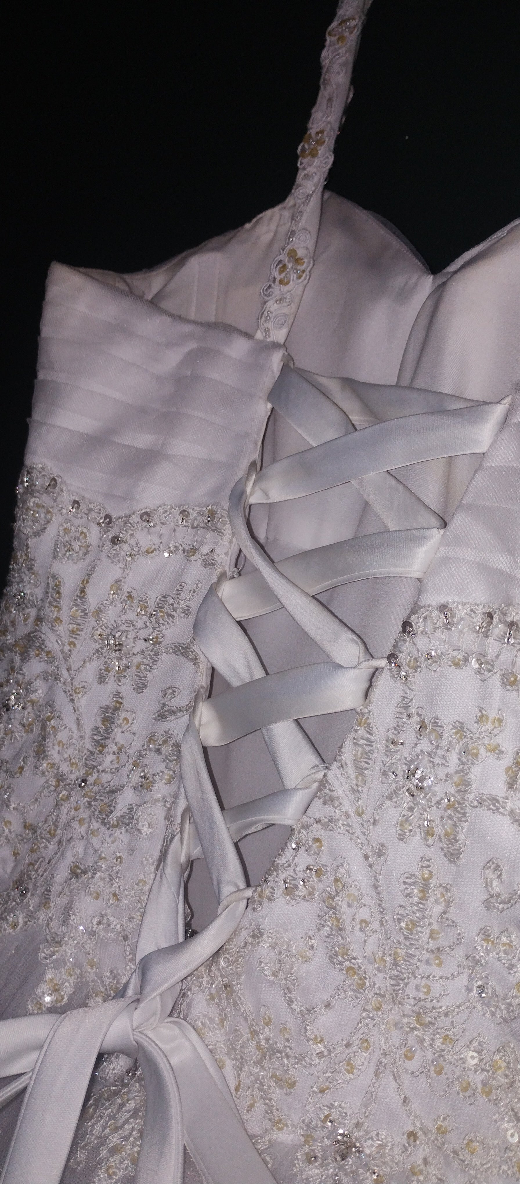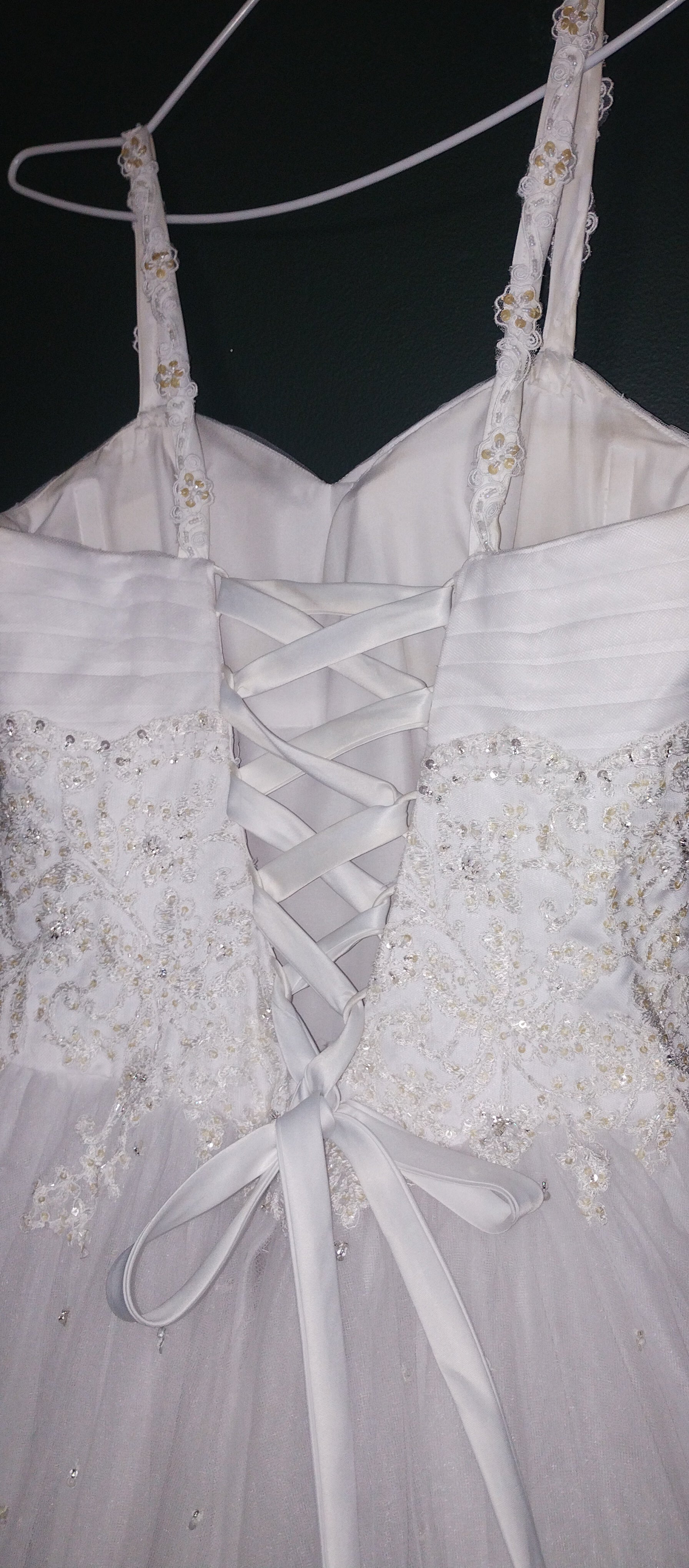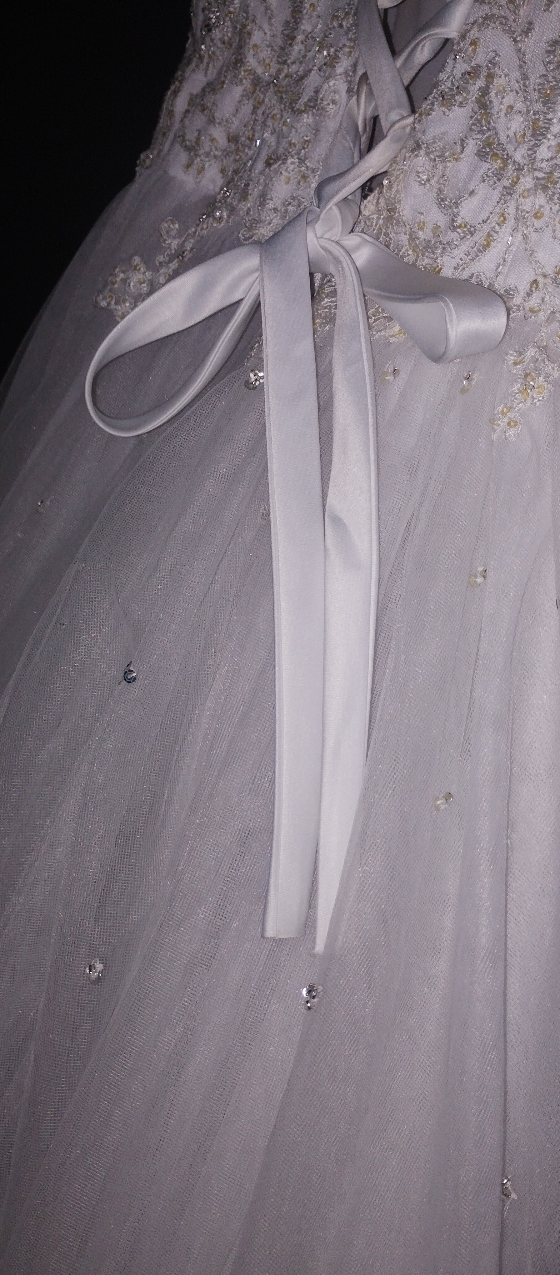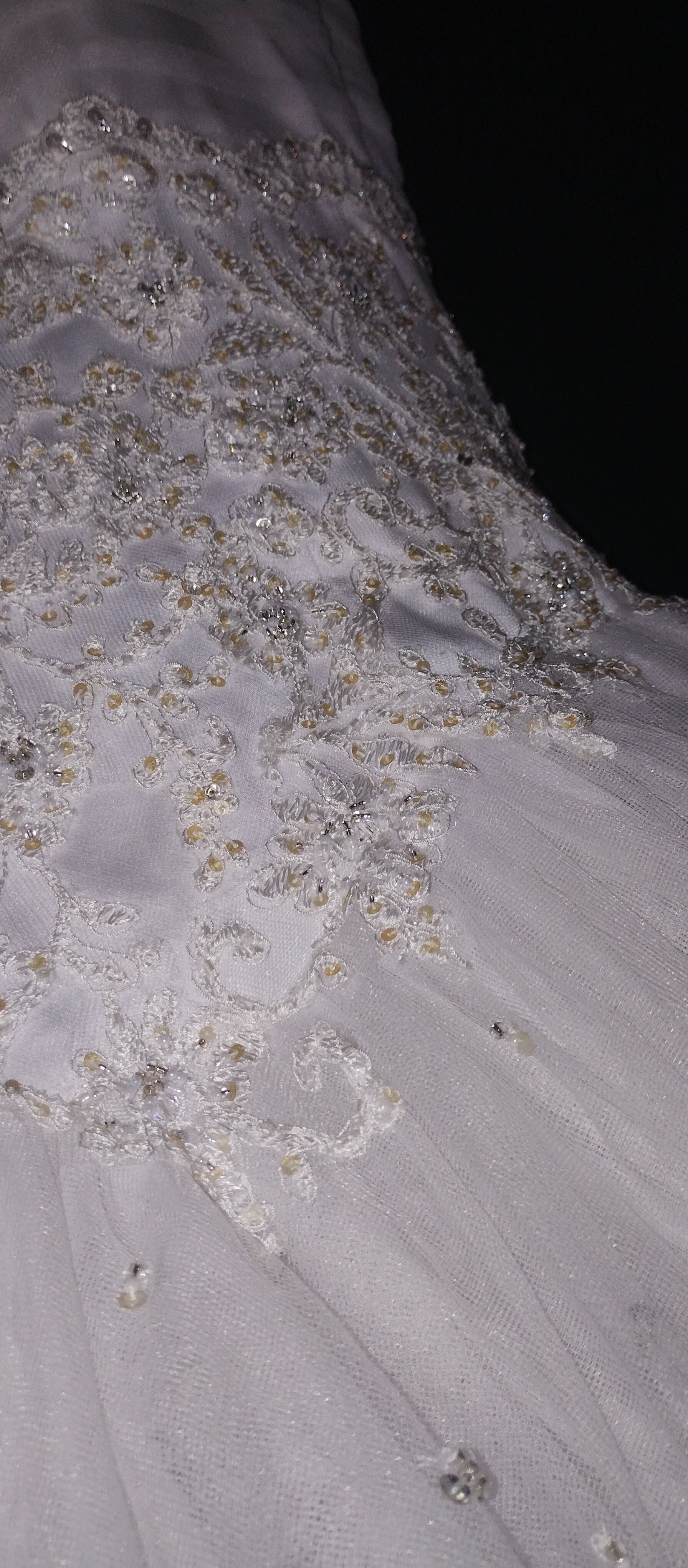 Breathtaking white classic princess dress. Narrow straps, with beaded detail. sweetheart neckline. Soft pleated tulle across bust, around whole bodice. Corset back. Delicate bead under bust and over the rest of bodice, spilling over the waistline onto the full tulle skirt. The skirt is very full and multilayered. Little clusters of sequins scattered over the skirt catch the light.