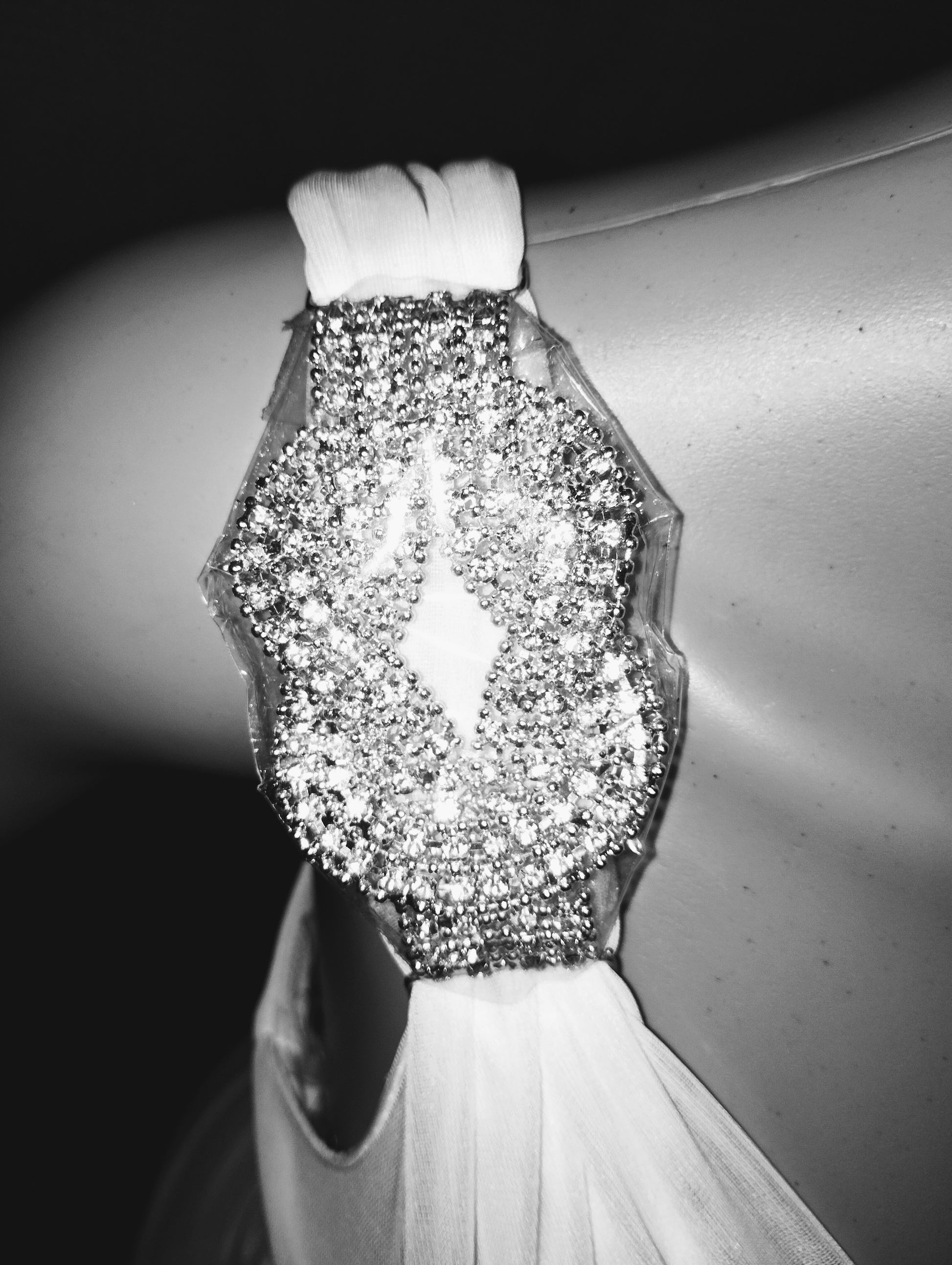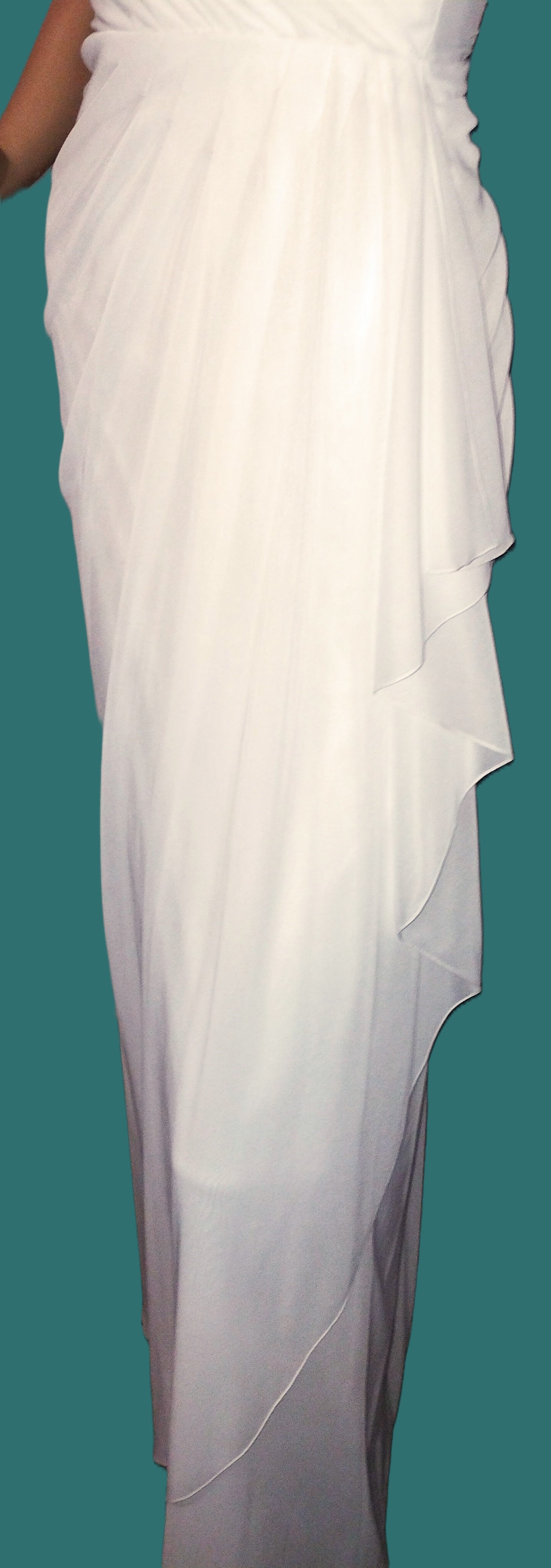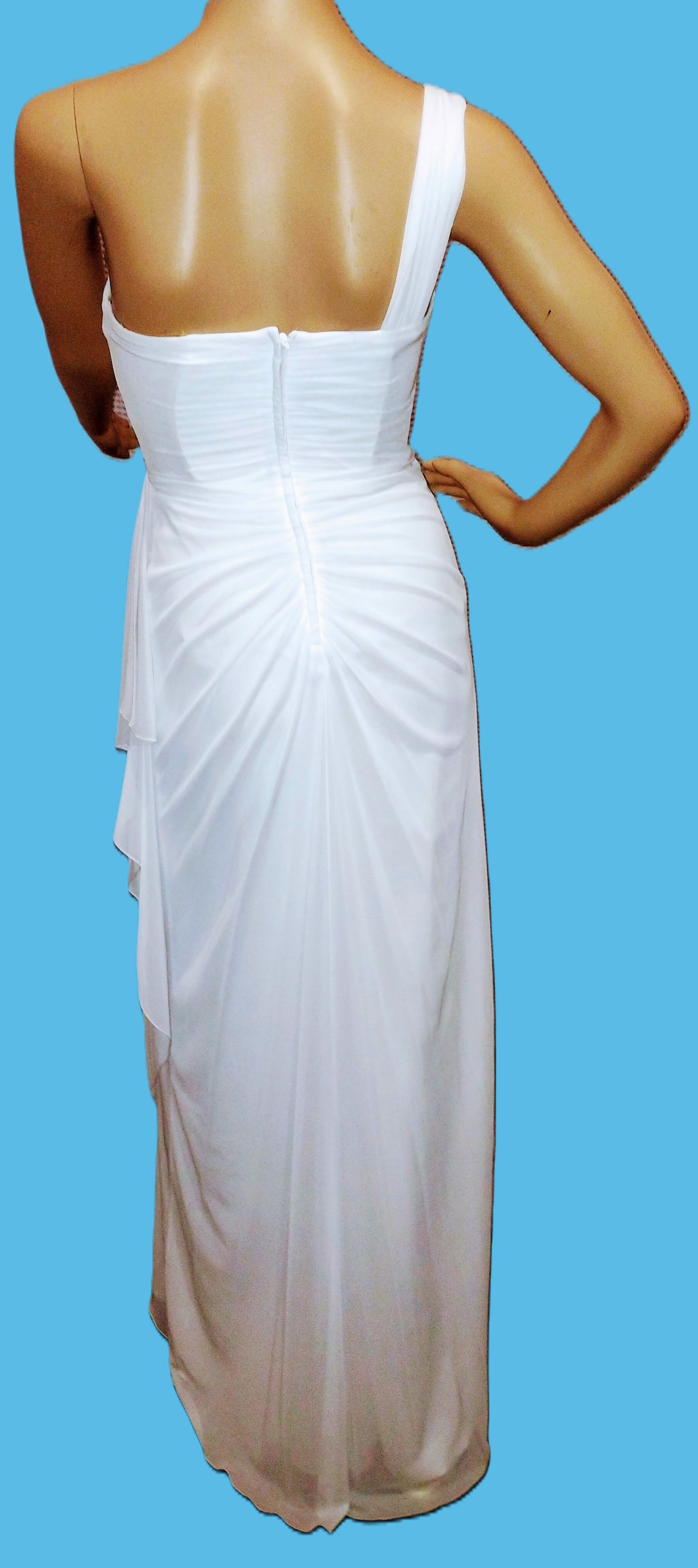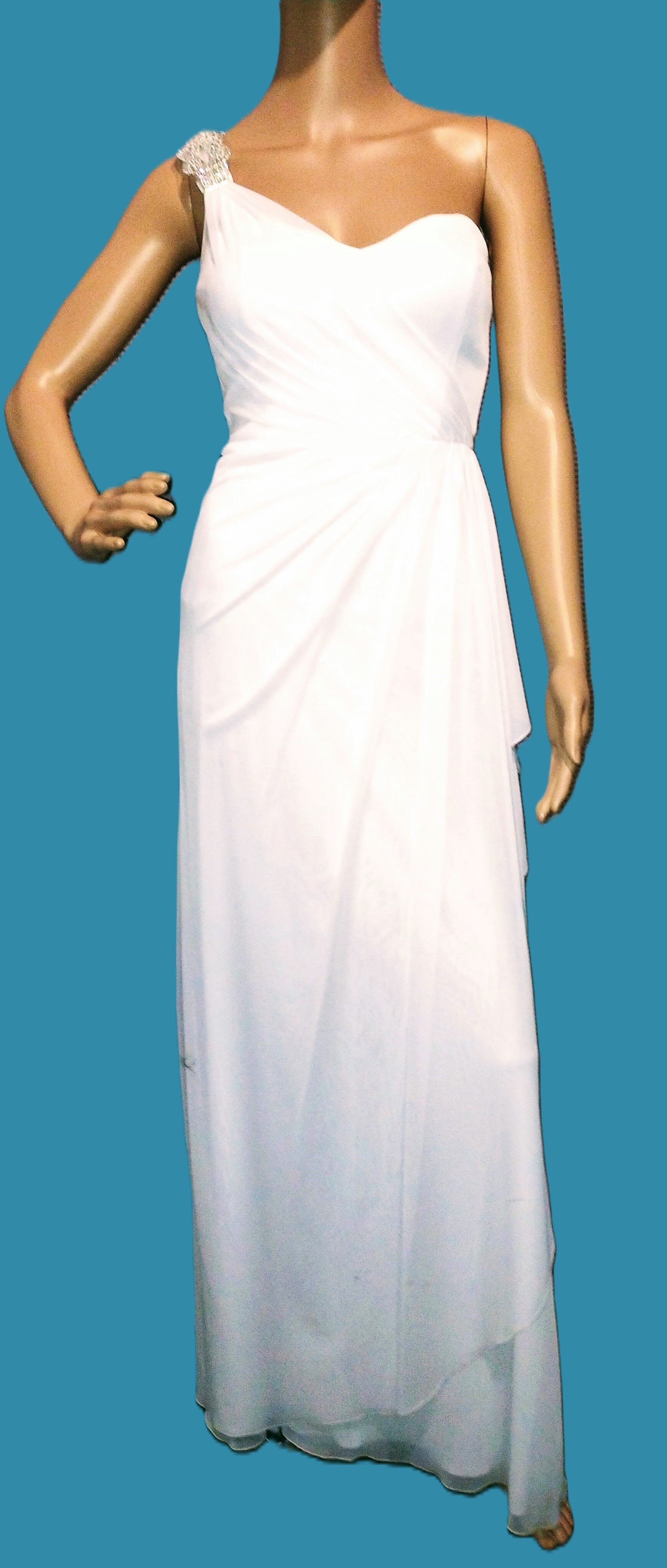 White Sweetheart bodice with one shoulder strap embellished with a diamante clasp. draped overskirt swept to side waist. subtle ruching down centre back at hip .
