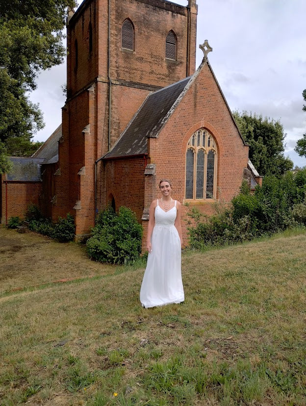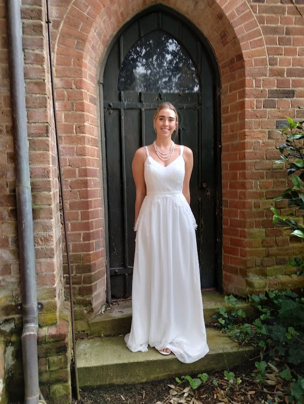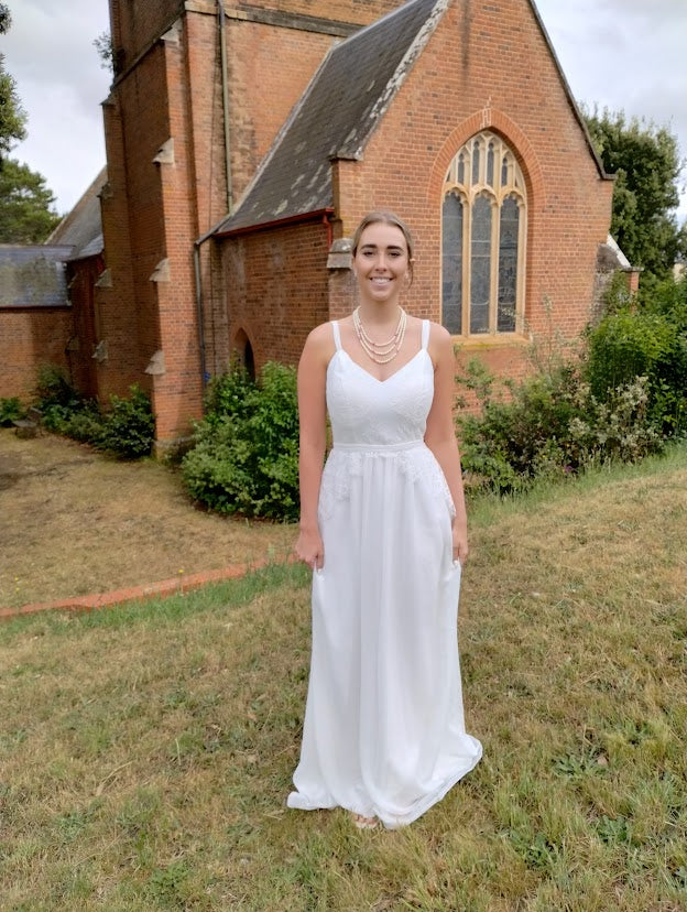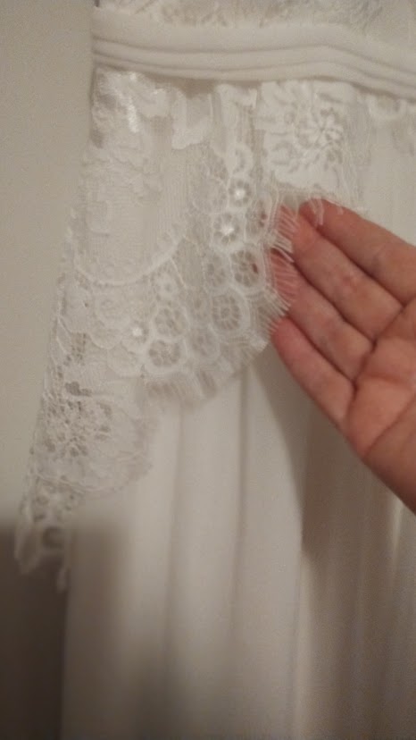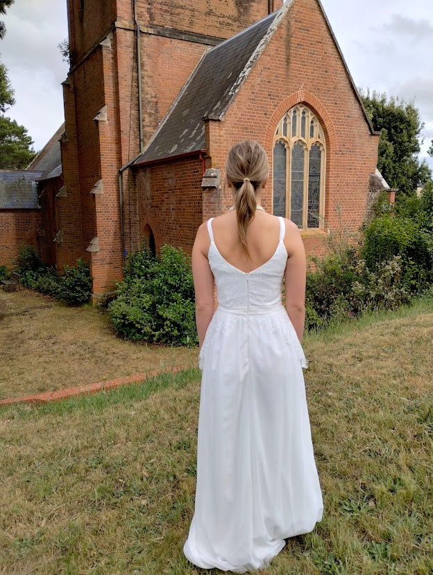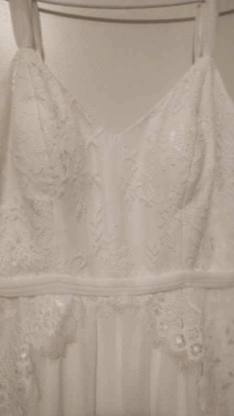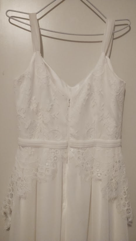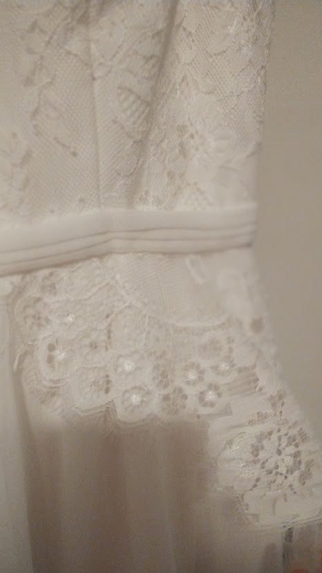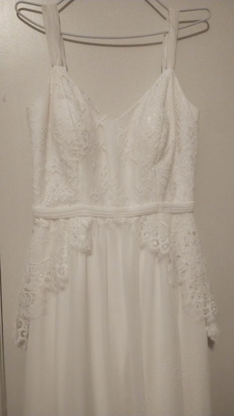 Lovely feminine full length dress. Sweetheart neckline. straps. fitted lace bodice, with lace descending to soft peplums.