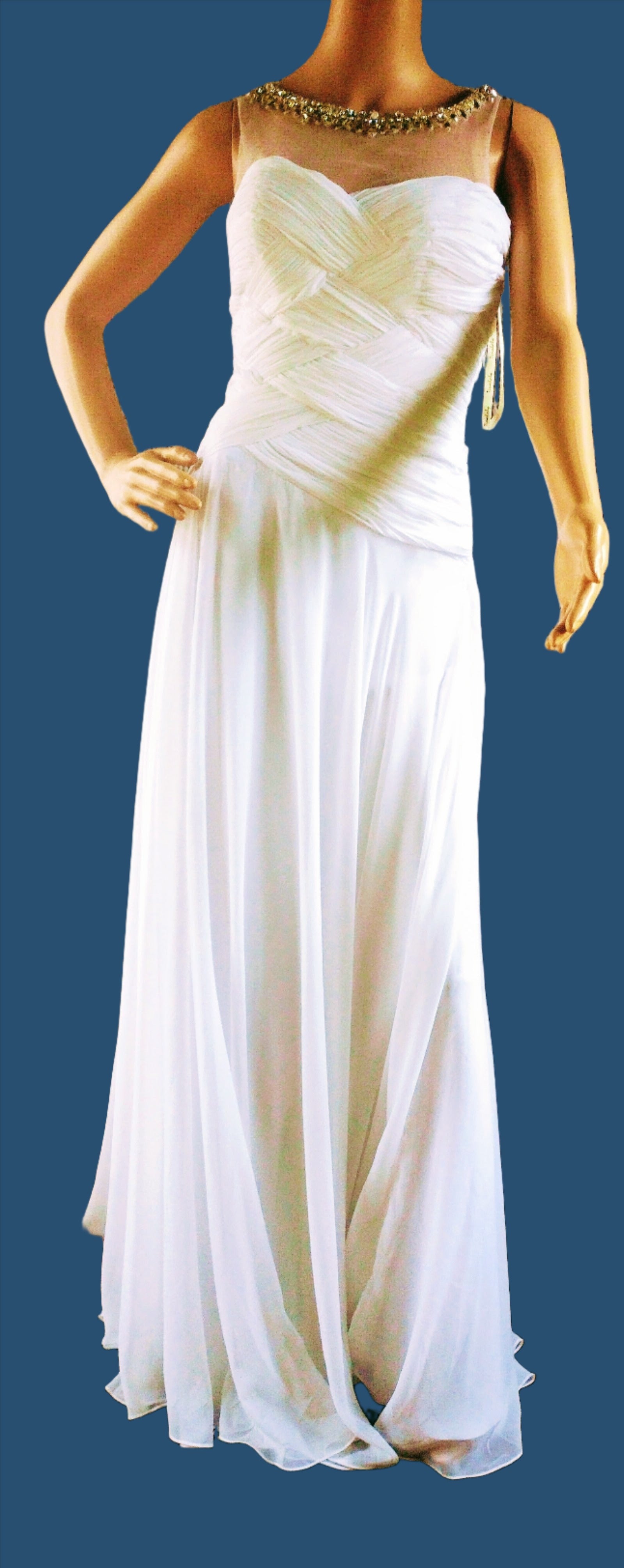 Illusion neckline embellished with crystal and beading continuing down backstraps. sweetheart bodice, draped and crossed over to below waist. long flowy skirt.